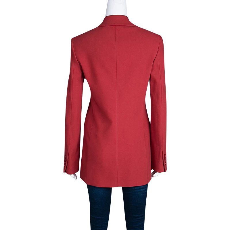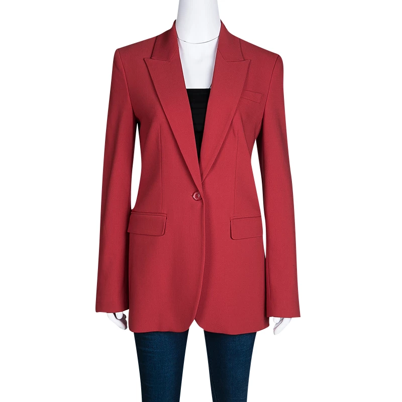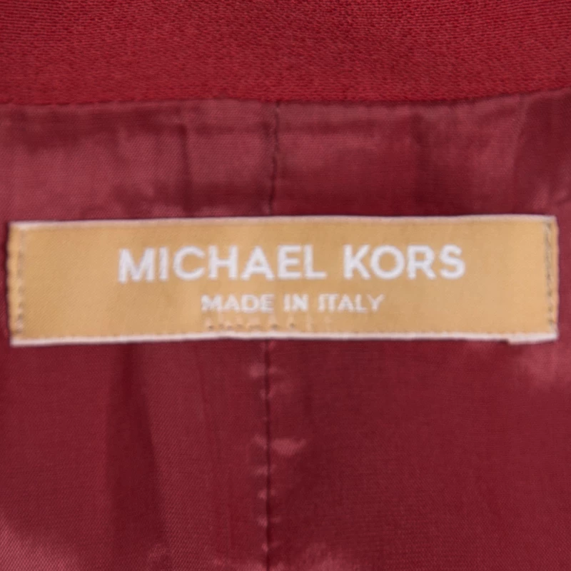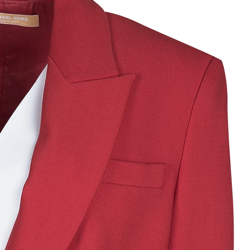 Designed to complement the on-the-go lifestyle of modern women, this Michael Kors blazer in crimson red color can be worn with various outfits. Made of wool, it profiles long sleeves, notched lapels, and three external pockets. It has a single button fastening; wear it with a matching skirt for a balanced look.