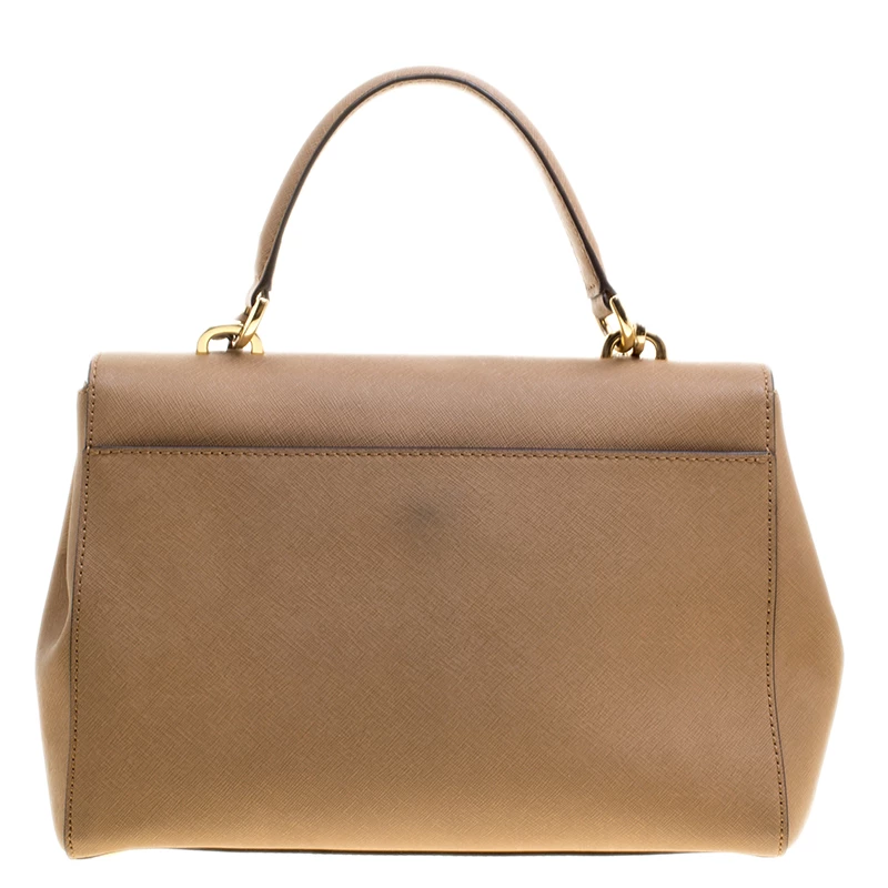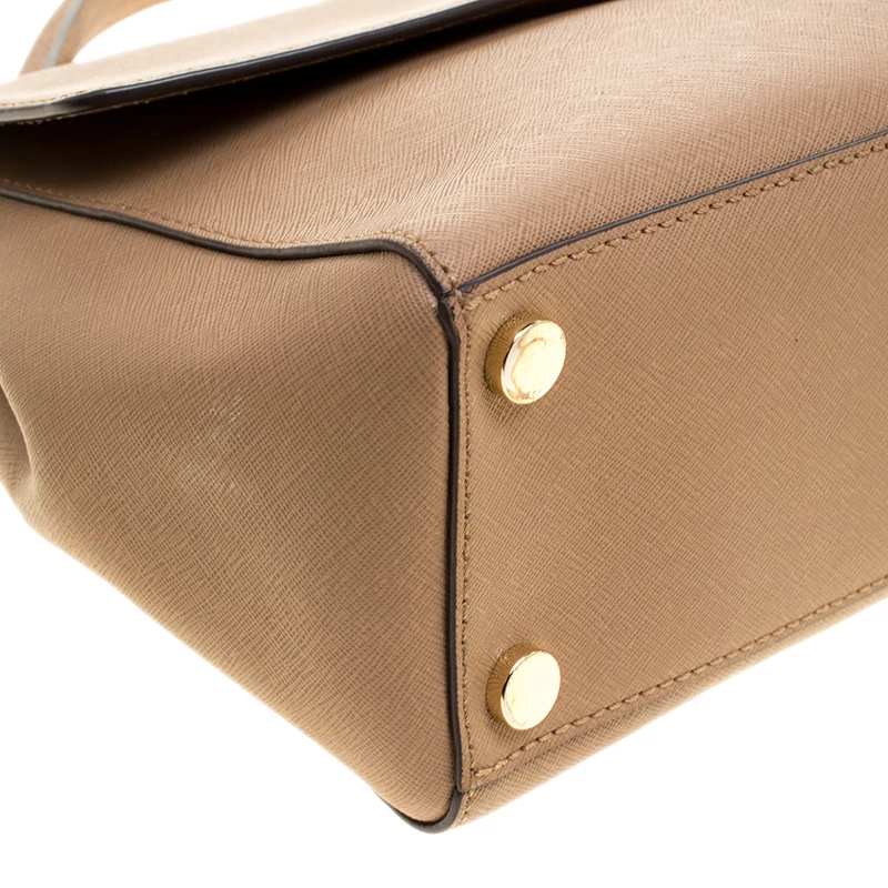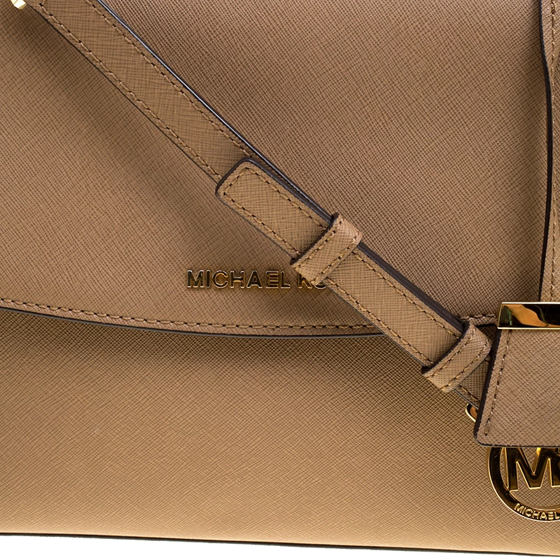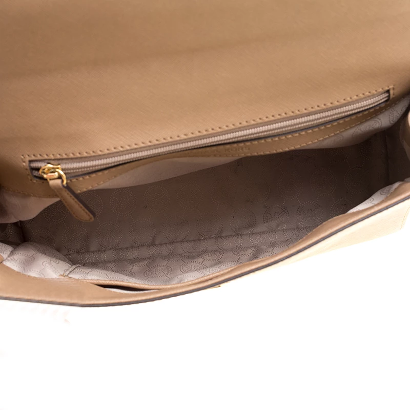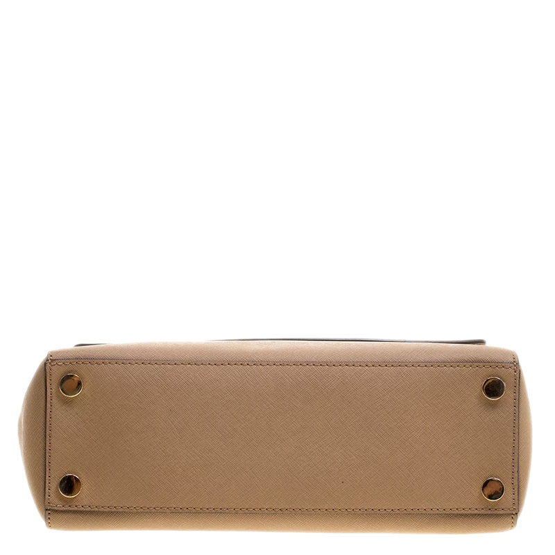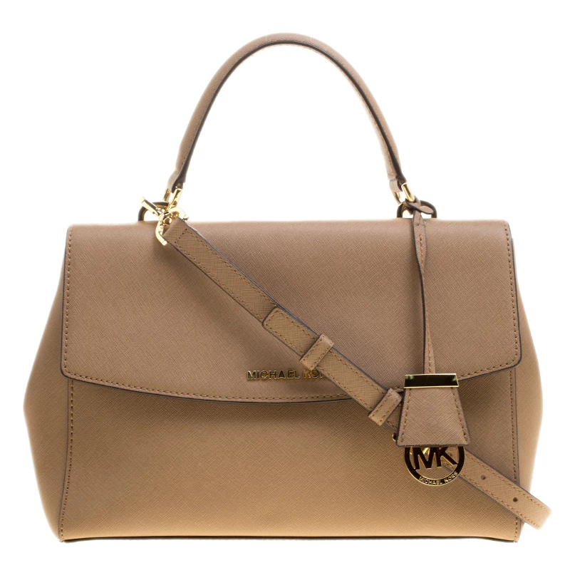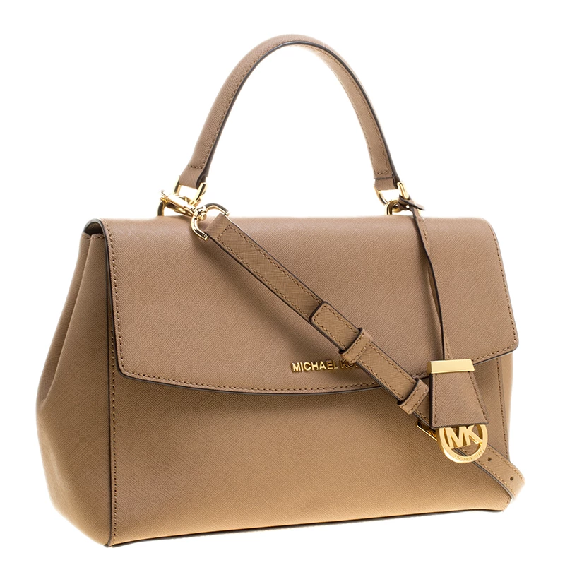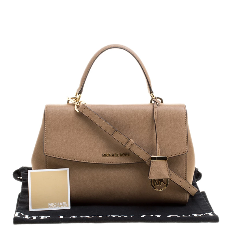 Known for making sleek and sophisticated designs, this Michael Kors Ava satchel comes crafted with Saffiano leather in beige color. It features a leather top handle with an adjustable shoulder strap and a logo charm. The interior is fabric lined and equipped with a slip and a zip pocket.