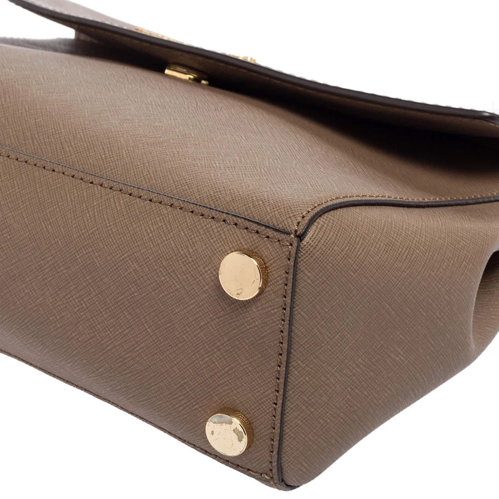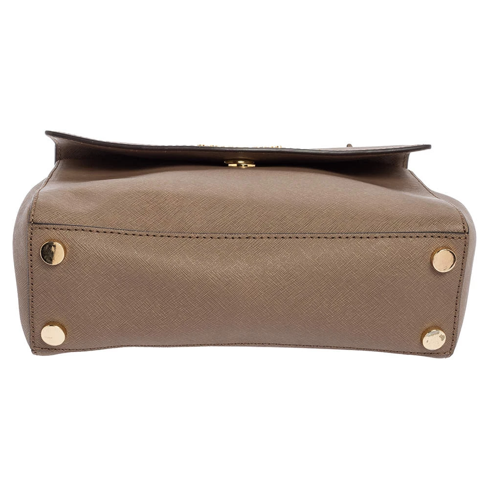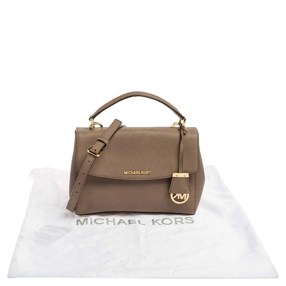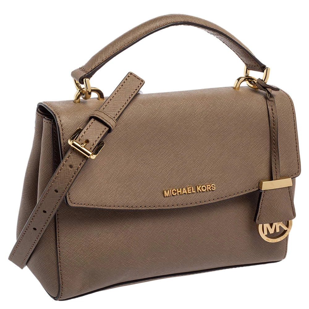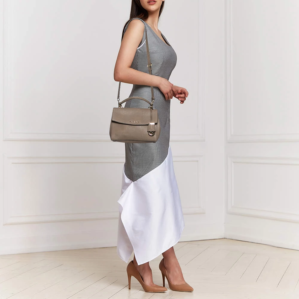 This dark beige bag comes from the fashion house of Michael Kors. Crafted from Saffiano leather, it has a nylon interior that ensures to house your everyday essentials effortlessly. The MK Ava top handle bag is complete with the brand name on the flap.