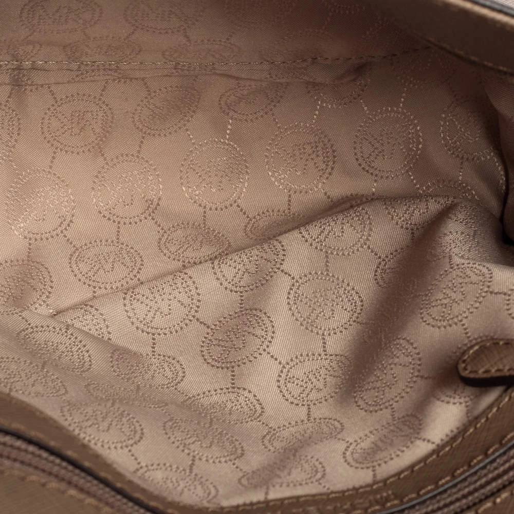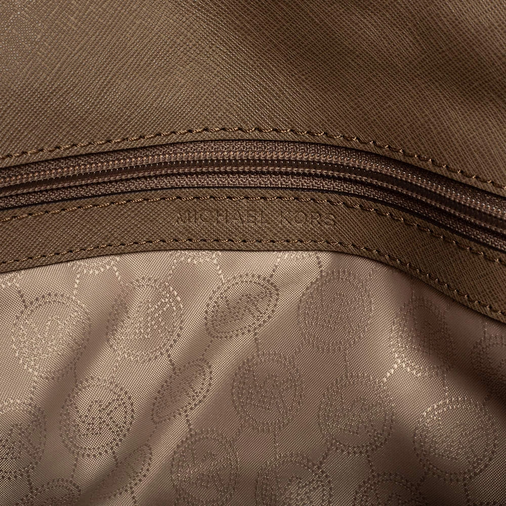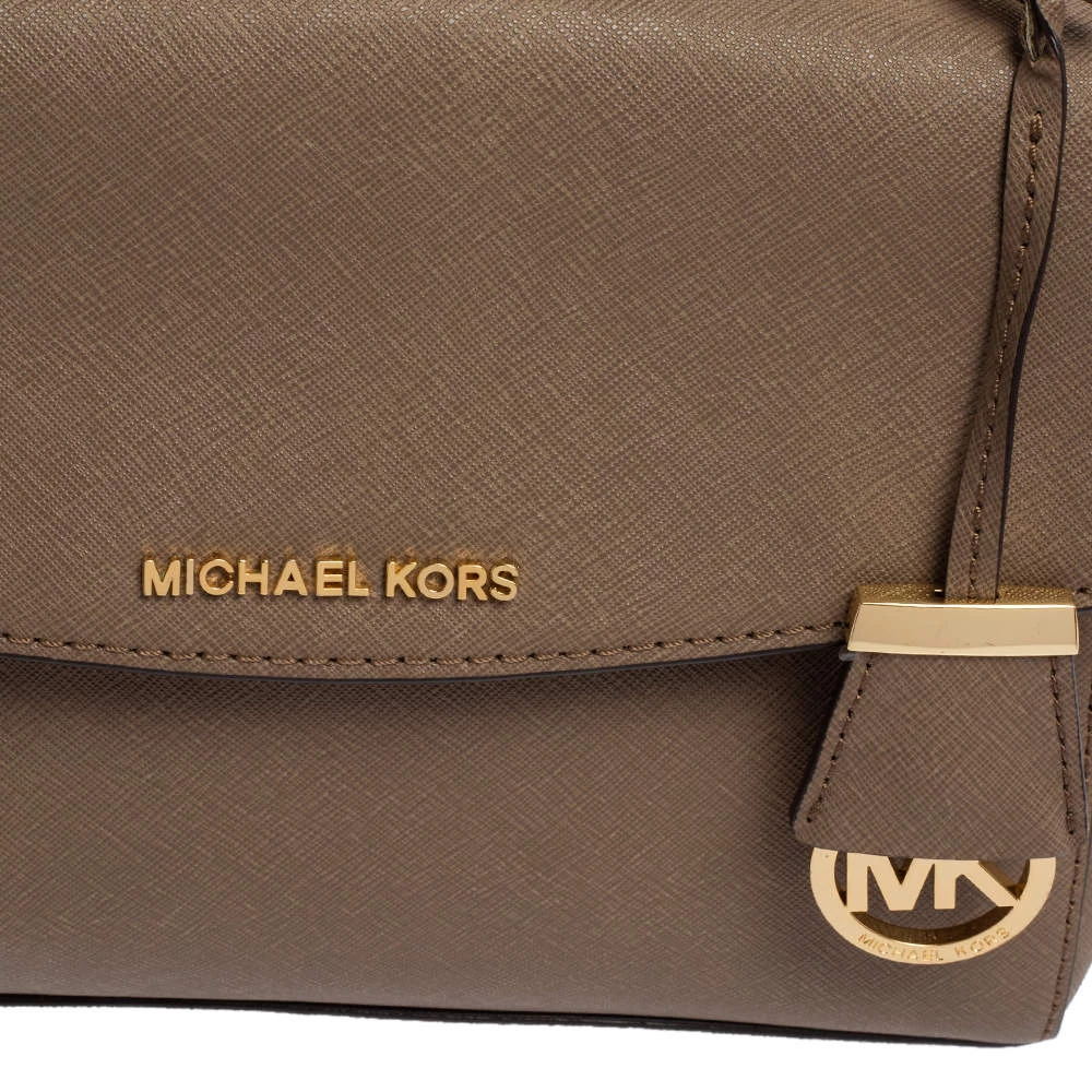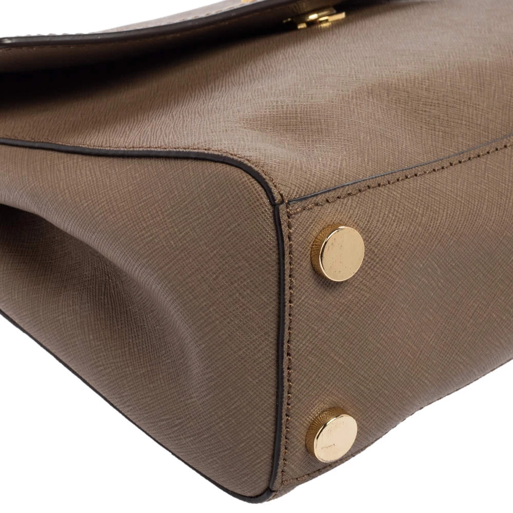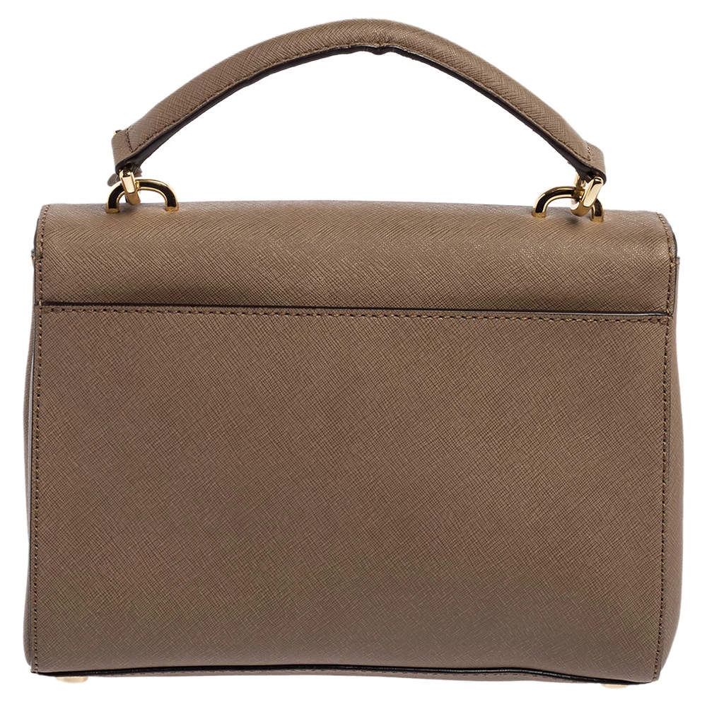 This dark beige bag comes from the fashion house of Michael Kors. Crafted from Saffiano leather, it has a nylon interior that ensures to house your everyday essentials effortlessly. The MK Ava top handle bag is complete with the brand name on the flap.