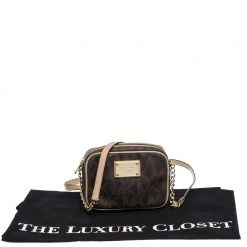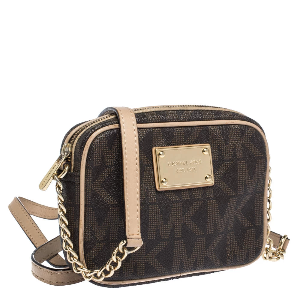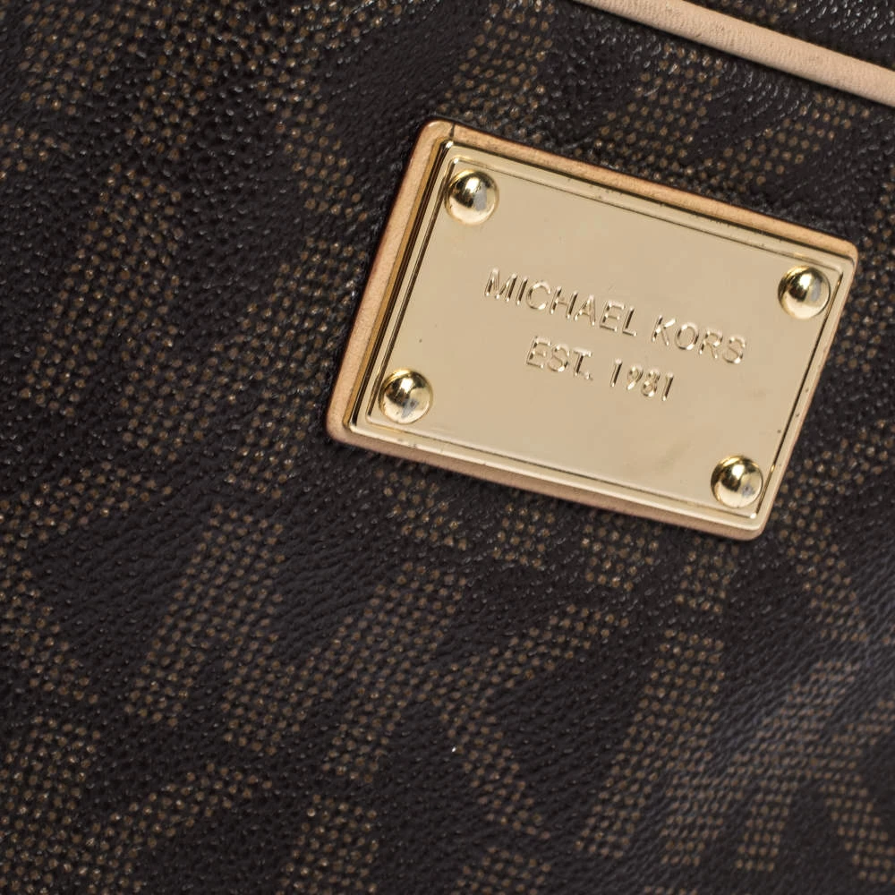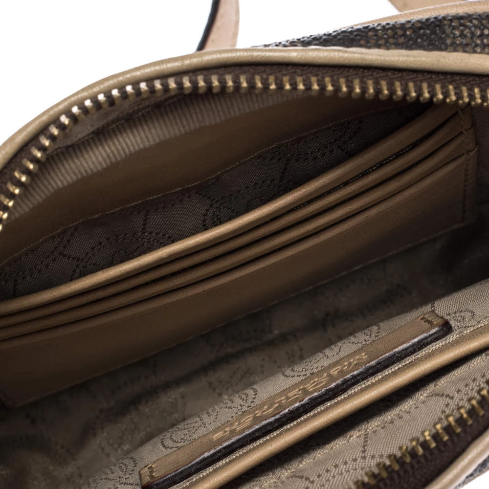 Renowned for its exclusive craftsmanship, this Michael Kors handbag will live up to your expectations. Crafted from signature canvas and leather, it comes in dark brown & beige hues. It features a nylon interior equipped to house your essentials. It comes with a long strap, while the front features the brand plaque in gold-tone.