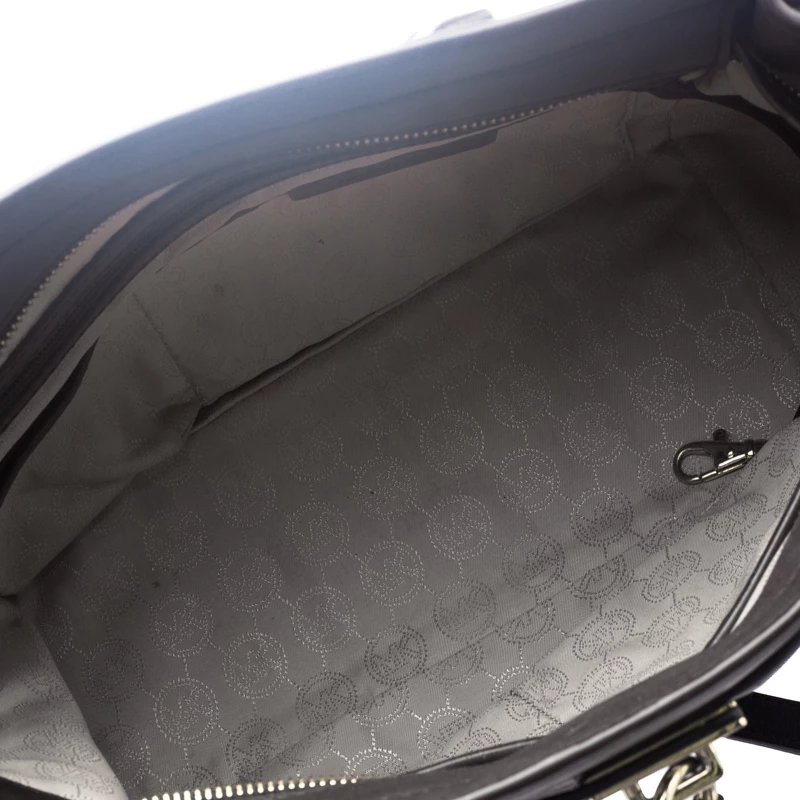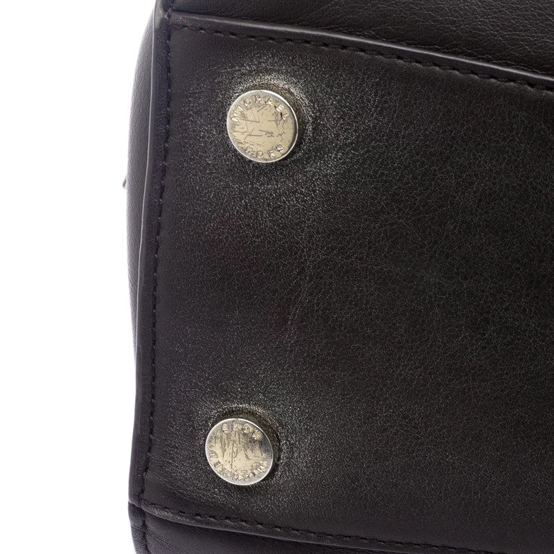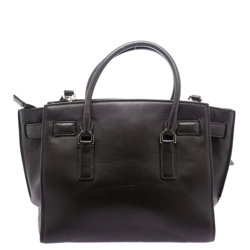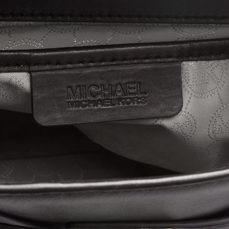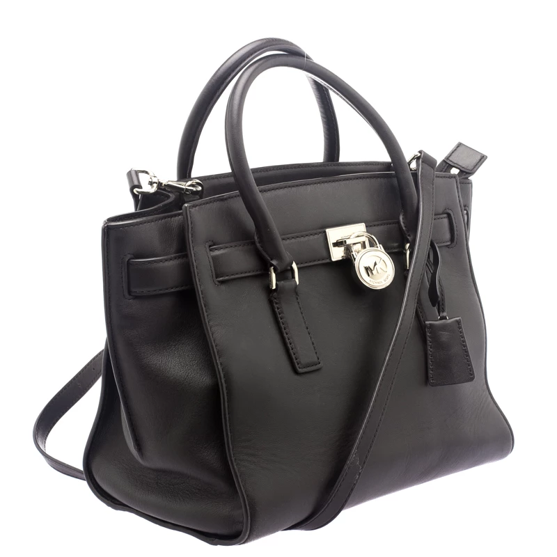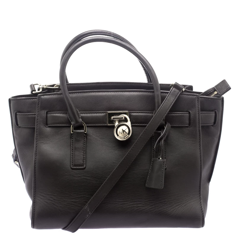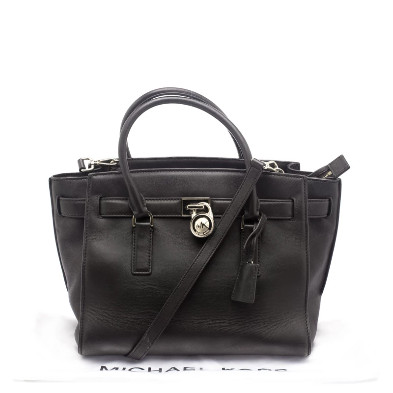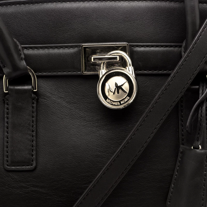 This elegant Hamilton satchel from Michael Kors will make a standout addition to your collection. The bag features dual top handles, a shoulder strap, protective metal feet, a Michael Kors lock and a dark brown leather exterior. It has a spacious fabric lined interior that can easily hold your daily essentials.