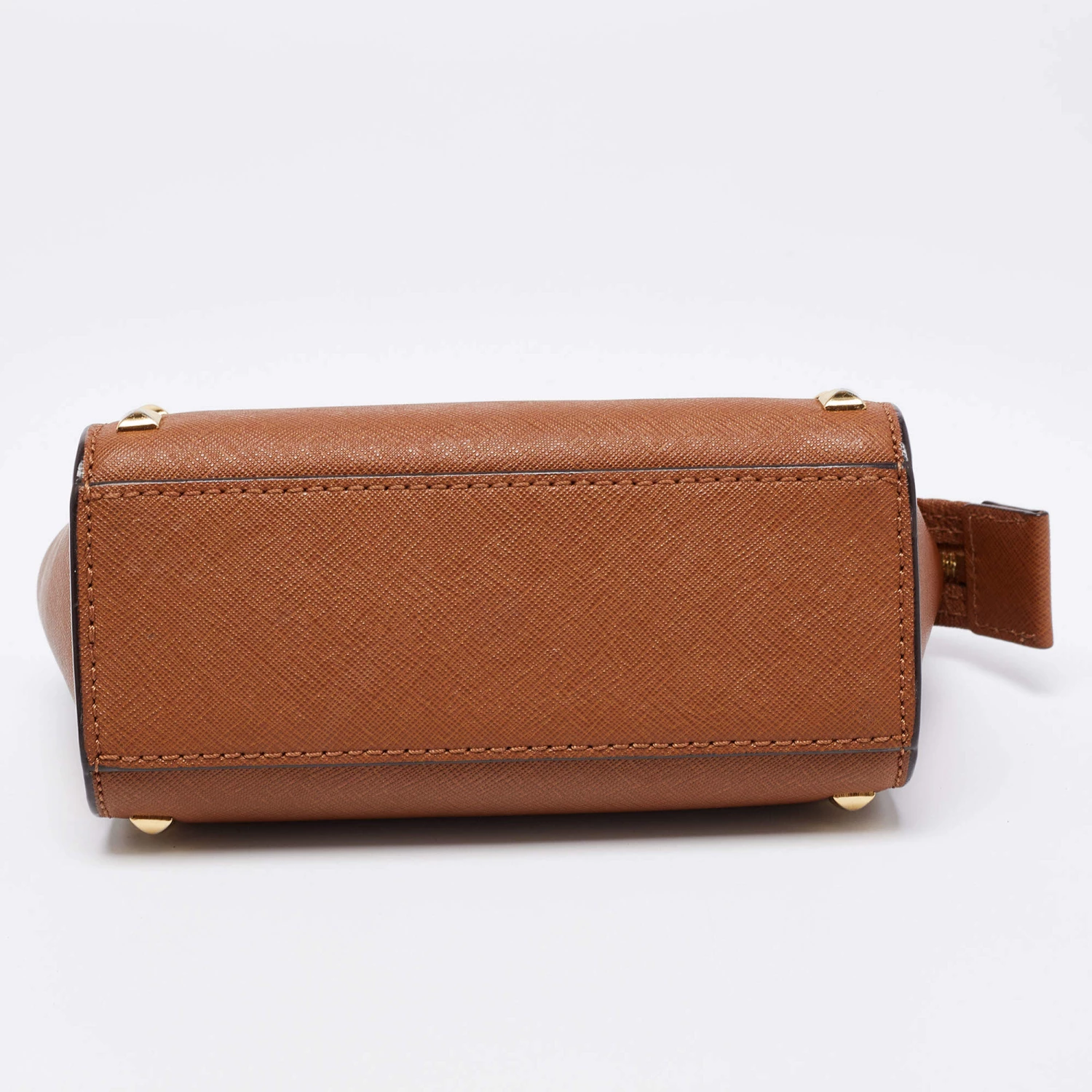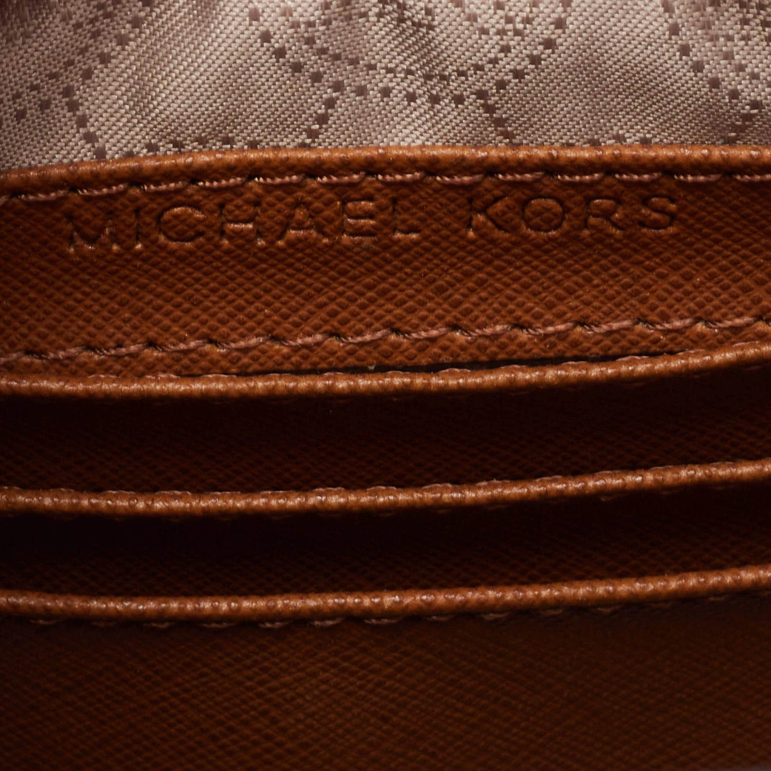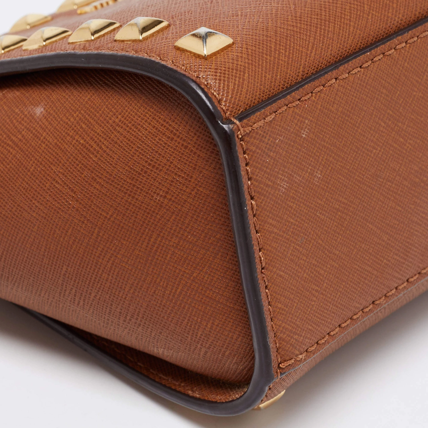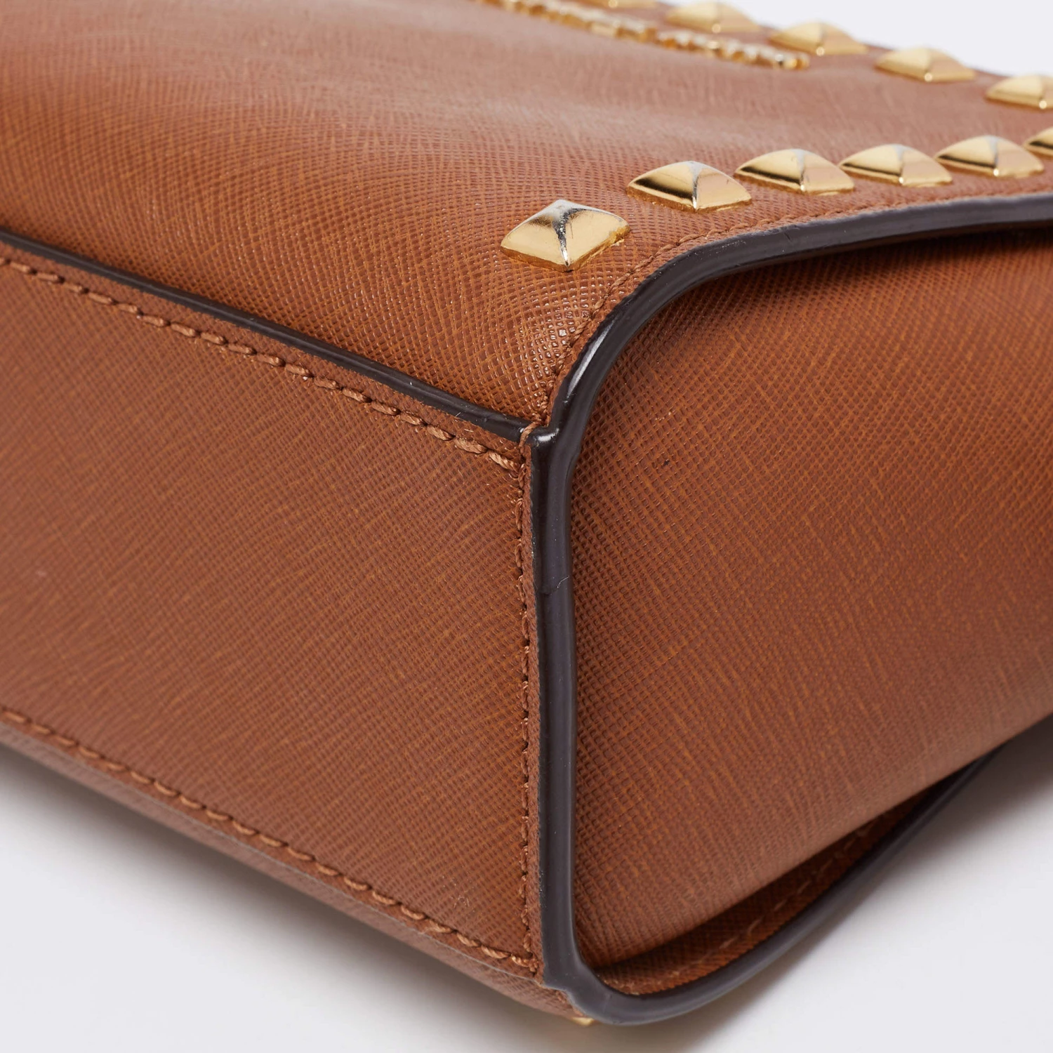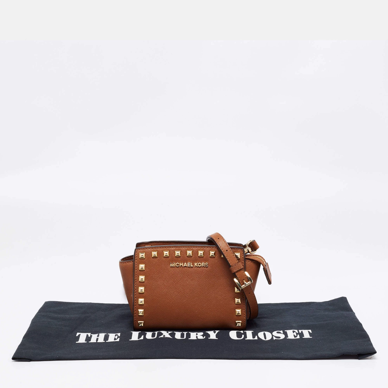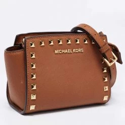 The gold-tone studs beautifully outline the dark brown exterior of this Michael Kors bag. Created from leather, it has been styled with a shoulder strap, a brand signature on the front, and a fabric-lined interior.