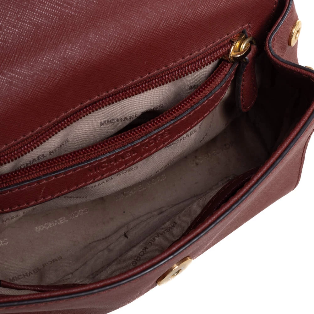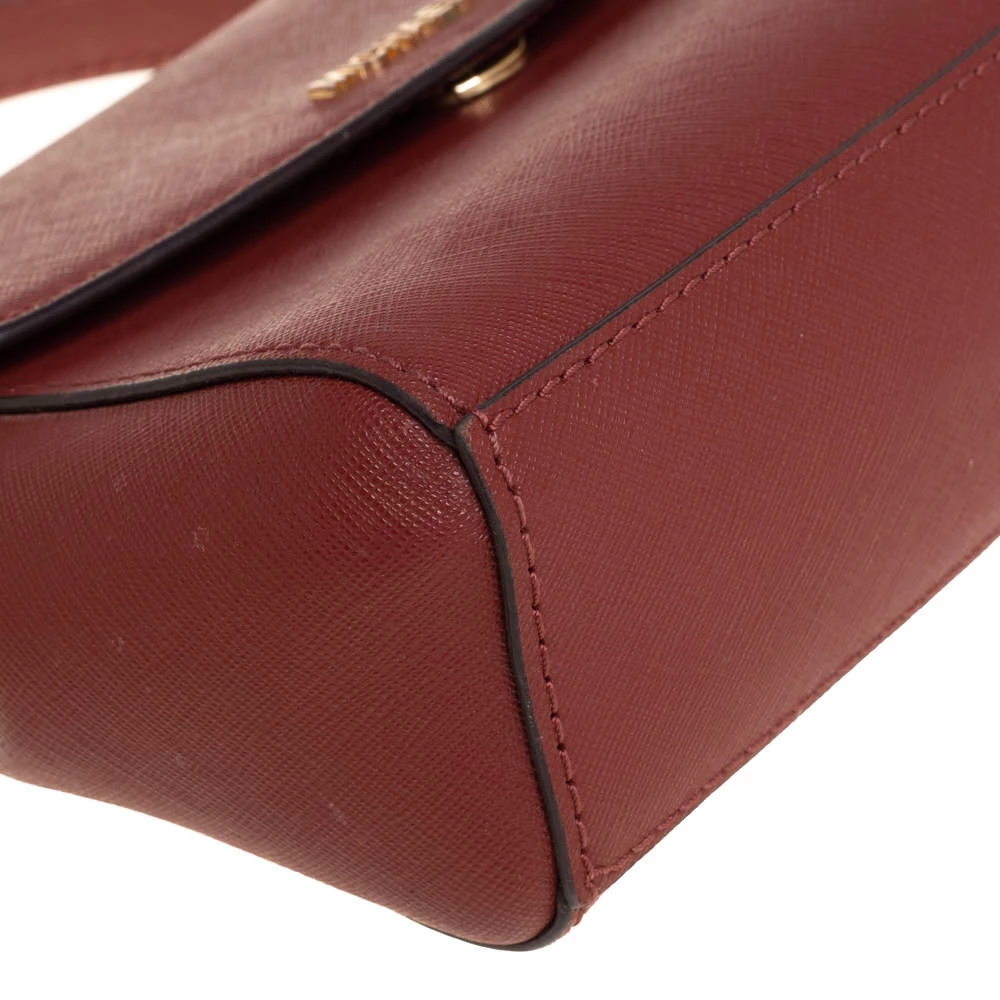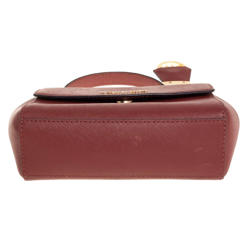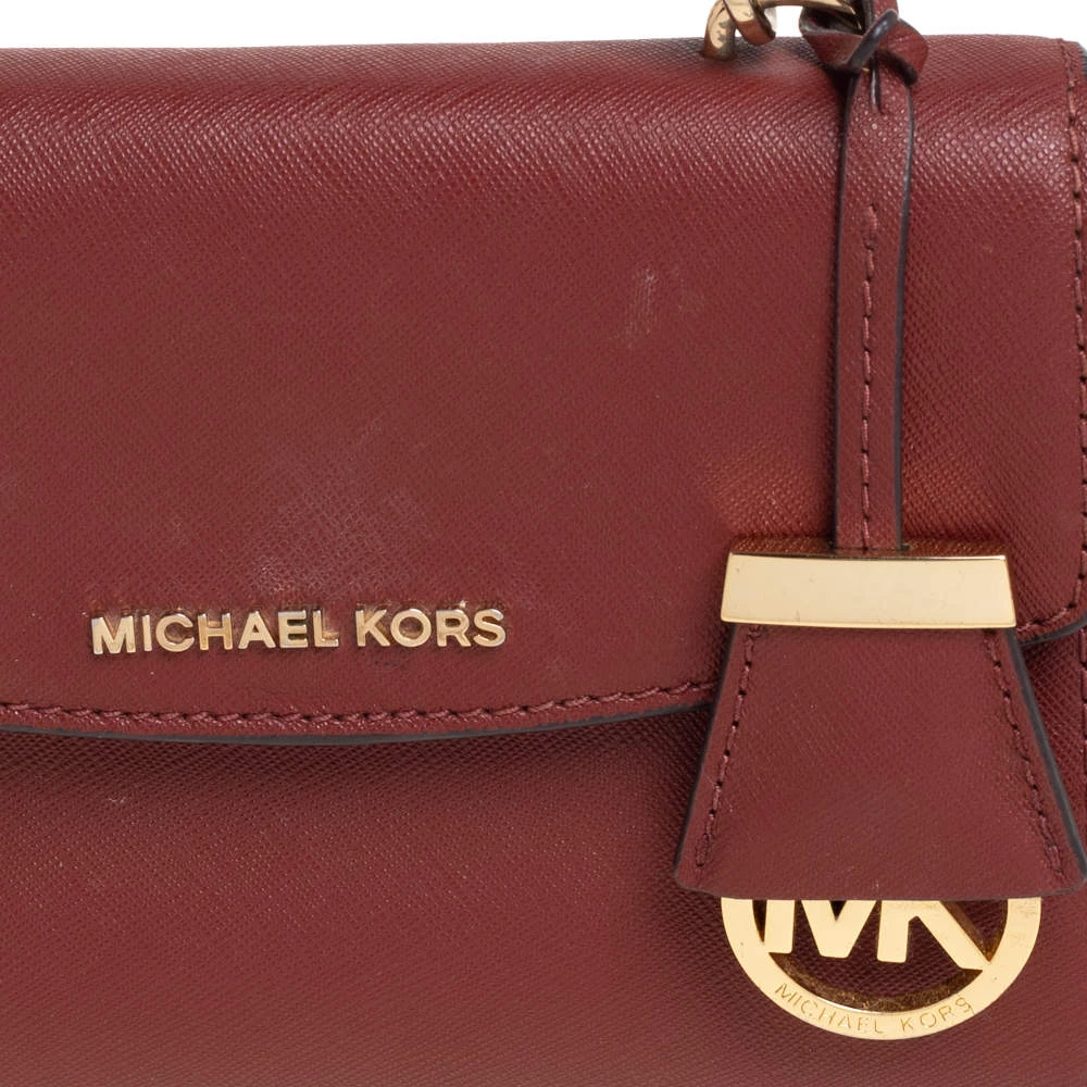 This dark red-colored bag comes from the fashion house of Michael Kors. Crafted from leather, it features a durable nylon interior that ensures to house your lipstick, wallet, and other essentials. Designed with a flap closure, it flaunts gold-tone brand logo at the front.