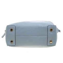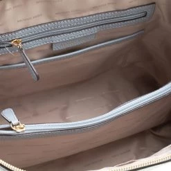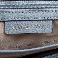 This elegant satchel from Michael Kors will make a standout addition to your collection. Crafted with leather in a breezy blue hue, the bag features dual top handles, an optional shoulder strap, and the signature charm in gold-tone hardware. It has a spacious nylon-lined interior that houses two open compartments divided by a zipped pocket along with a zip and slip pocket on the side. It is complete with protective metal feet at the base.