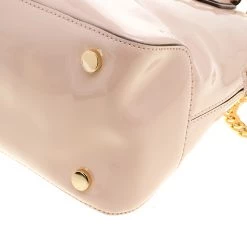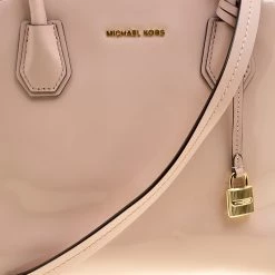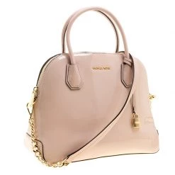 This Mercer satchel from Michael Kors is crafted in the Dome structure from dusty pink patent leather. It’s a covetable accessory equipped with a fabric interior housing multiple pockets. This elegantly timeless piece comes with two top handles and a detachable shoulder strap attached through the gold-tone chain link. Completed with a lock charm, complement your classic ensemble with this bag.