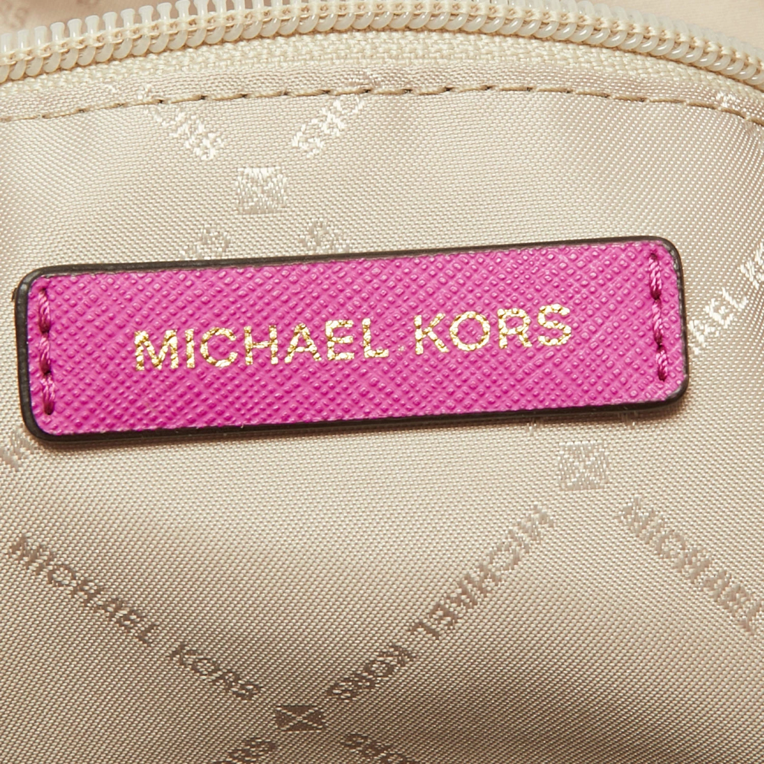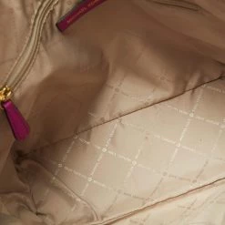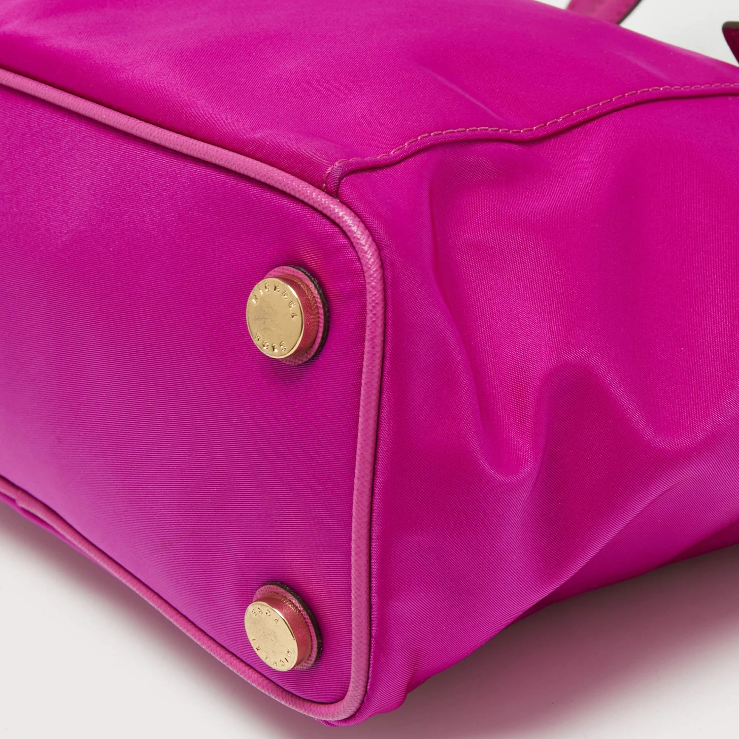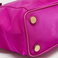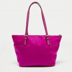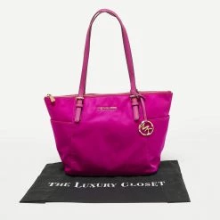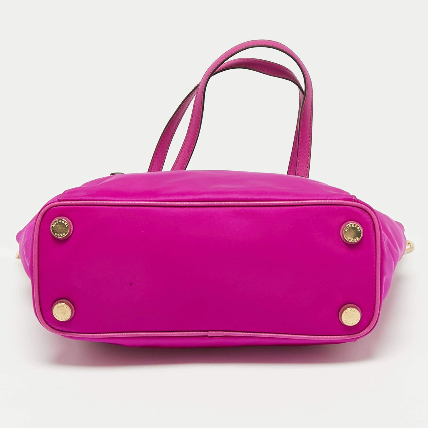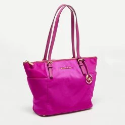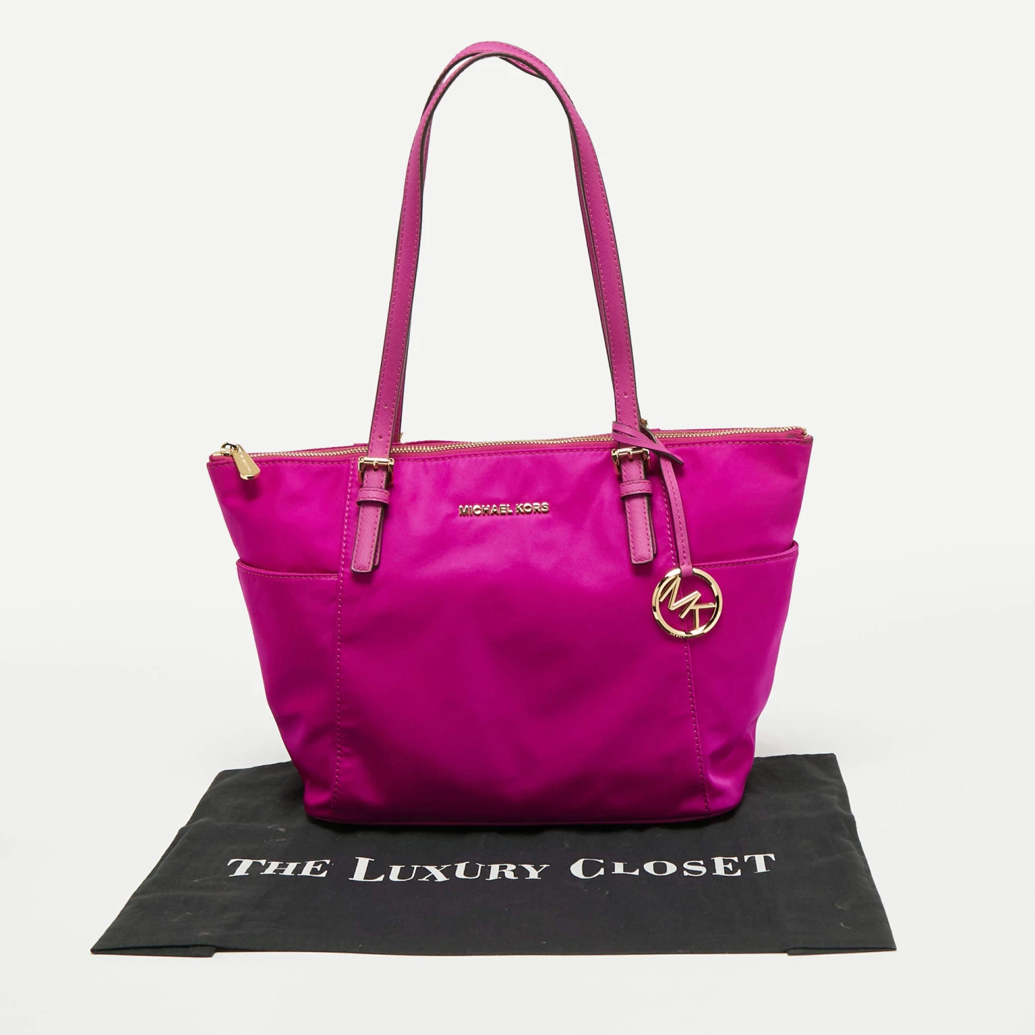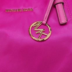 This Jet Set tote from Michael Kors is very classy in appearance and style. It has been created using fuchsia nylon and leather, granting it a luxe look. It shows dual handles, a nylon-lined interior, and gold-toned hardware. Give your essentials an elegant home with this stunning tote.