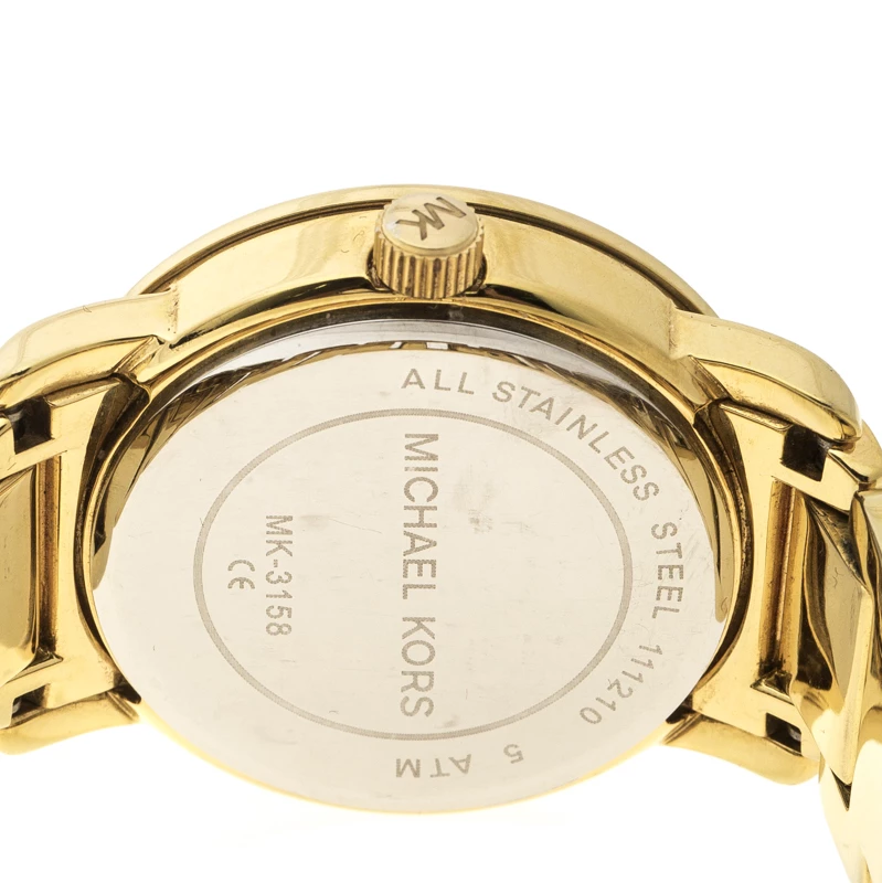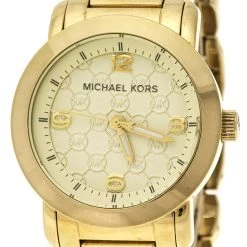 A beautiful Michael Kors watch will always create the most casual chic and subtle statement that is perfect to add to your collection. This MK3158 wristwatch is designed in gold plated stainless steel and features a champagne dial further accented with different hues of gold and brand name emblem all over to complete the look.