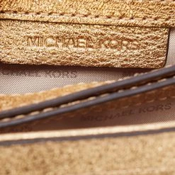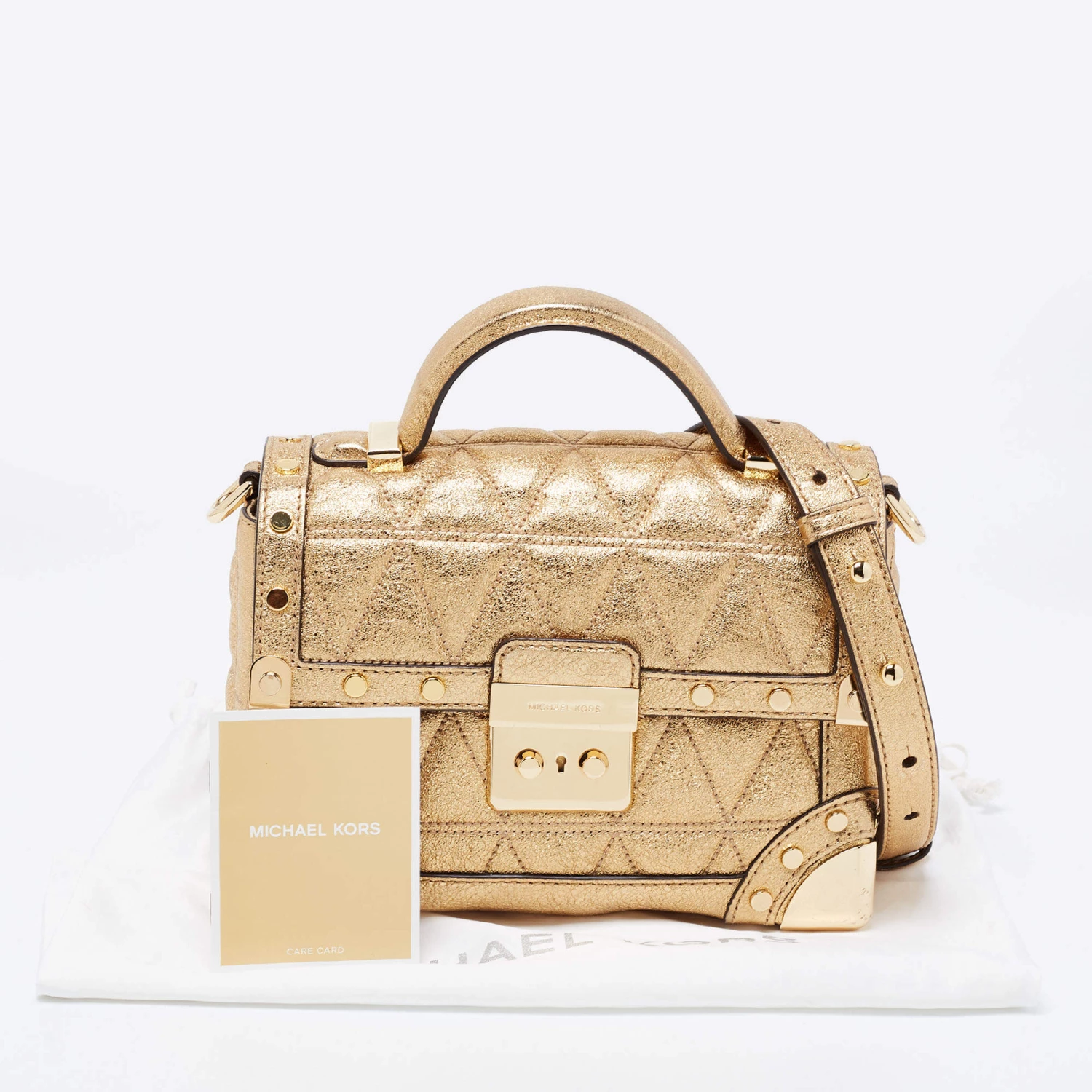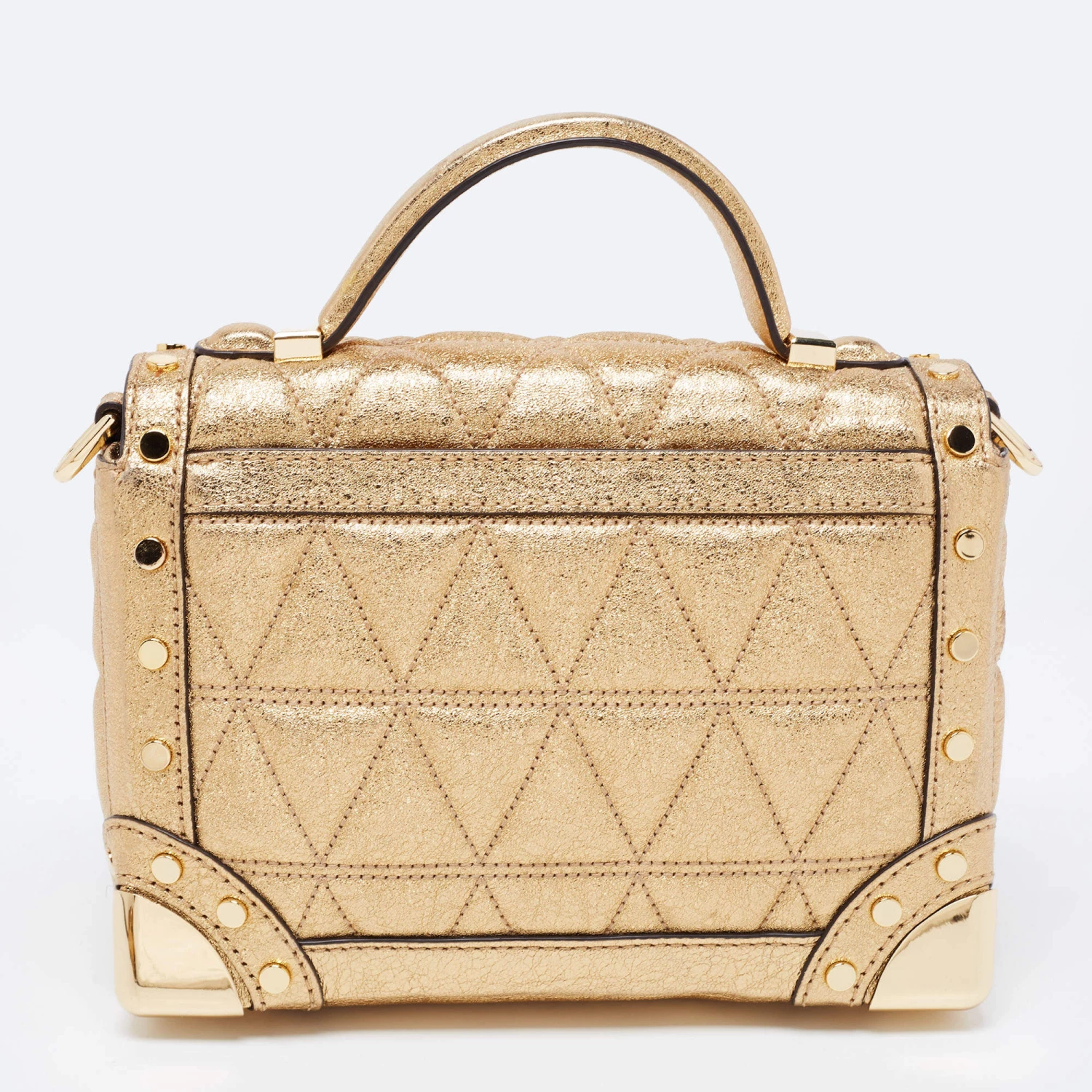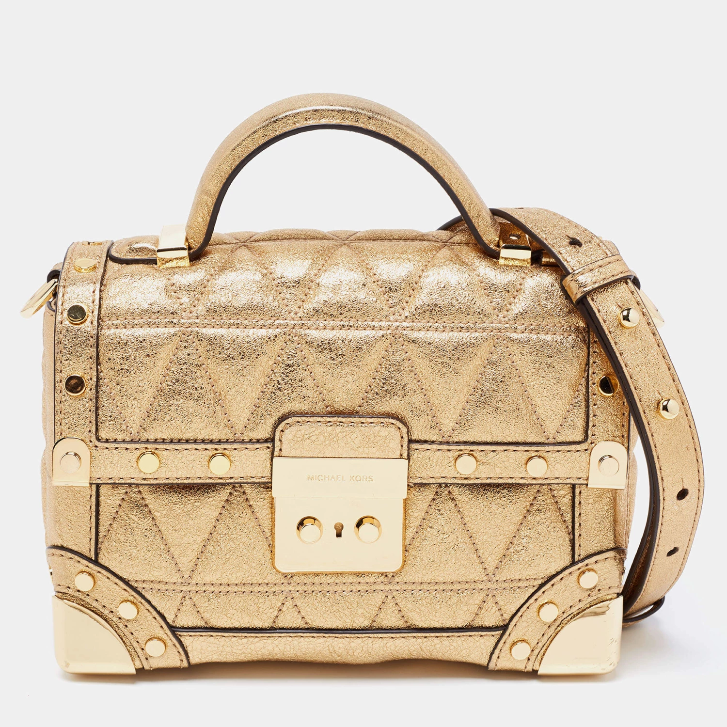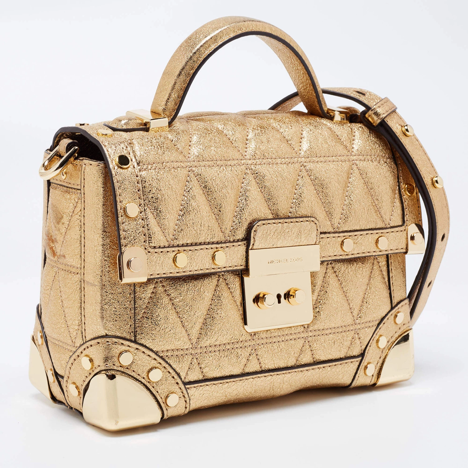 This Cori Trunk handbag by Michael Kors has a structured silhouette in gold leather to create a chic look. The beautifully fashioned bag has a top handle, a shoulder strap, and a flap closure.