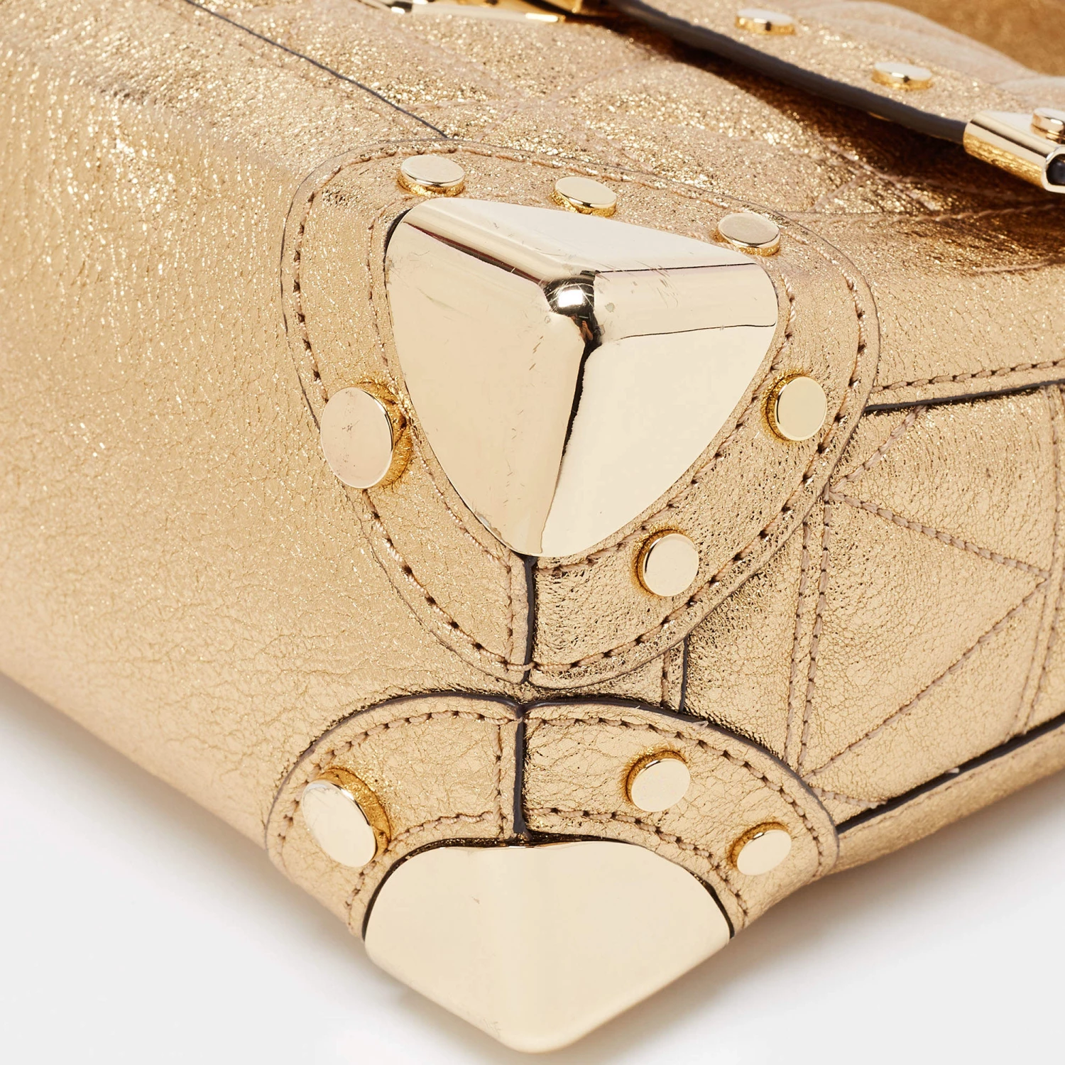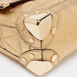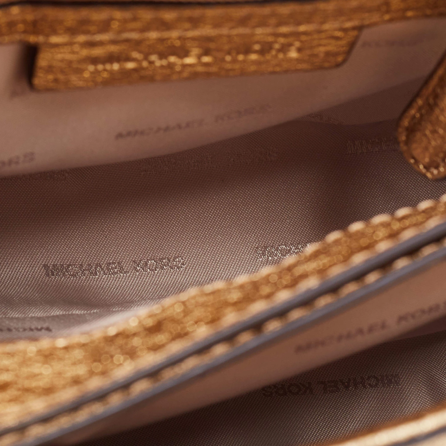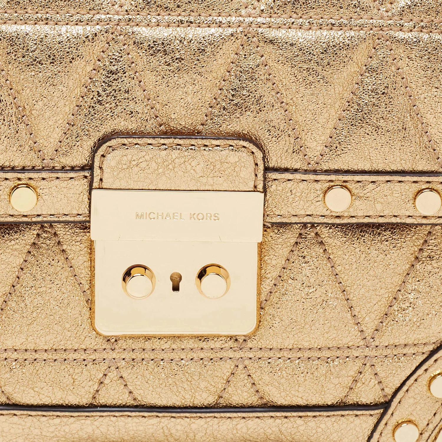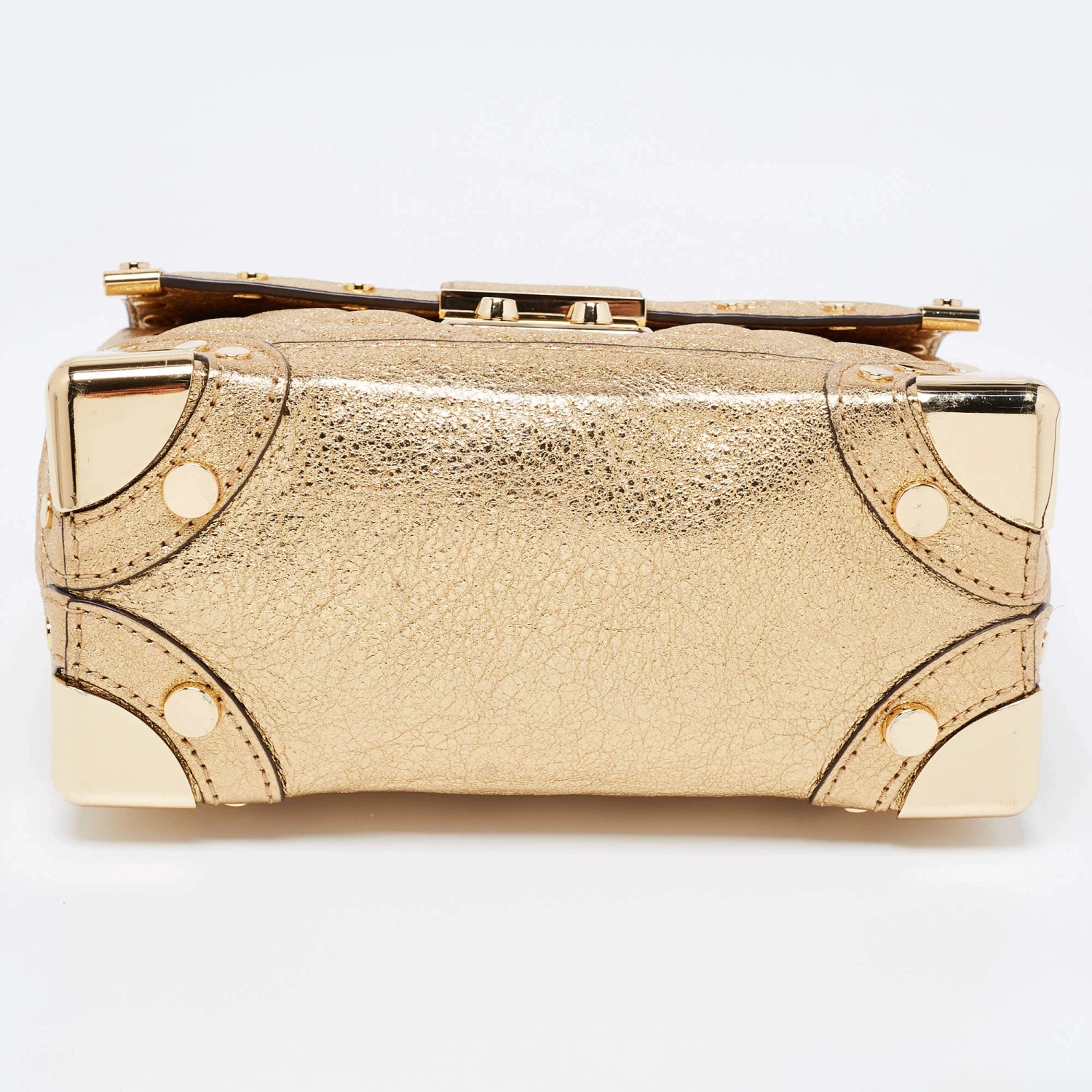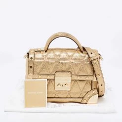 This Cori Trunk handbag by Michael Kors has a structured silhouette in gold leather to create a chic look. The beautifully fashioned bag has a top handle, a shoulder strap, and a flap closure.