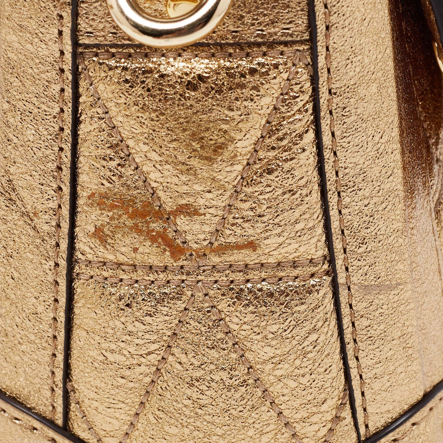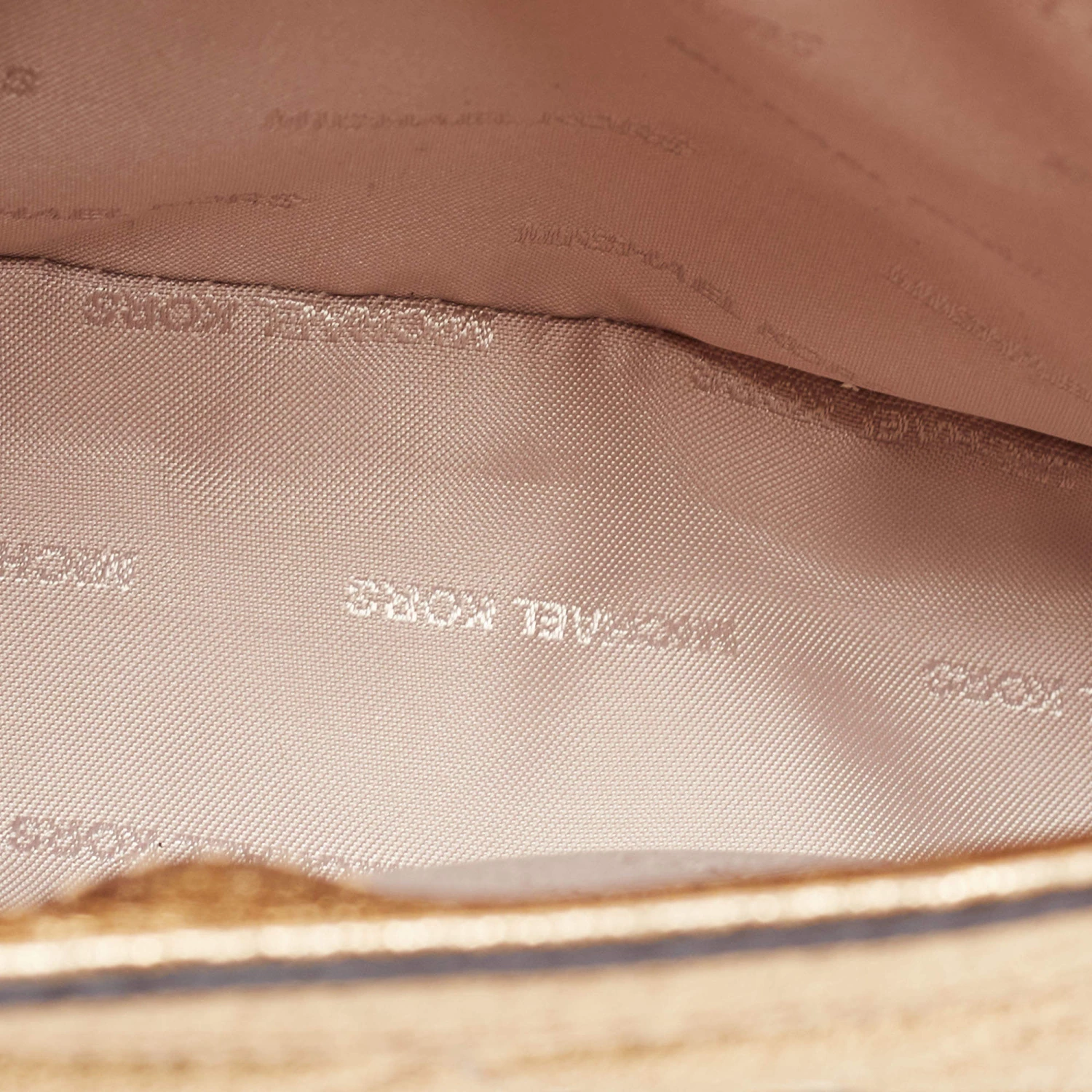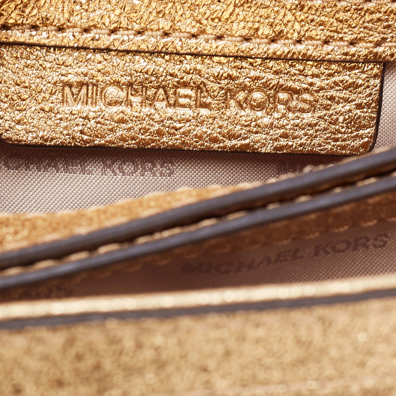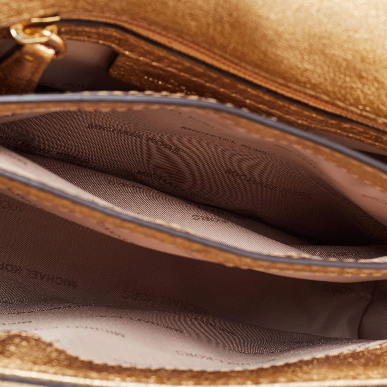 This Cori Trunk handbag by Michael Kors has a structured silhouette in gold leather to create a chic look. The beautifully fashioned bag has a top handle, a shoulder strap, and a flap closure.