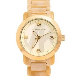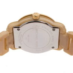Designed with a fine blend of luxury and craftsmanship, this MK4204 watch from Michael Kors is sure to delight your style. Made from gold-tone stainless steel and horn acetate, it has 50 meters of water resistance and a simple clasp.
