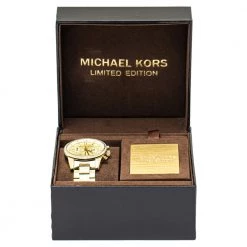 Awaiting to be yours is this stunner of a watch from Michael Kors! Crafted with beauty using gold-tone stainless steel, this Ritz watch is lovely. It brings a gold dial that has three hands, a date window between the 4 and 5 o’clock positions, and three subdials for the chronograph function. Complete with crystals on the bezels, water-resistance of 50 meters, and a push-button deployment clasp, this gorgeous watch is a creation you will love to flaunt.