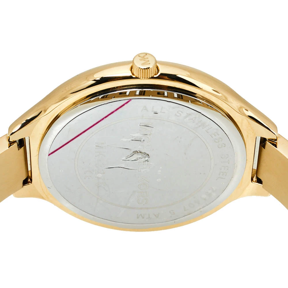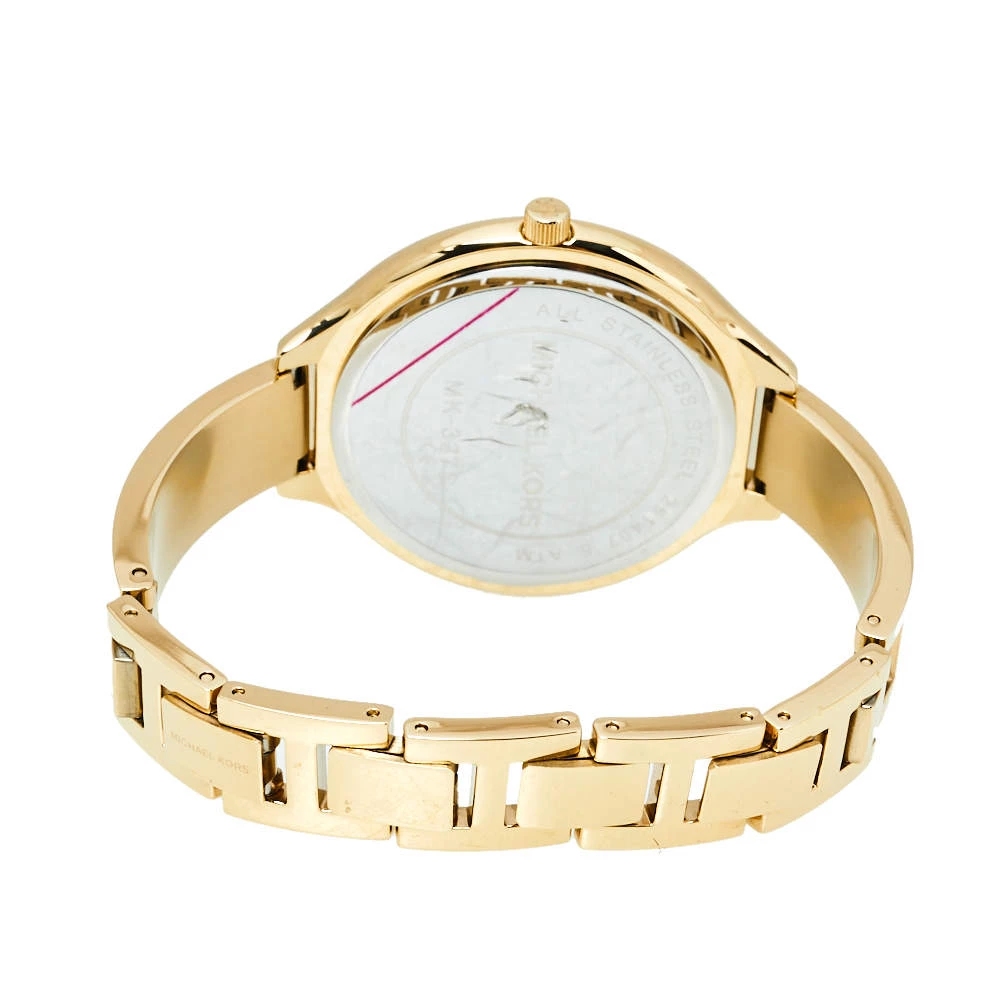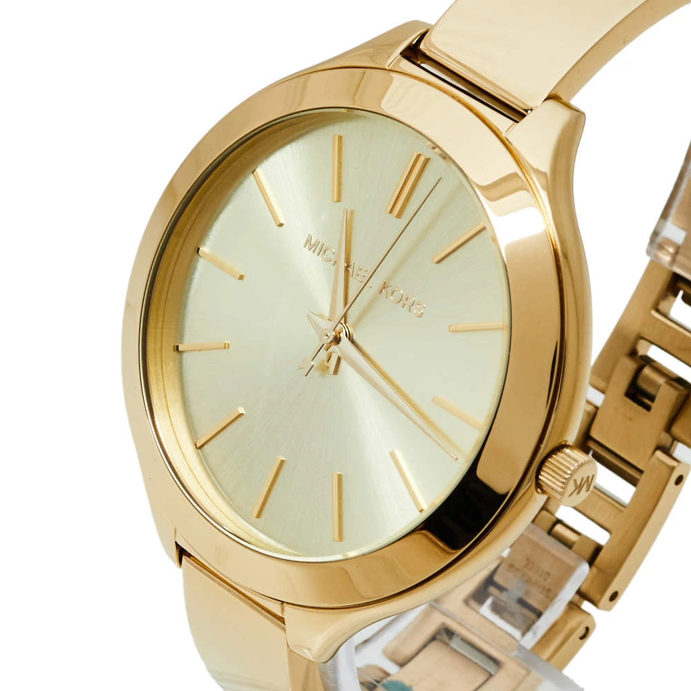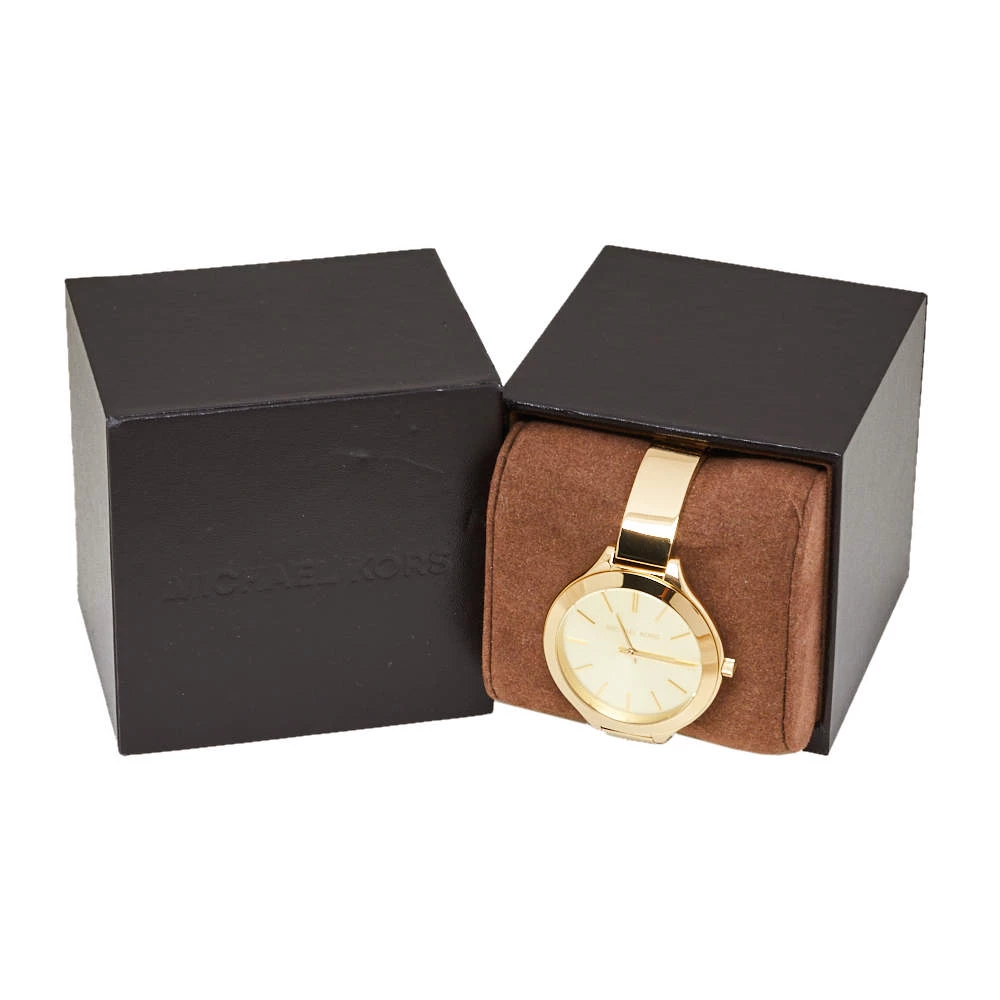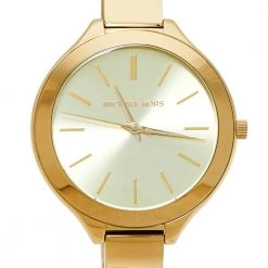 Designed with a fine blend of luxury and craftsmanship, this Runway watch from Michael Kors is sure to delight your style. Made from gold-tone stainless steel, its dial boasts of stick hour markers and three hands. The smooth bezel, 50 meters water resistance, and a hidden fold-over clasp make the quartz timepiece ready to be yours.