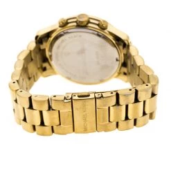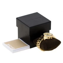 Designed with a fine blend of luxury and craftsmanship, this Runway watch from Michael Kors is sure to delight your style. Made from gold-tone stainless steel, it has a gold dial with a date window and three sub-dials. The smooth bezel, 100-meter water resistance, and push-button clasp make the Quartz timepiece ready to be yours.