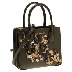 Featuring a chic and fabulous style, this Mercer tote from Michael Kors is truly a masterful creation. It is made from green leather, which is embellished with bufferfly motifs on the front. This tote has gold-toned hardware, dual handles, and a shoulder strap. Flaunt this tote wherever you go.