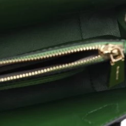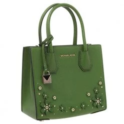 Featuring a chic and fabulous style, this Michael Kors tote is modern. Crafted from leather in stunning green with floral appliques at the front, the tote features dual handles, a removable shoulder strap, and a padlock. It opens to a spacious interior divided by a zipped compartment. The tote comes with protective metal feet and you are sure to love swinging this beauty.