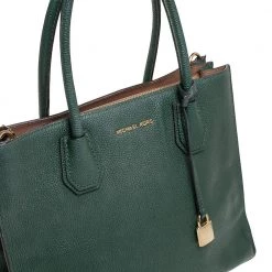 Featuring a chic and fabulous style, this Michael Michael Kors tote is modern. Crafted from grained leather in stunning green, the tote features dual handles, a removable shoulder strap, and a padlock. It opens to a spacious leather & nylon interior divided by a zipped compartment. The tote comes with protective metal feet and you are sure to love swinging this beauty.