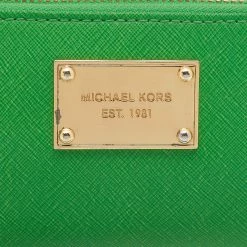 The leather and fabric interior of this Michael Kors wallet will allow you to carry your small essentials hassle-free. Created from green leather, this statement piece displays gold-tone hardware, a branded plaque on the front, and a wristlet.