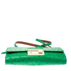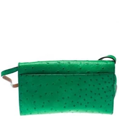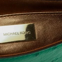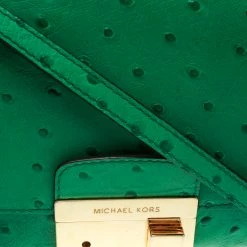 This elegant clutch from Michael Kors is easy to carry without compromising on style. Crafted from ostrich-embossed leather, the clutch features gold-tone hardware, a shoulder strap, and a flap. The interior is leather-lined and has a slip pocket.