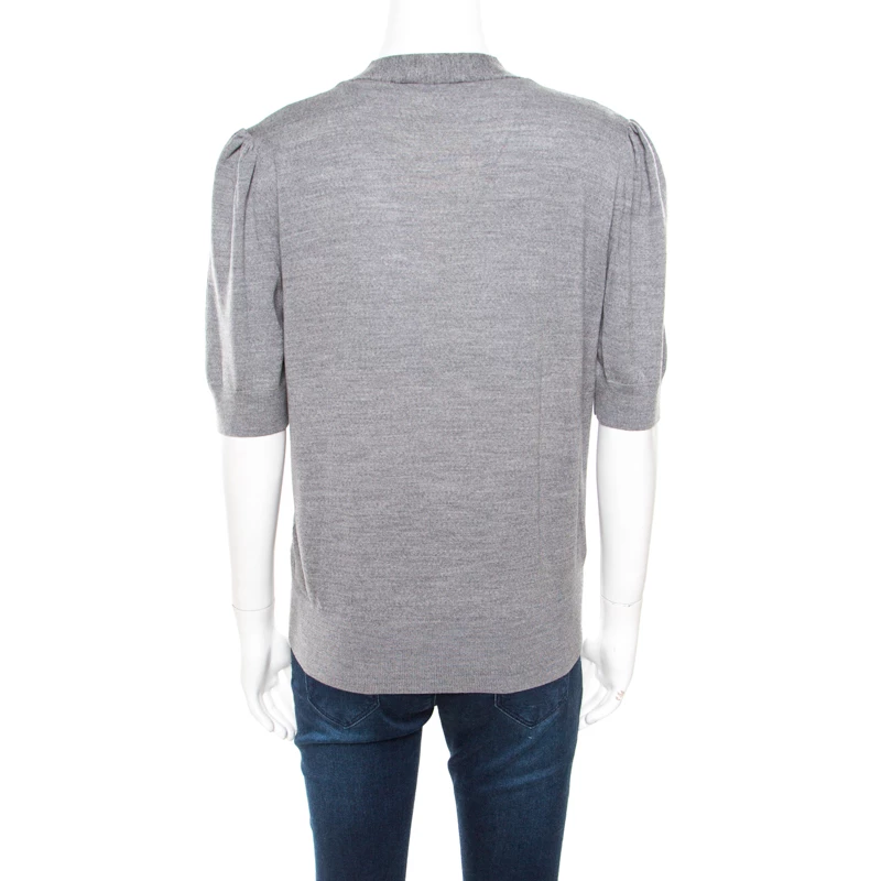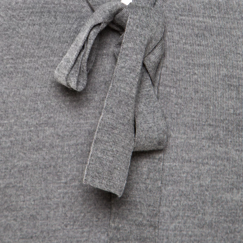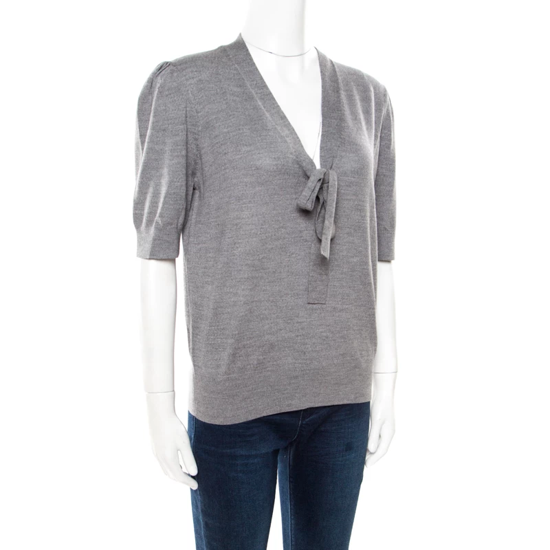 This sweater by Michael Kors is made from Merino wool in an understated grey hue. It is styled with short sleeves and tie detail at the neckline. A relaxed silhouette completes this subtle and smart sweater. Nail a super style look by pairing this sweater with a midi skirt and loafers.