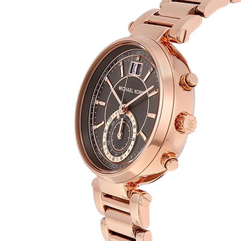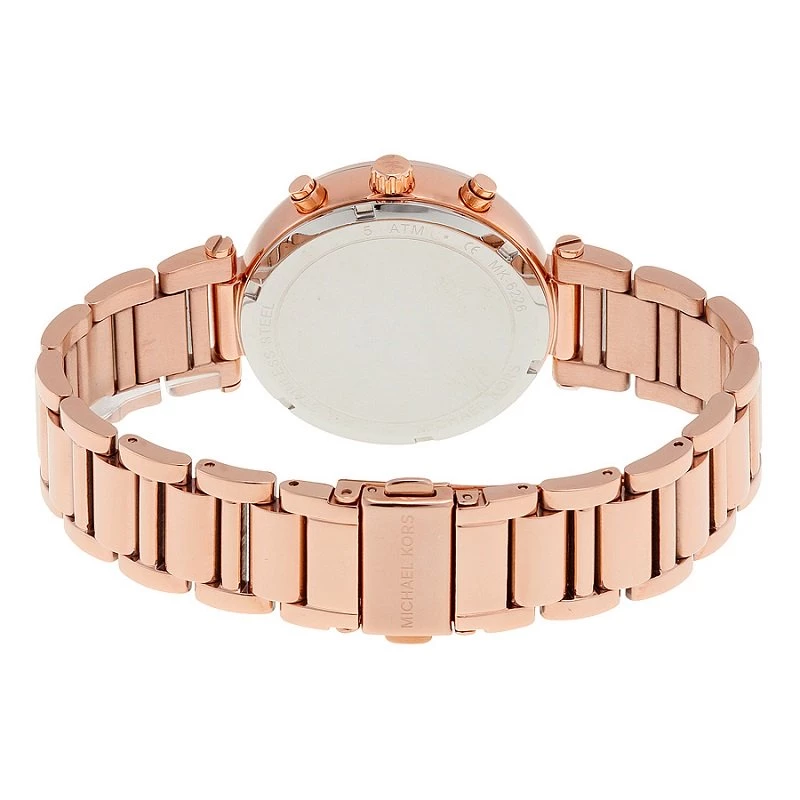 The Sawyer timepiece from Michael Kors is magnificent to say the least. The contemporary design is well crafted with a quality rose gold plated stainless steel case, holding a smooth and a shiny bezel. It features Arabic numerals engraved in white. The grey dial contrasts with the crystal marked index indicators, coupled with a date window, sleek hands and a chronograph. Water resistant up to 100m, this timepiece will adorn the wrist using a hidden deployment clasp.