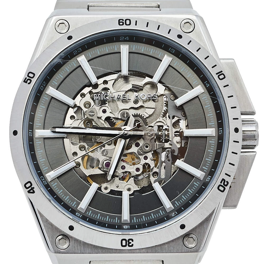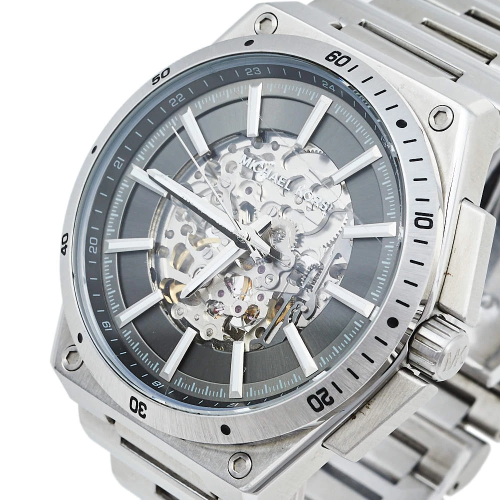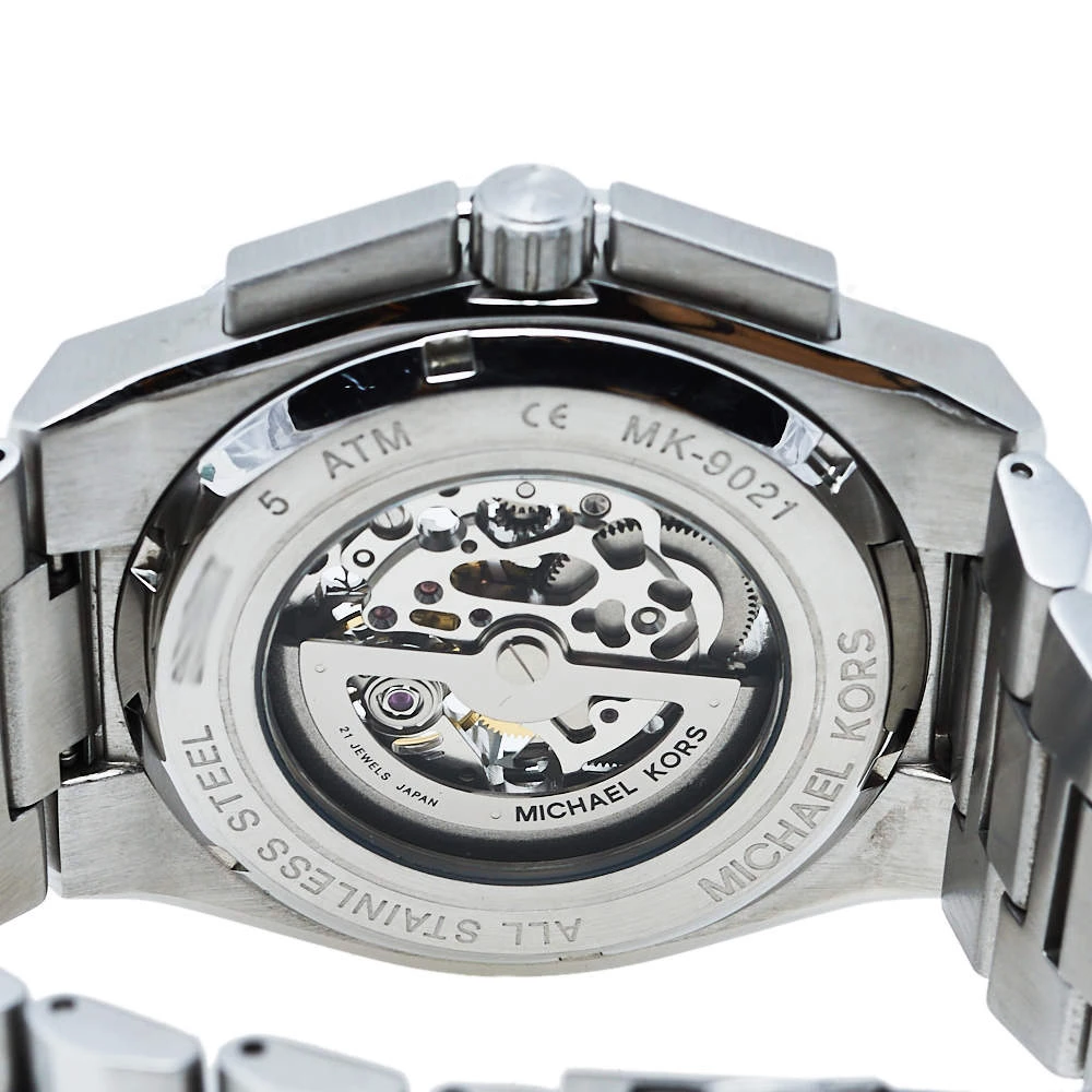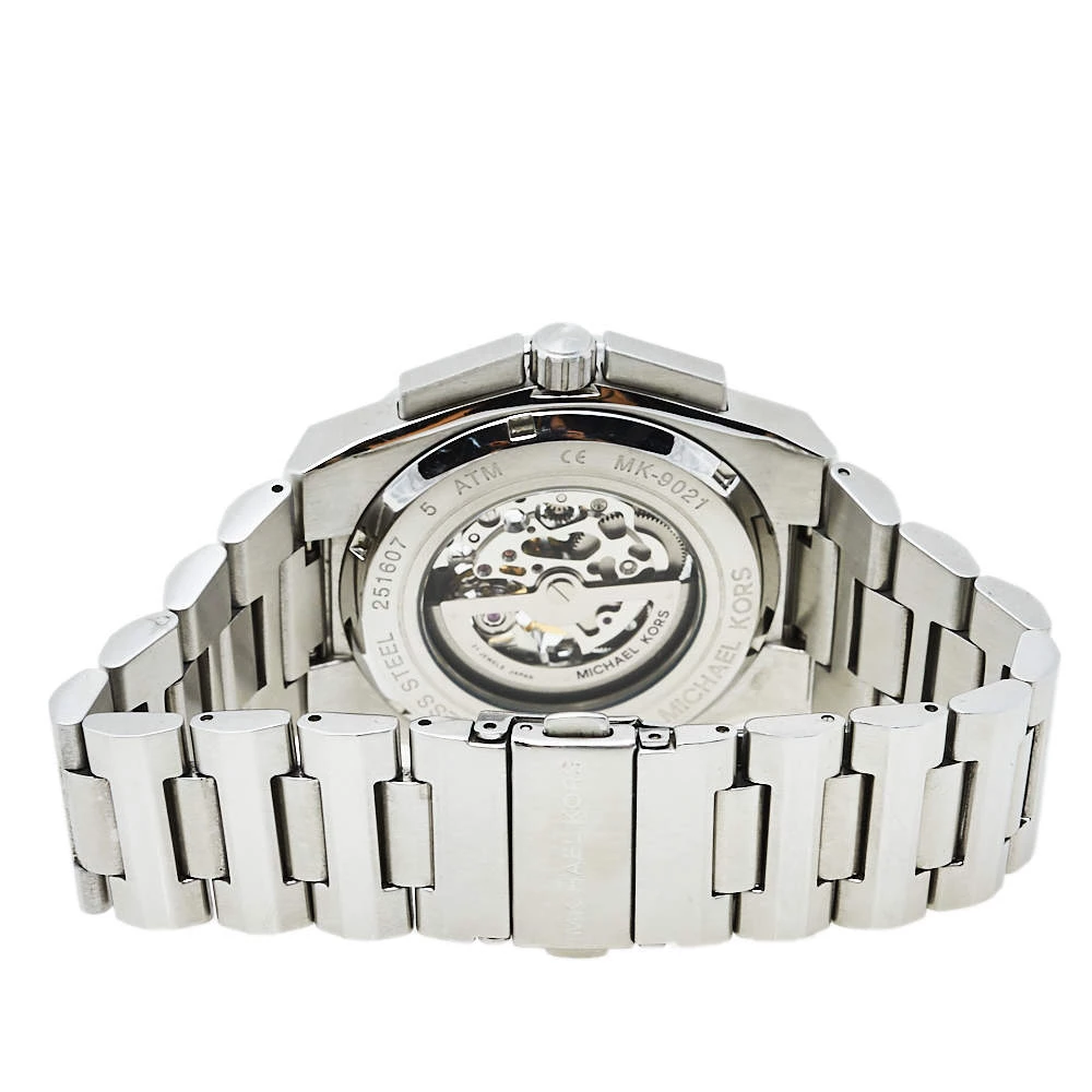 Make the right style choice with this Wilder Skeleton MK9021 timepiece from Michael Kors. The watch is made from stainless steel and the skeleton dial is set with elegant markers, three hands, and the brand name. It has a water resistance of 50 meters.