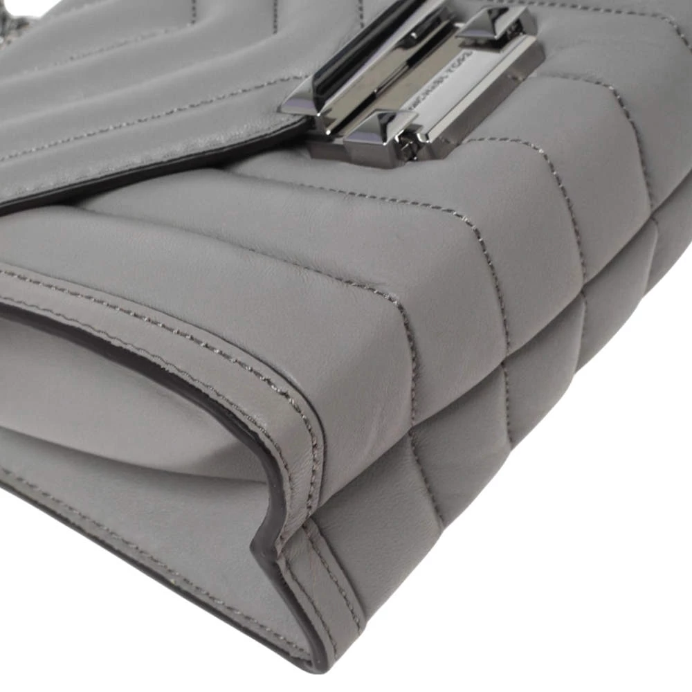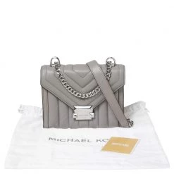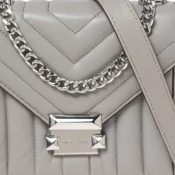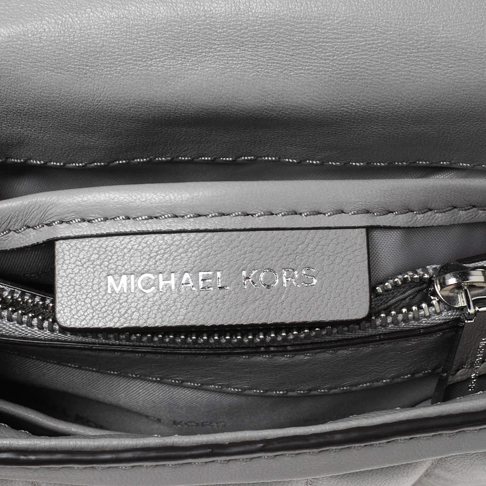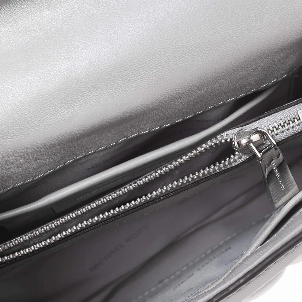 Michael Kors brings you this exquisitely designed shoulder bag that is a must-have for all the fashionistas. With a grey leather exterior and silver-tone hardware, it is striking in its structured silhouette. Pair it with an all-black outfit and some statement jewelry for a fashionable look.