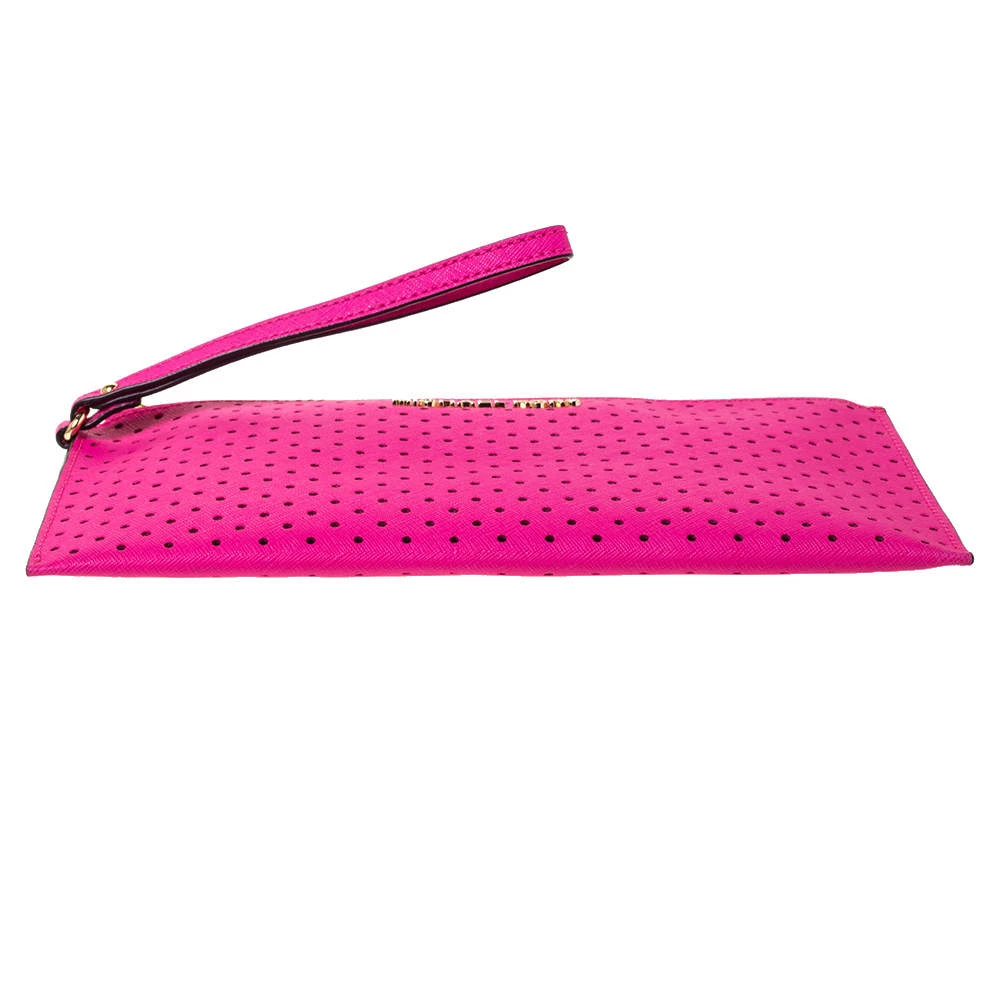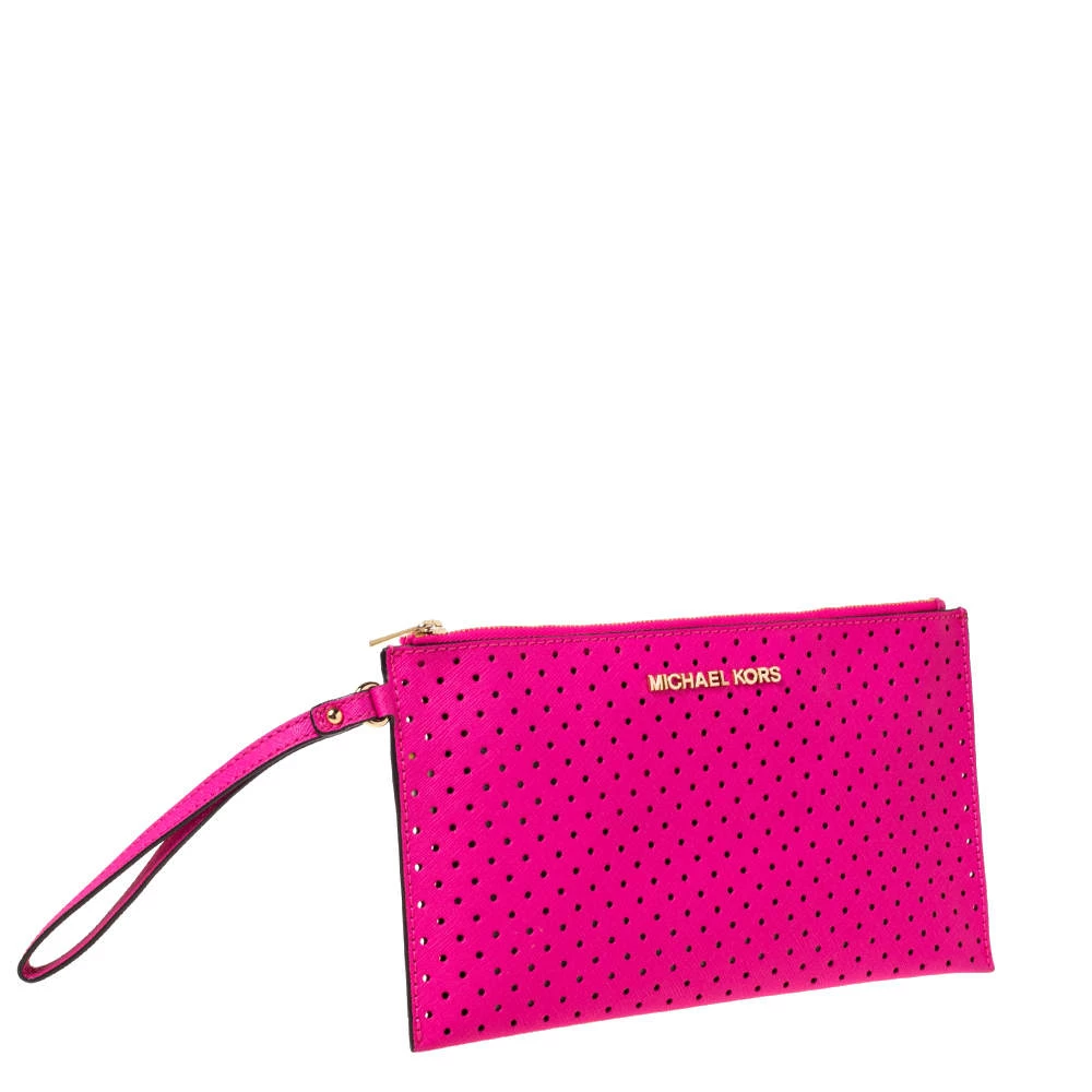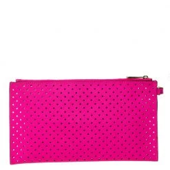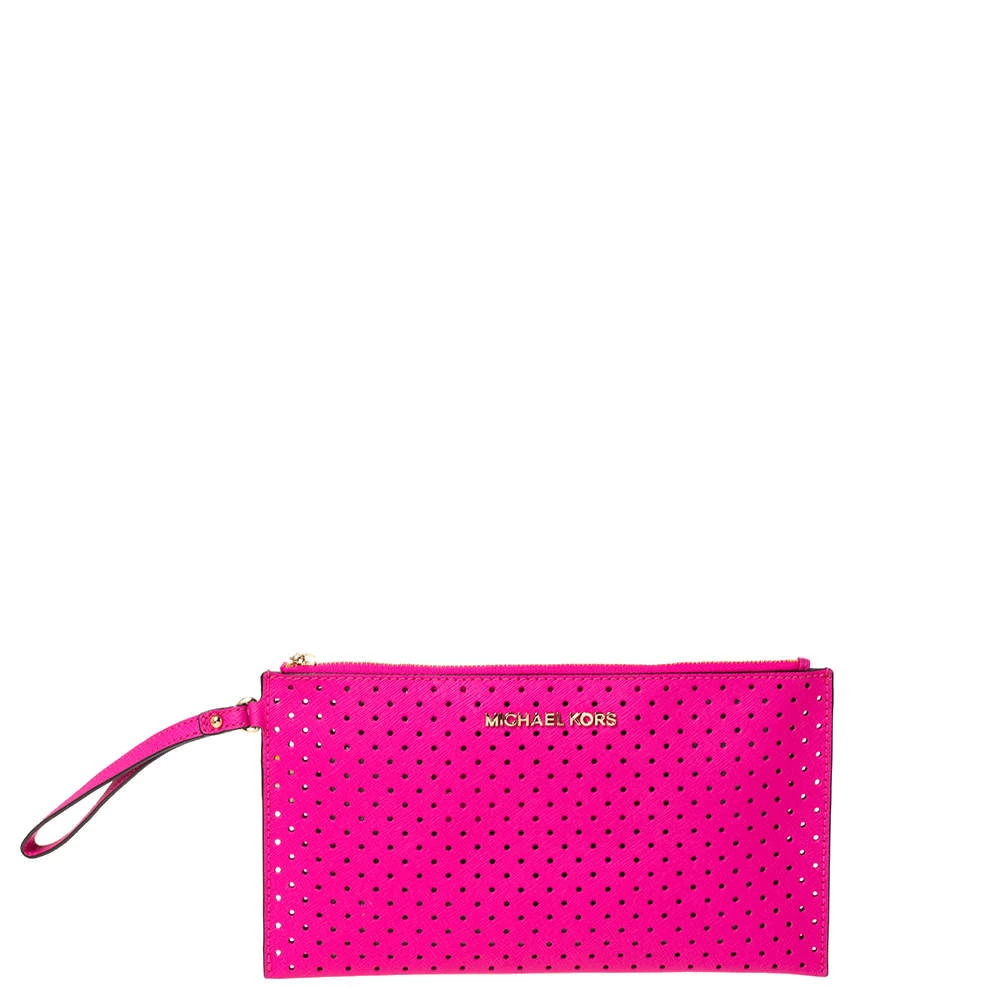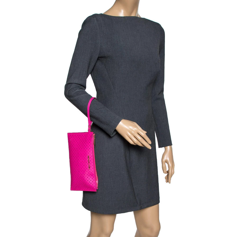 Michael Kors brings you yet another gorgeous accessory with this pouch. It has been carefully crafted from pink, perforated leather into a simple shape. The top zipper opens to reveal an interior for your essentials and a wristlet is provided as a finishing touch.