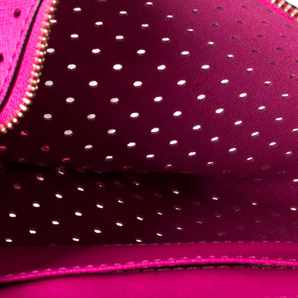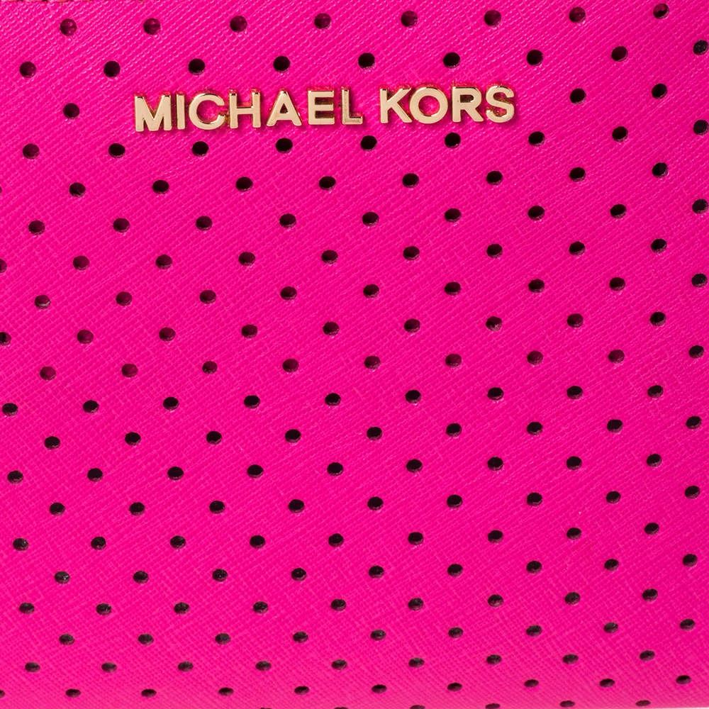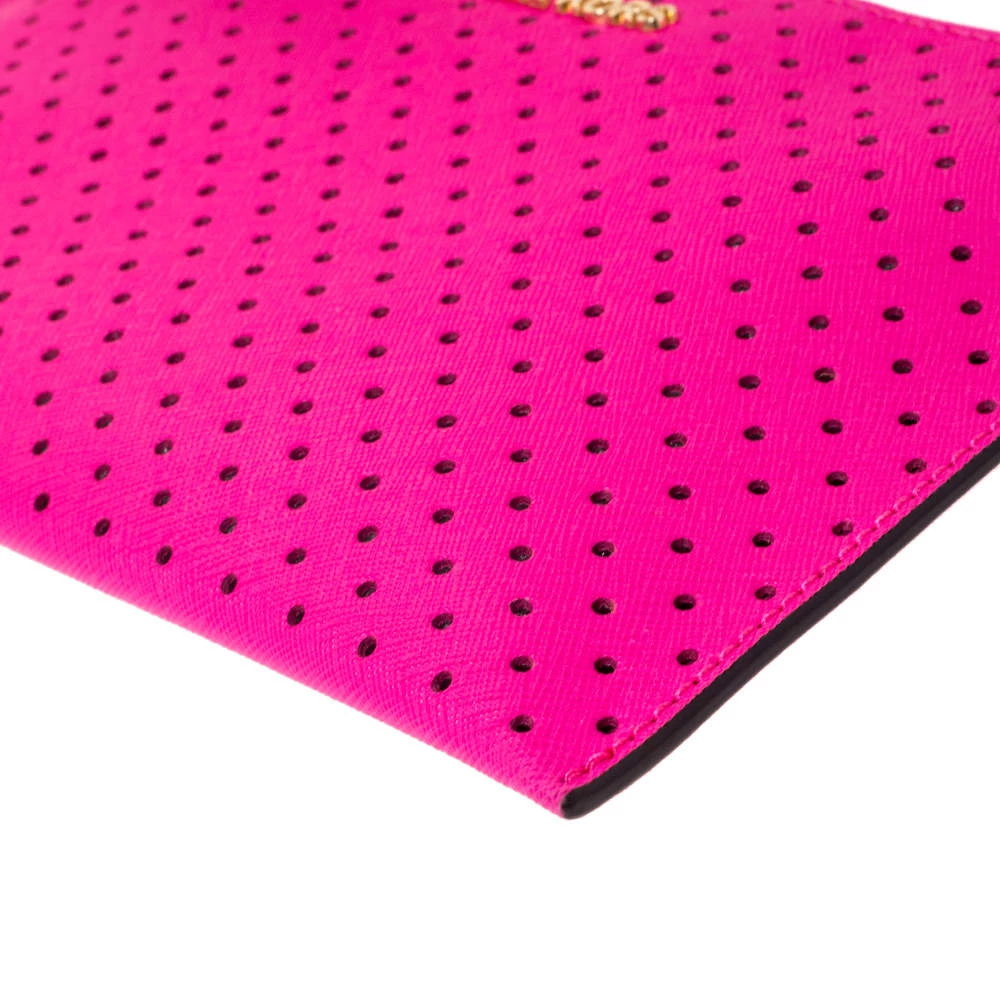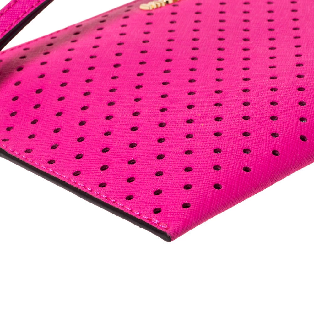Michael Kors brings you yet another gorgeous accessory with this pouch. It has been carefully crafted from pink, perforated leather into a simple shape. The top zipper opens to reveal an interior for your essentials and a wristlet is provided as a finishing touch.