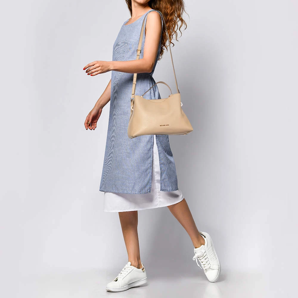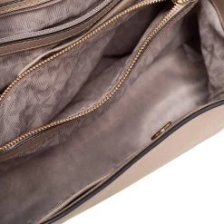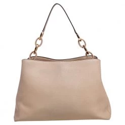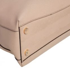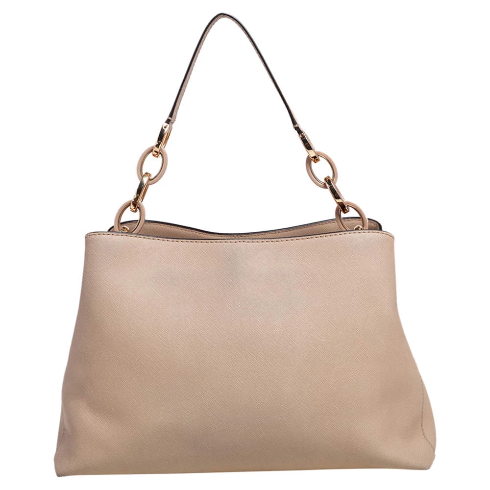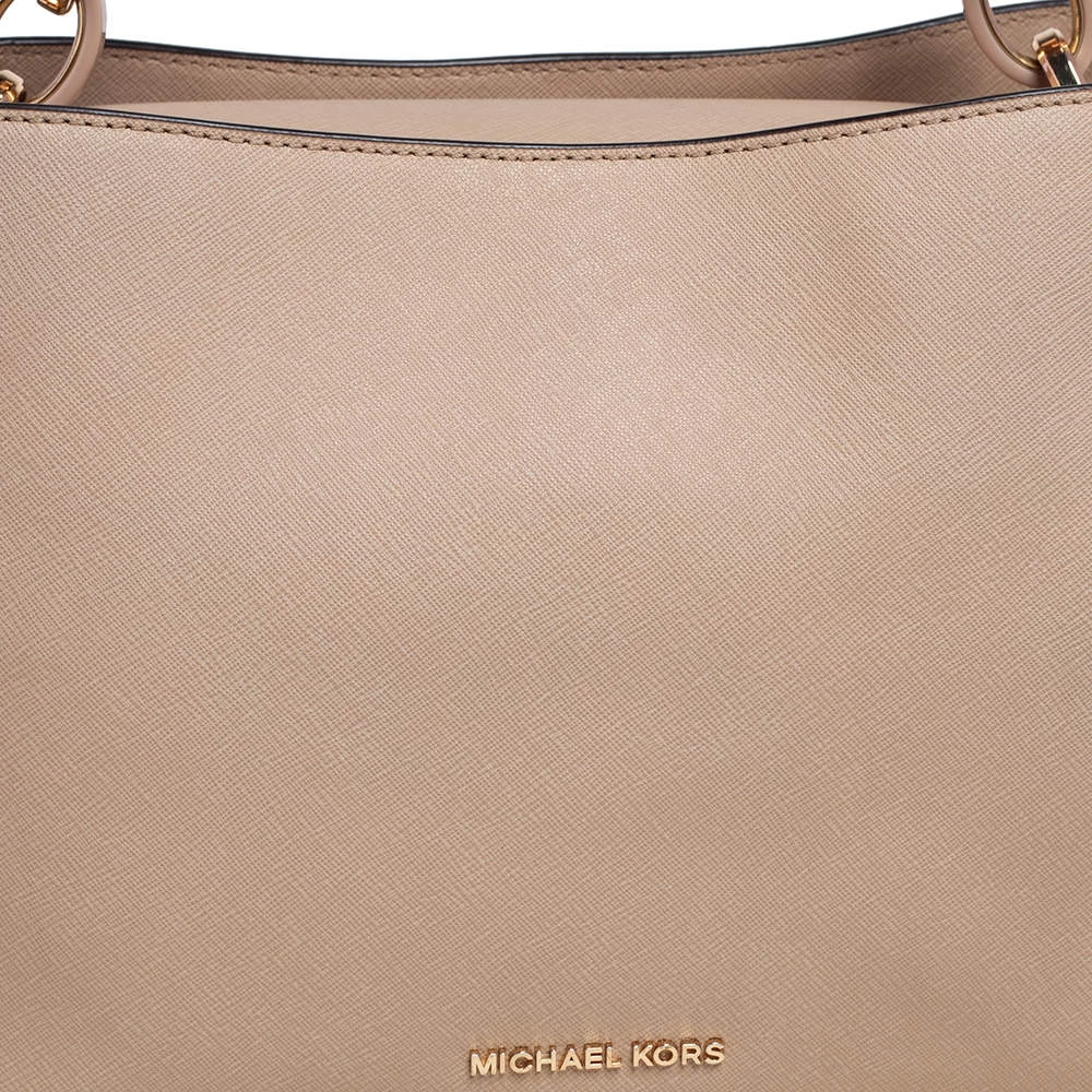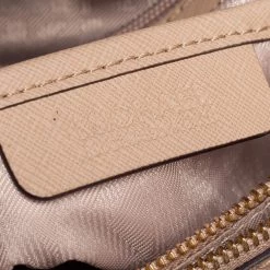 Carry this bag from Michael Kors without compromising on style. This light beige Saffiano leather bag comes in a simple design with the brand detail on the front. This chic bag opens to a nylon-lined interior and is held by a single top handle and a detachable shoulder strap.