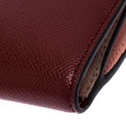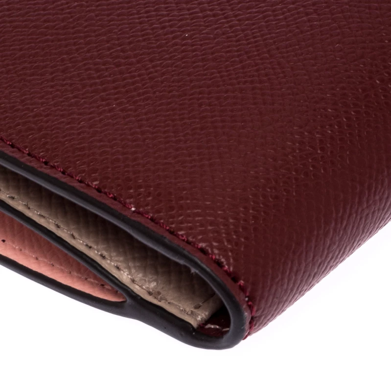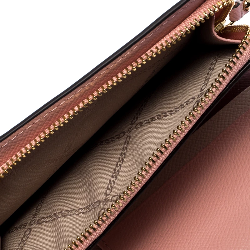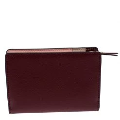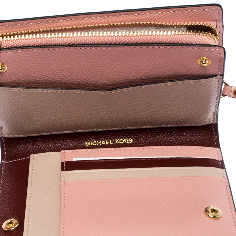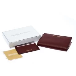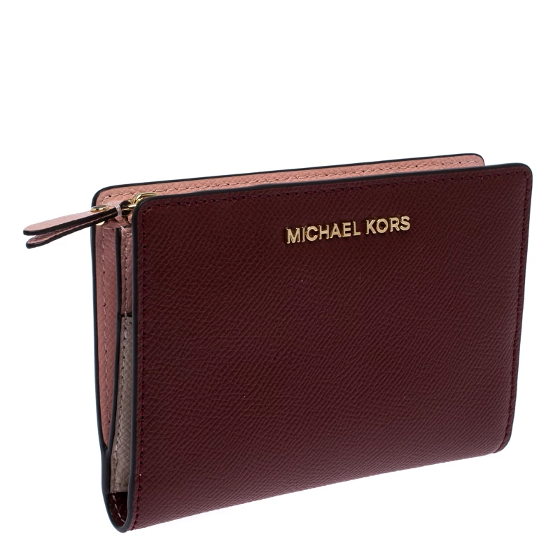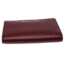 This Michael Kors wallet is crafted with maroon leather in a bifold style. Super spacious, it comes with multiple card slots and pockets along with a zipper pocket. There is snap button closures that secures the wallet. A blend of class and functionality, this wallet with its compact size slips easily into your bag.