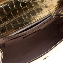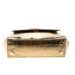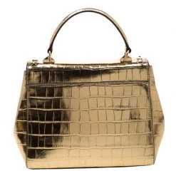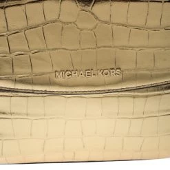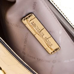 Masterfully crafted with textured leather, the Karla satchel is a must-have piece for any fashionista. This bag by Michael Kors has spacious interiors lined with the finest nylon. Designed in a stunning shade of metallic gold, this piece is complete with matching studs and the brand logo on the front flap, and a single top handle.