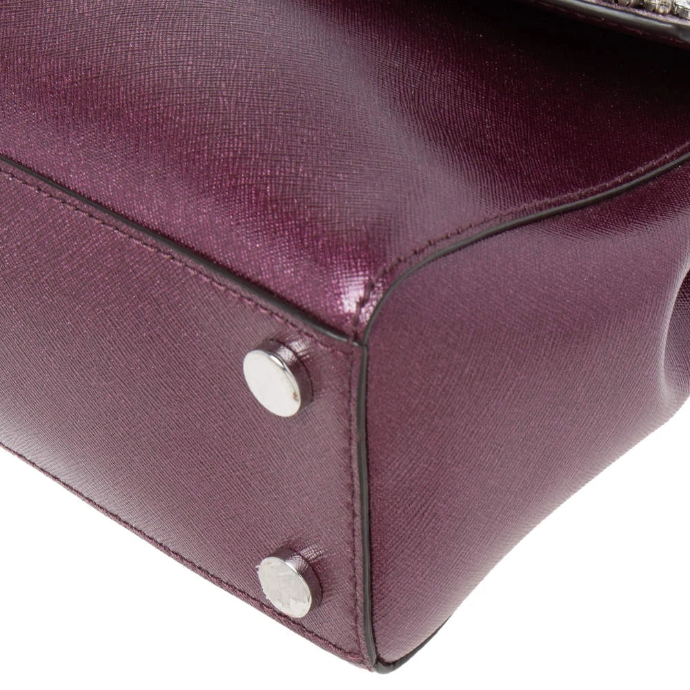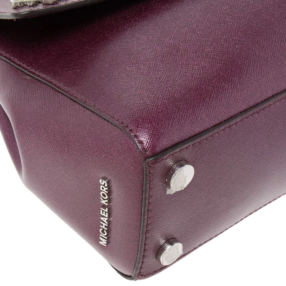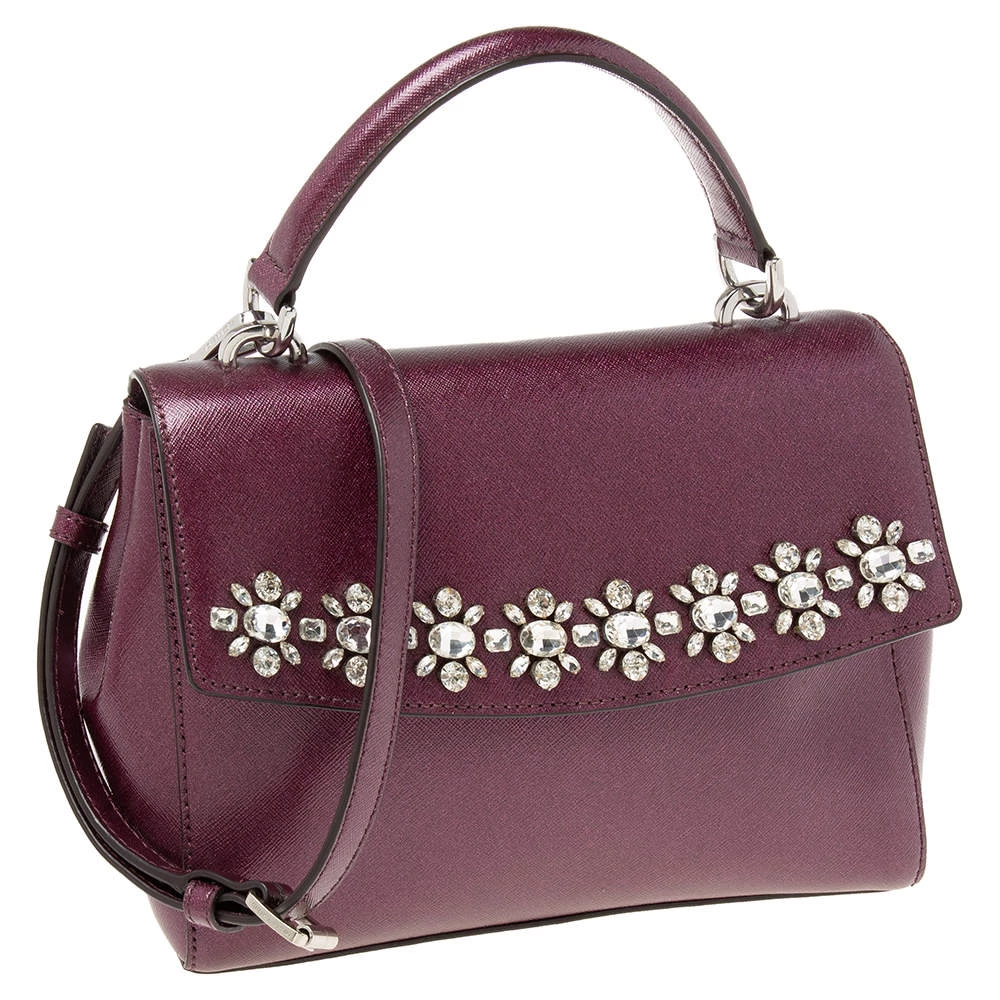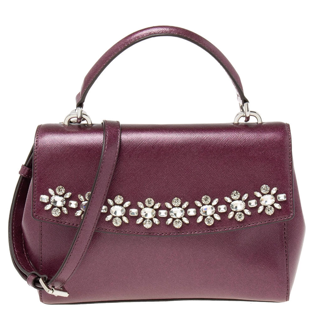 This beautiful top handle bag comes from Michael Kors. Crafted from metallic purple leather, it features a durable interior for your essentials. Gorgeous crystal embellishments adorn the front flap and a detachable strap makes the piece easy to carry.