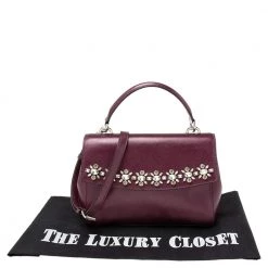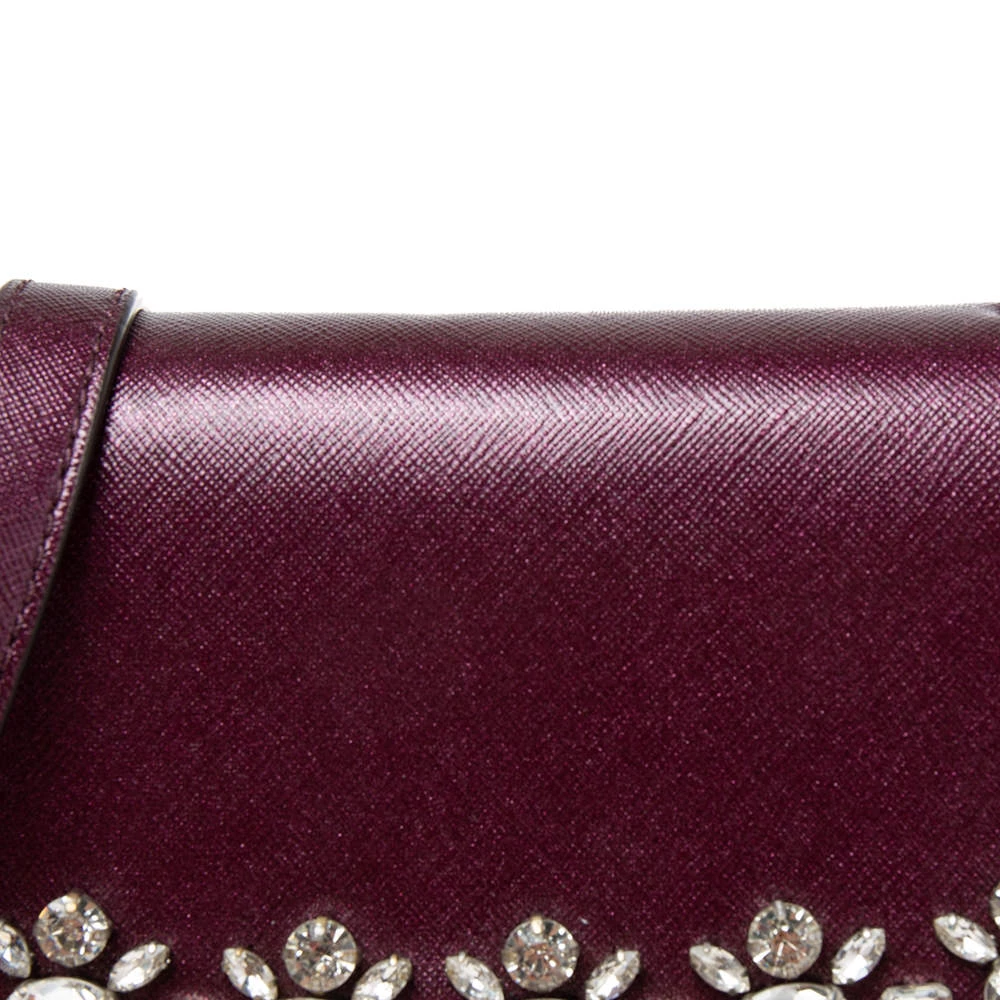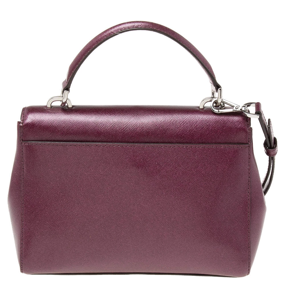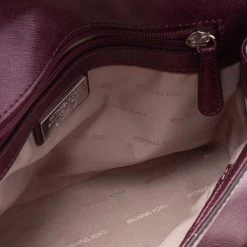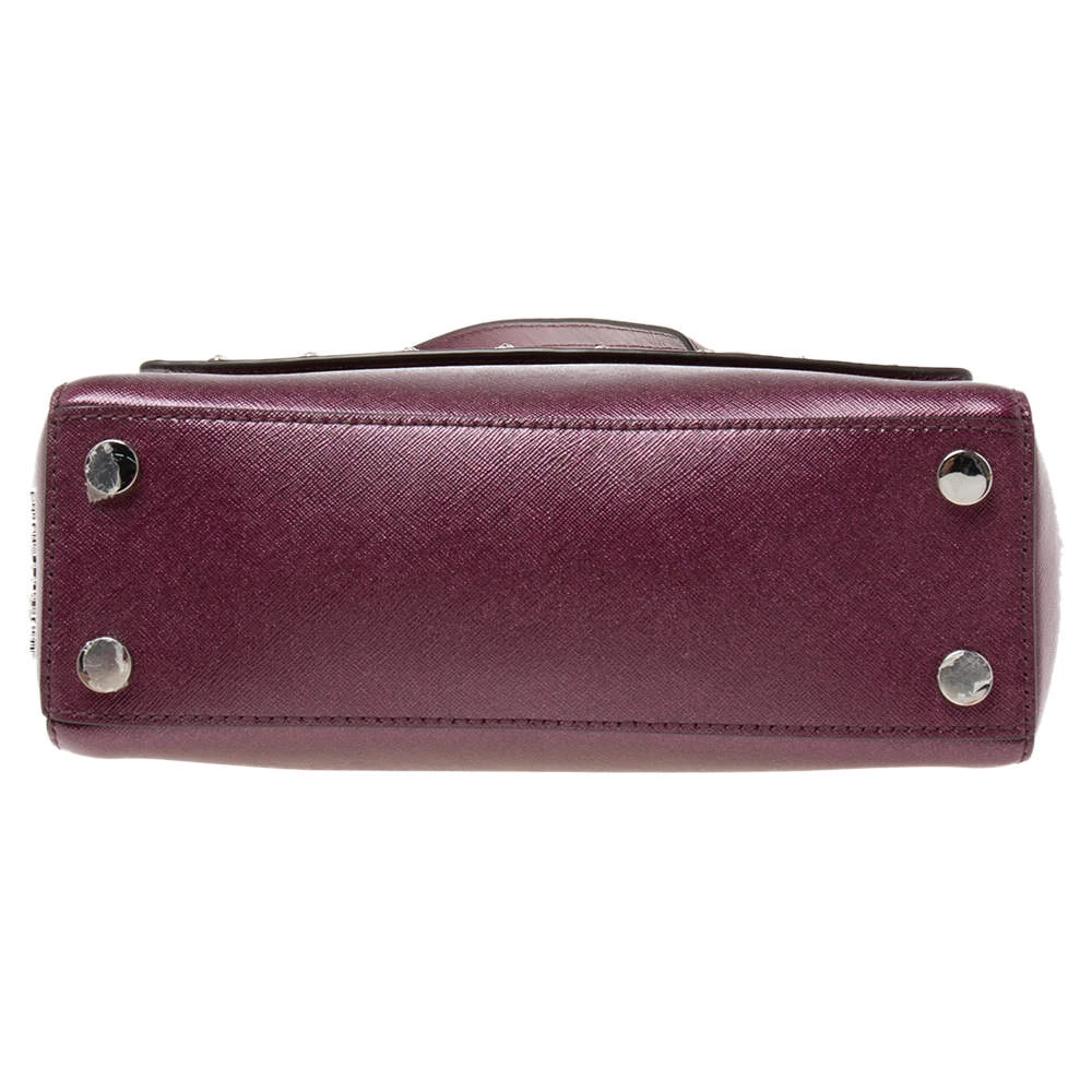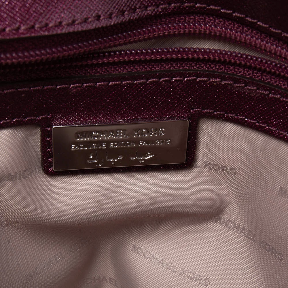 This beautiful top handle bag comes from Michael Kors. Crafted from metallic purple leather, it features a durable interior for your essentials. Gorgeous crystal embellishments adorn the front flap and a detachable strap makes the piece easy to carry.