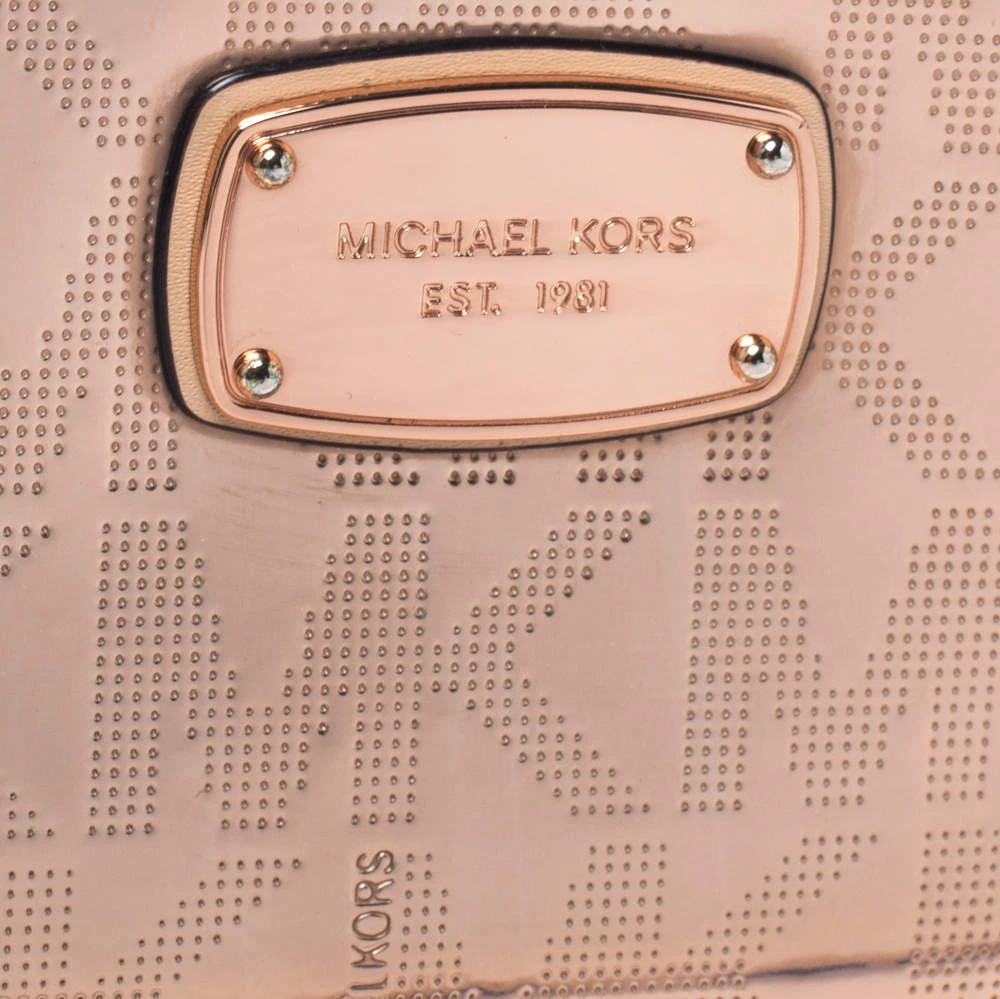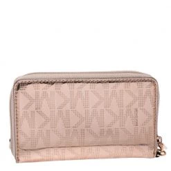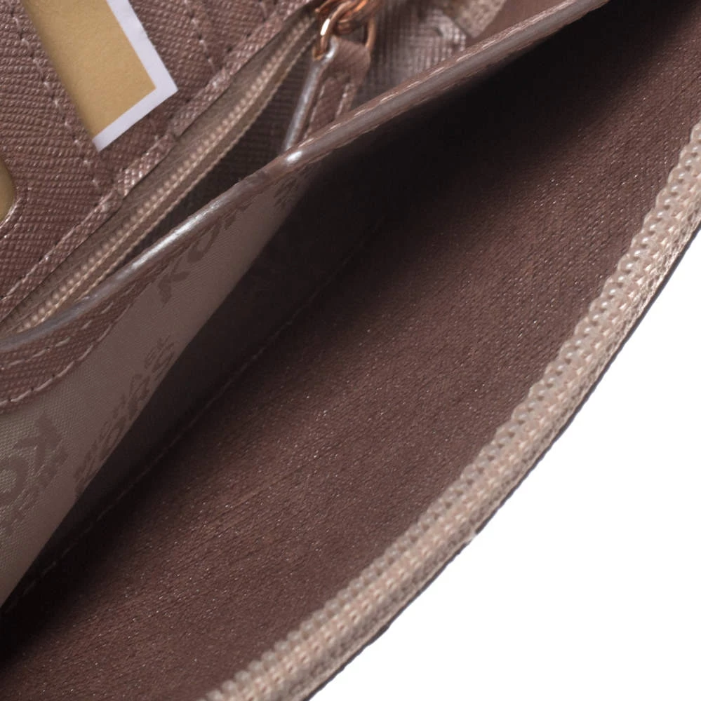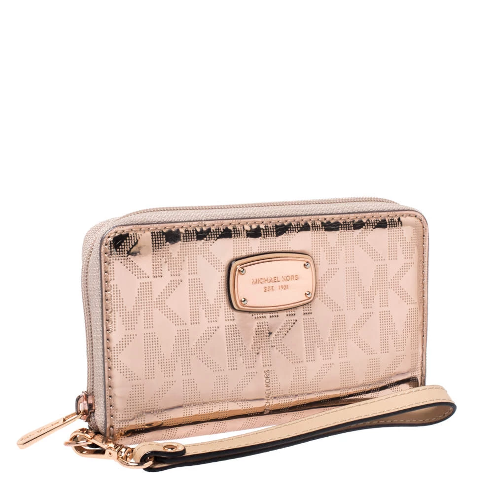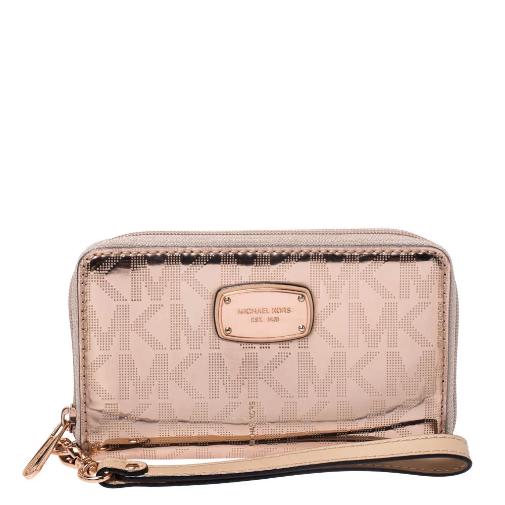 Luxe and classy, this zip-around wallet is from the house of Michael Kors. It has been crafted from patent leather featuring a metallic rose gold exterior and equipped with a zipper leading to multiple slots to neatly carry your essentials. The wallet is complete with the brand plaque at the front.