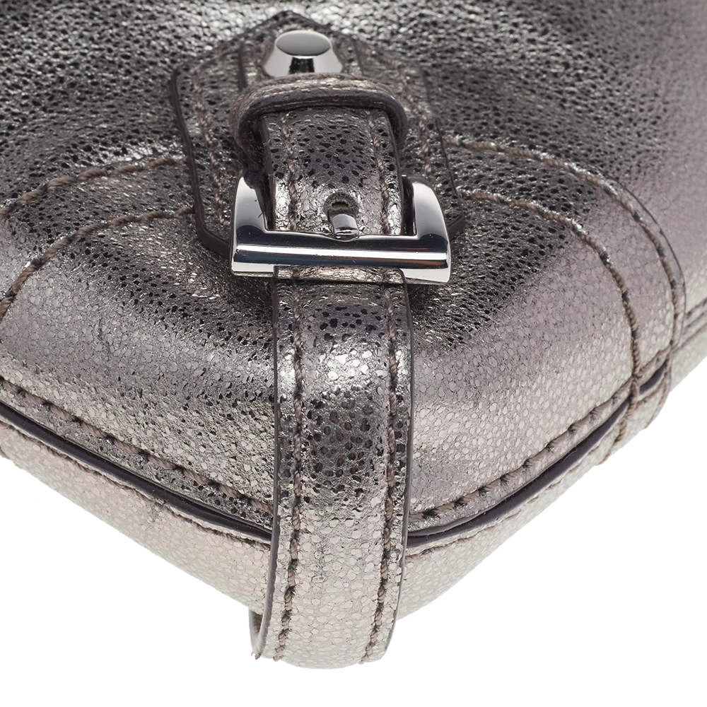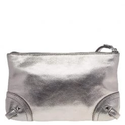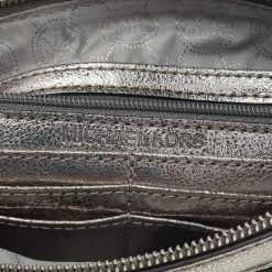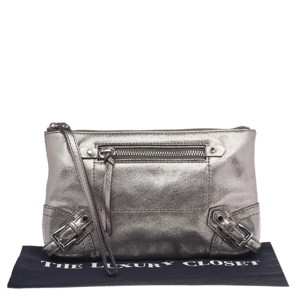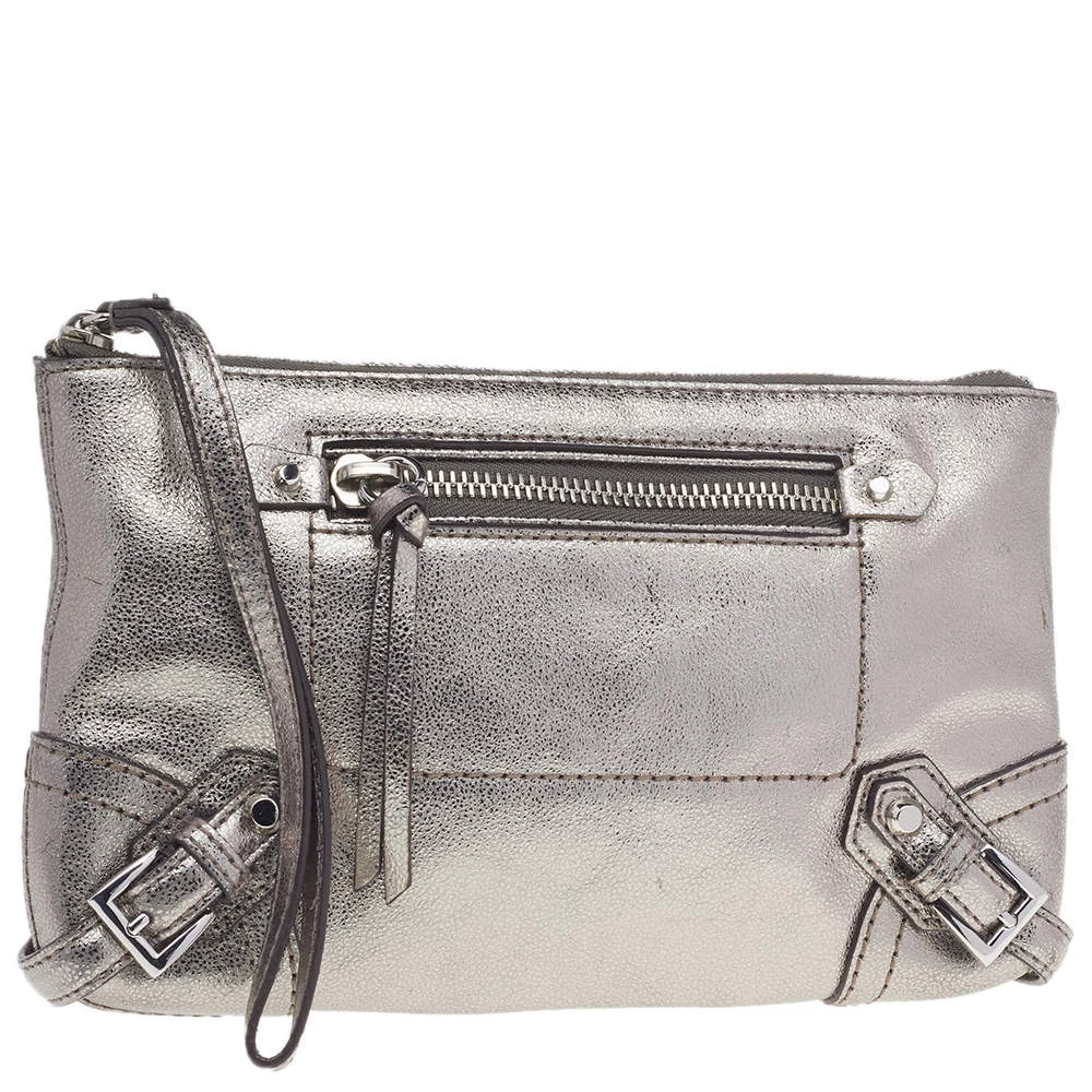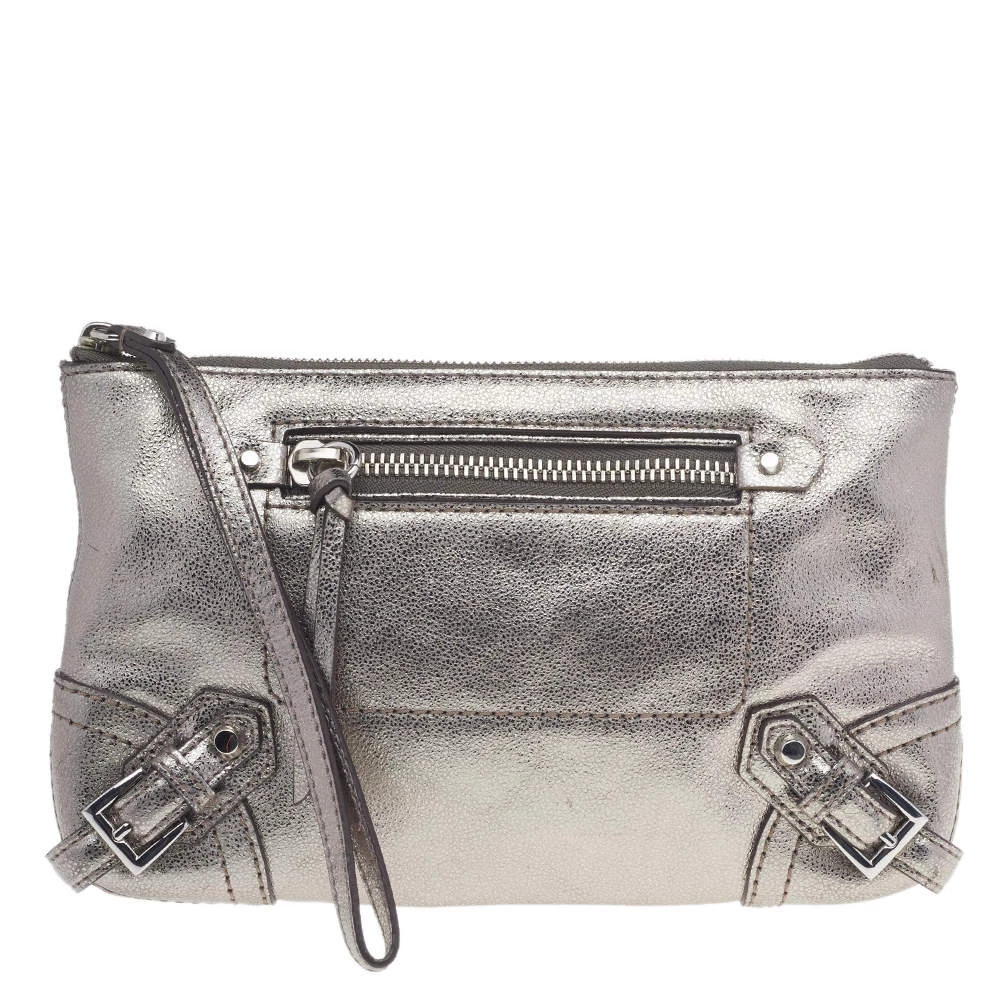 This Michael Kors clutch will house your phone, make-up essentials, and card holder easily, whether you’re carrying it to a party or running errands. It has been crafted from metallic silver leather and added with a nylon interior, wristlet zipper pull, and silver-tone hardware.