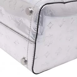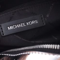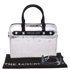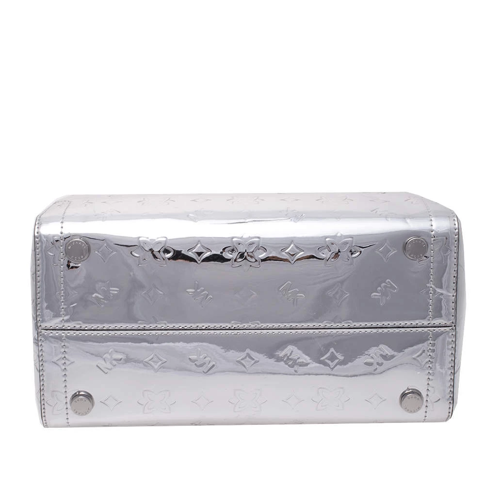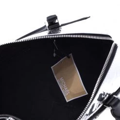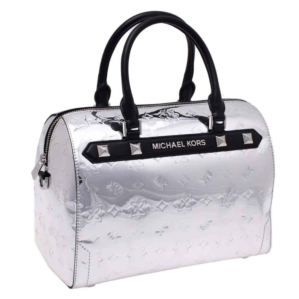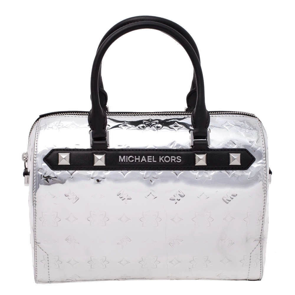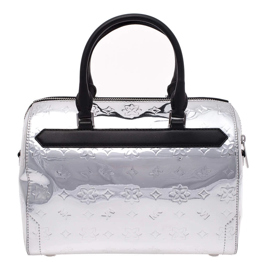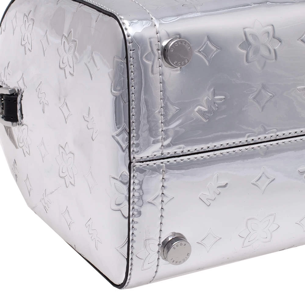 Complement the fashionista in you by adorning this gorgeous handbag from Michael Kors. Make a chic appearance with this fashionable patent leather bag paired along with an equally fashionable outfit. This metallic silver mirror bag is lined with quality nylon that allows you to keep your essentials safe. It is finished with dual handles, shoulder strap and silver-tone hardware.
