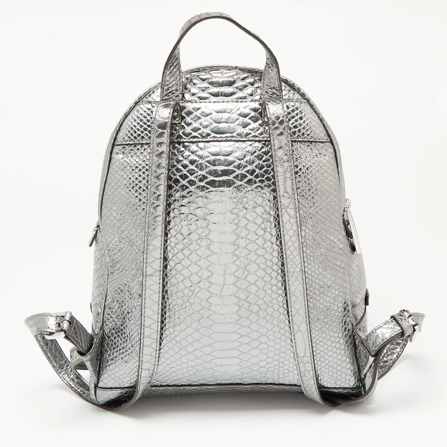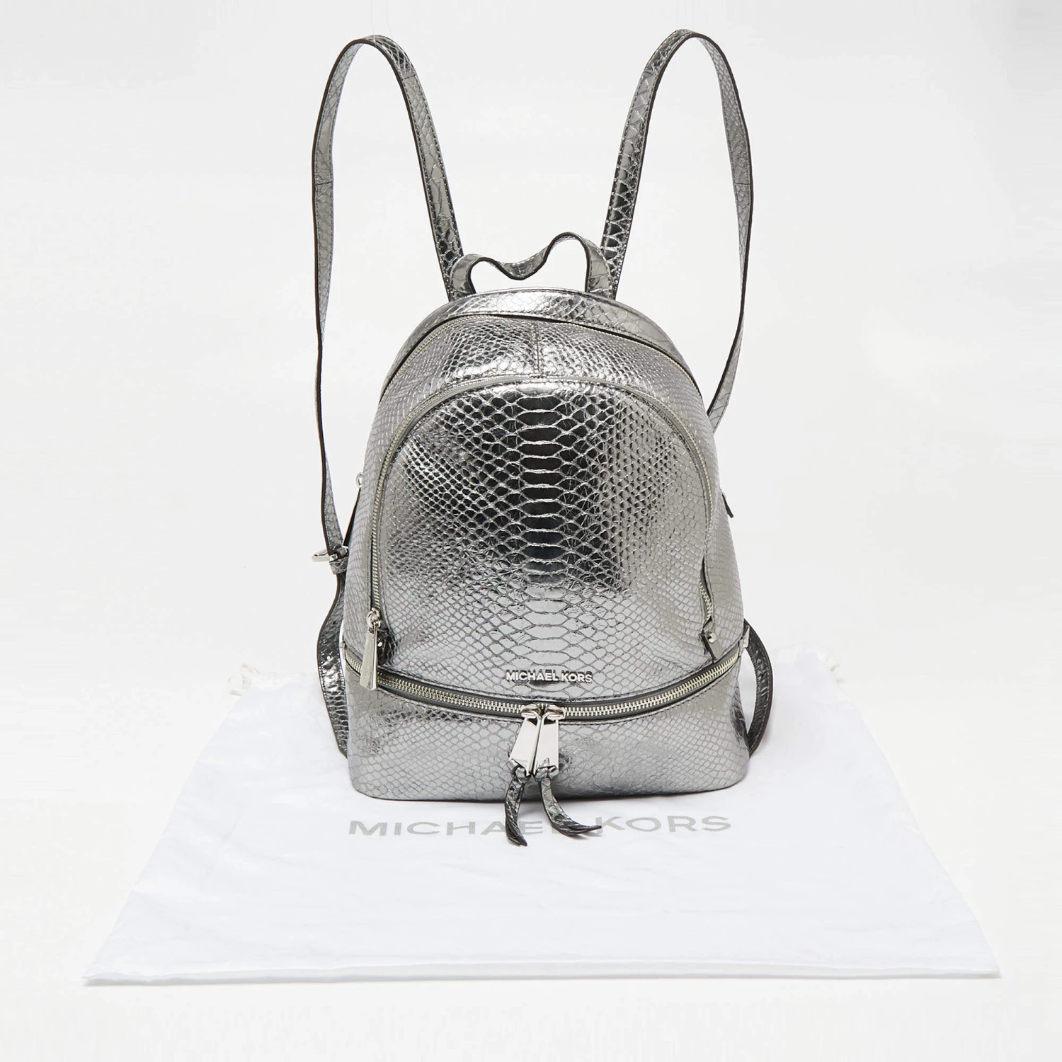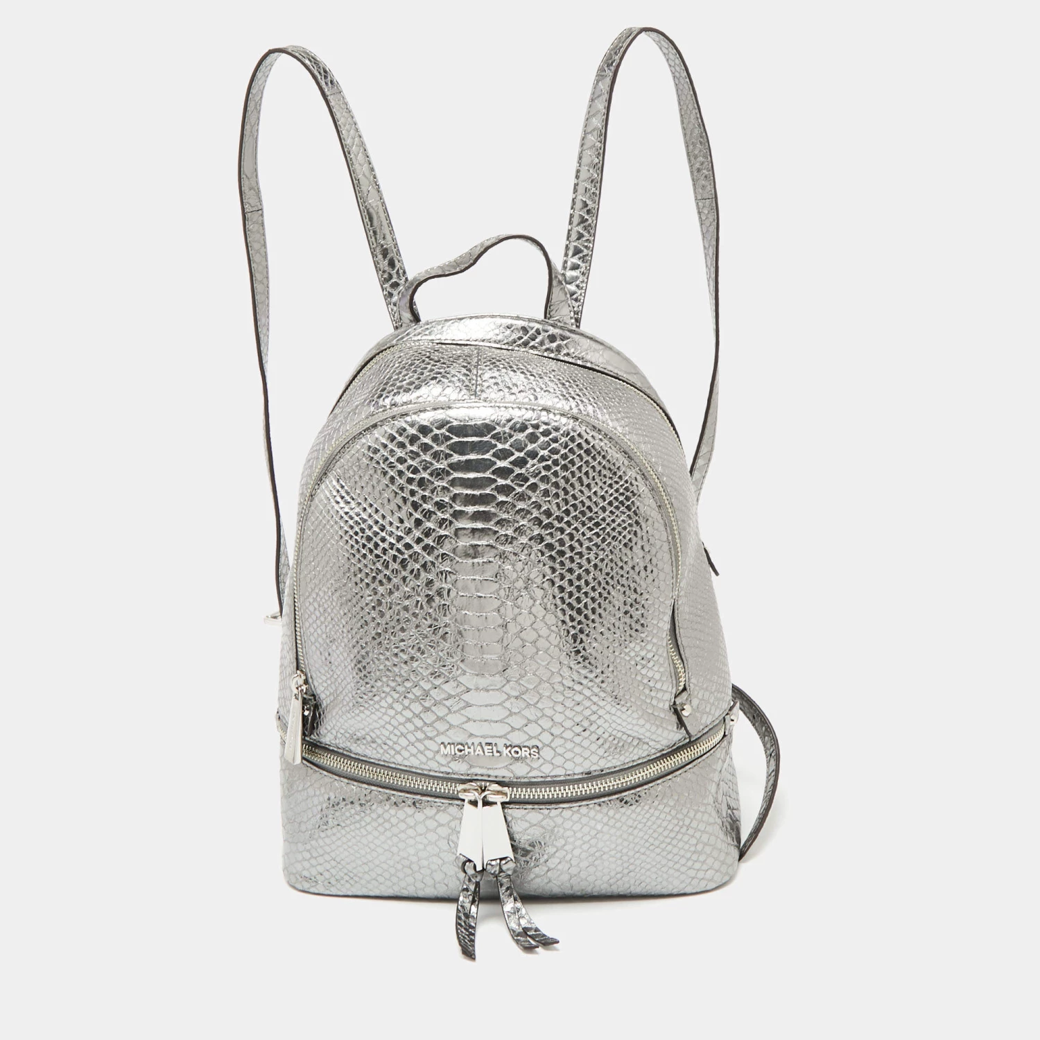 Flaunt your elevated choice in fashion with this Rhea backpack from Michael Kors. It has been crafted from python-embossed leather and detailed with an exterior zipper closure at the front. The designer backpack for women is equipped with a top handle, adjustable shoulder straps, and a spacious interior.