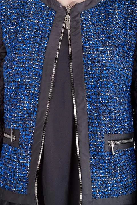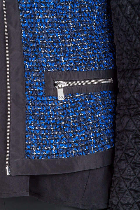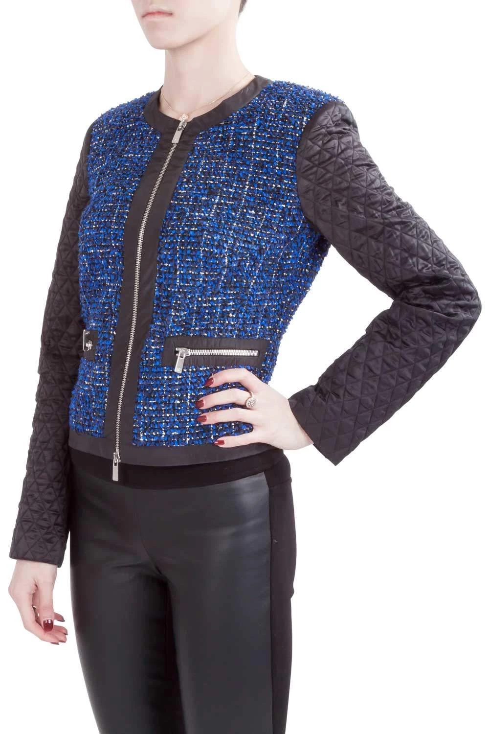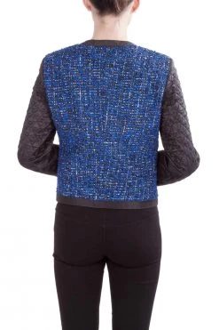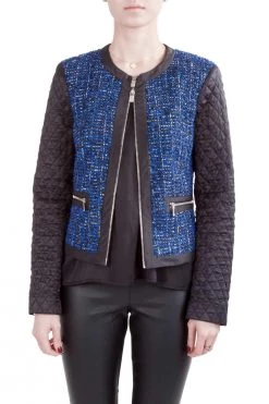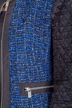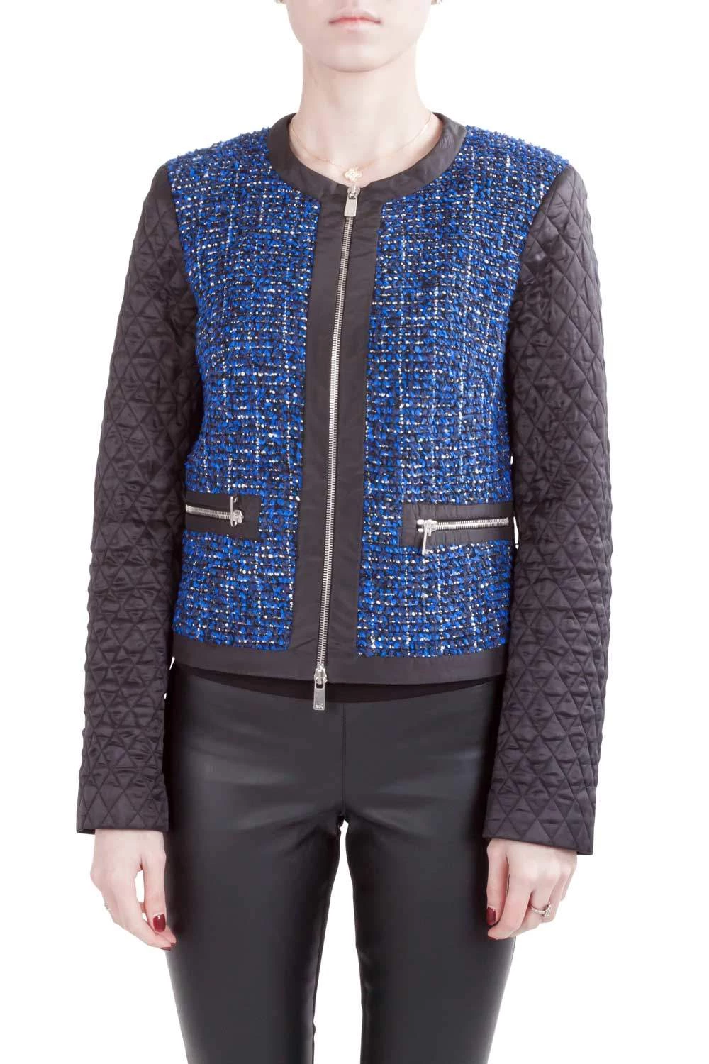 Made by Michael Kors, this jacket comes in a combination of blue and black color. It features tweed design and quilted sleeves. The jacket has a zip front closure and provides a great fit to create your rocking biker look.
