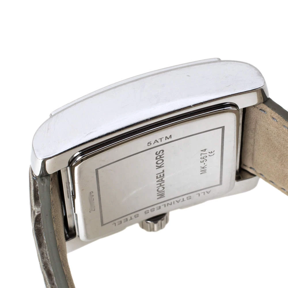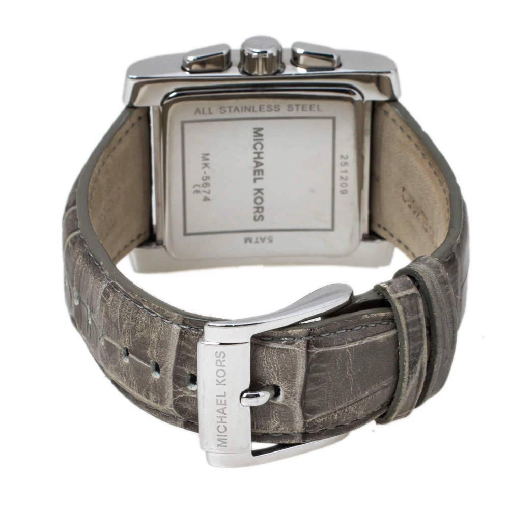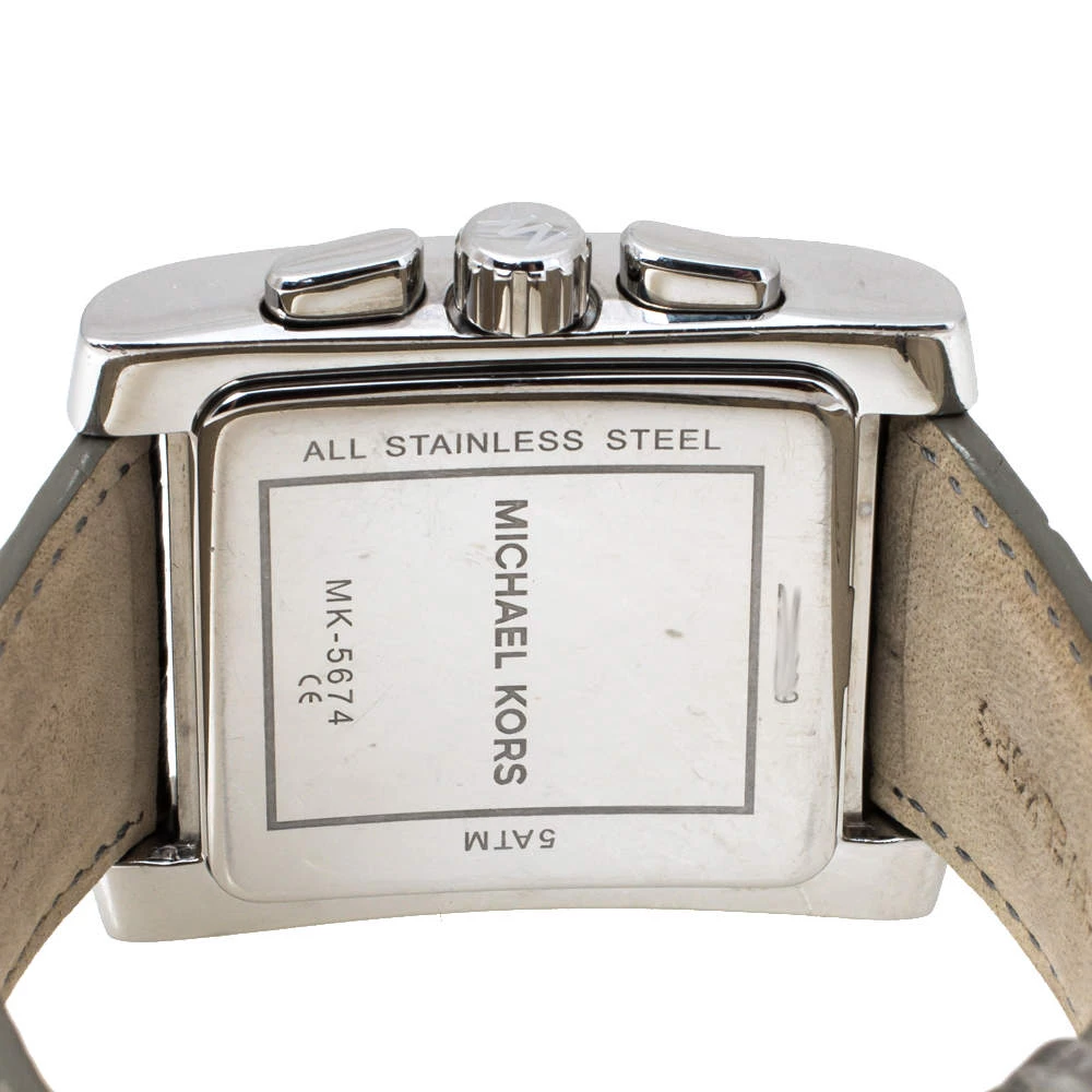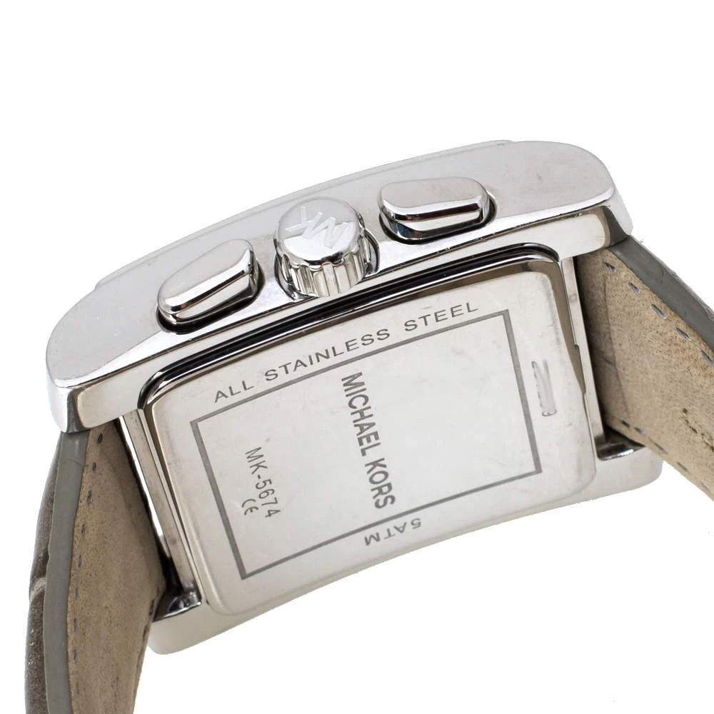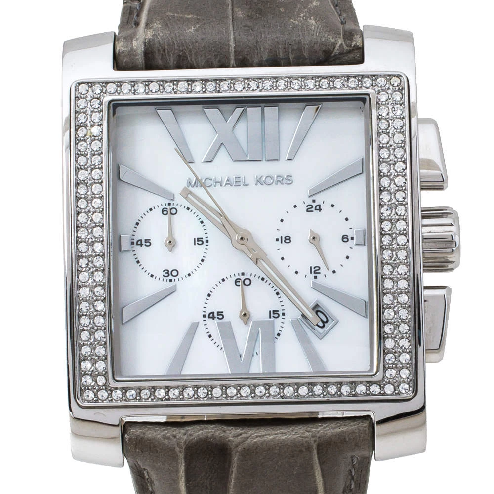 Captivating design with an alluring charm makes this Michael Kors Uptown Glam Gia MK5674 watch an amazing accessory. Crafted from stainless steel, it comes with a case diameter of 37 mm and features a bezel that is encrusted with crystals. The square dial boasts of baton hour markers with Roman numerals at six and twelve, three subdials, and a date window between the four and five o’clock positions. This Quartz/ Chronograph watch is equipped with a water resistance of 50 meters and is held by croc-embossed leather straps with buckle closure.