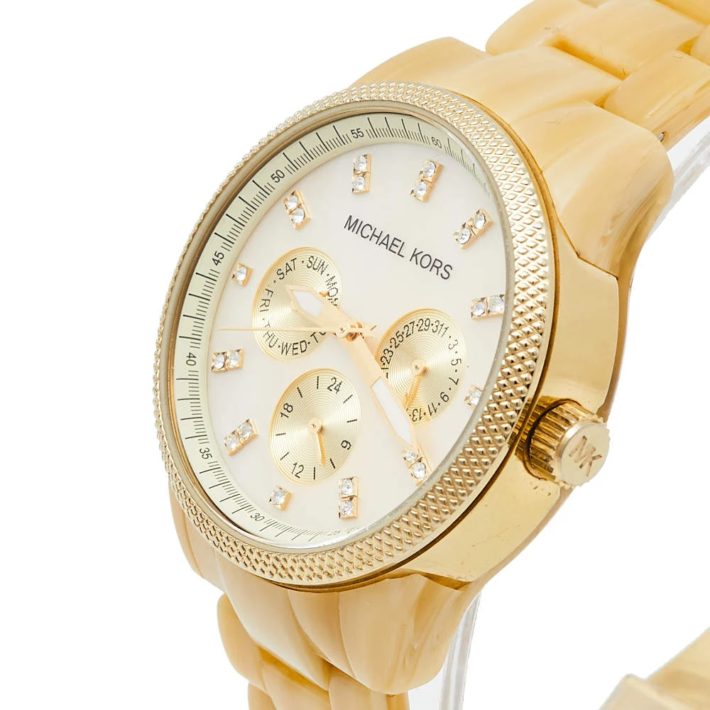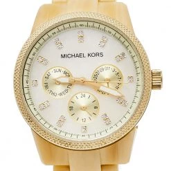 Designed with a textured bezel, this Michael Kors Jet Set MK5039 wristwatch knows how to charm its way to your esteemed collection of elegant timepieces. The sophisticated gold-tone stainless steel and horn resin case of this quartz watch is detailed with a mother of pearl dial that flaunts crystal-studded hour markers, three hands, and three subdials for the chronograph function. The horn resin and gold-tone stainless steel bracelet is secured using a push-button deployment clasp and the watch is equipped with a water resistance of 100 meters. (Note: The item may be restricted for shipping outside the UAE. Please contact us on [email protected] to check if the item can be shipped to your country.)