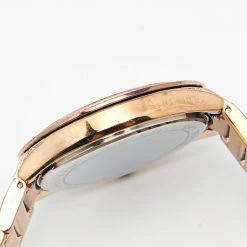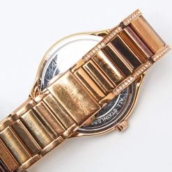 Beautified with crystals, this wristwatch from Michael Kors promises enduring function in an alluring manner. Made from rose gold-plated stainless steel, the case features a mother of pearl black dial fitted with a floral pattern and three hands.