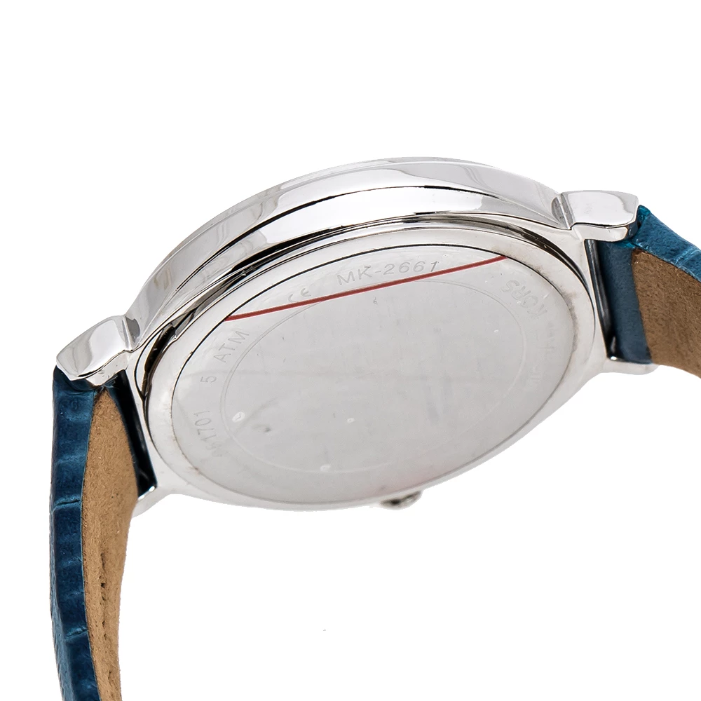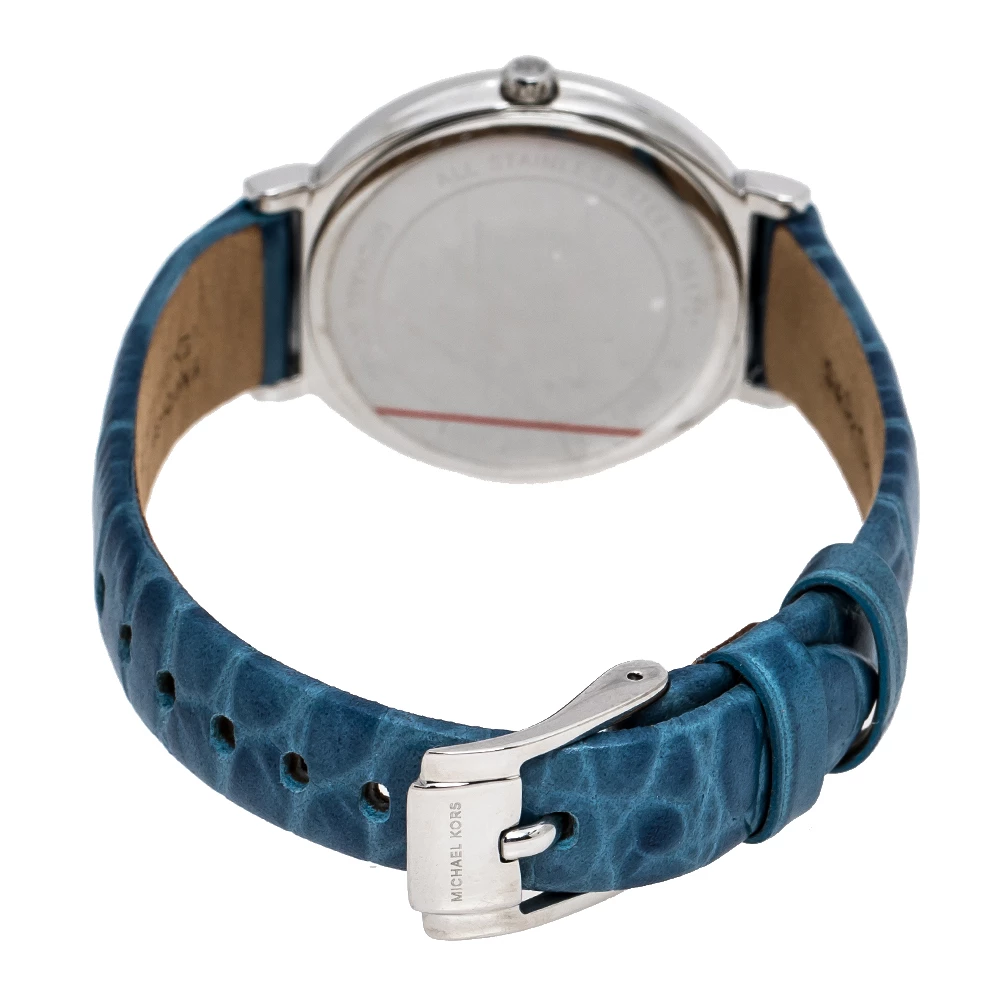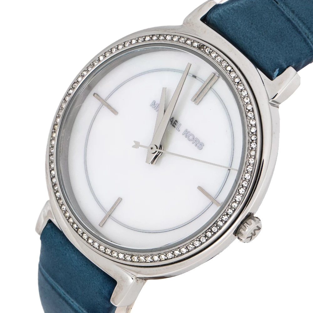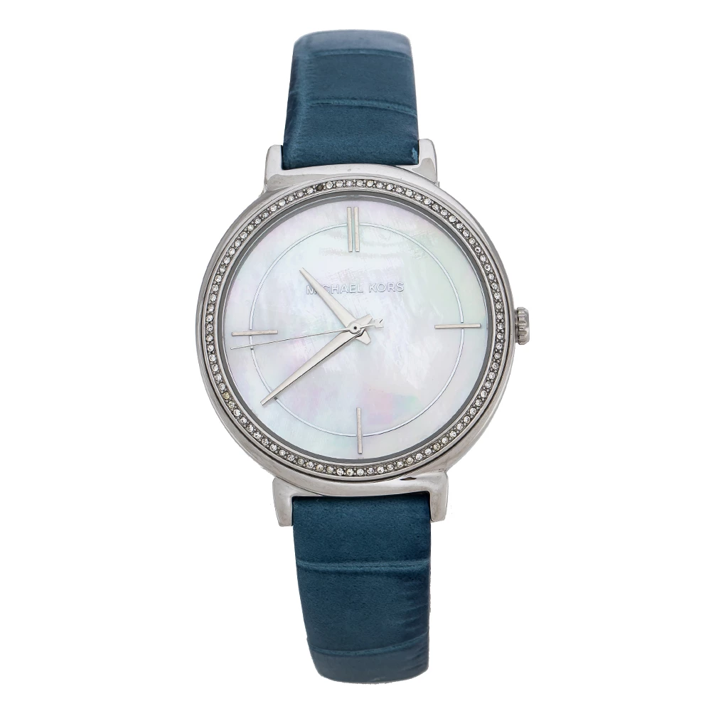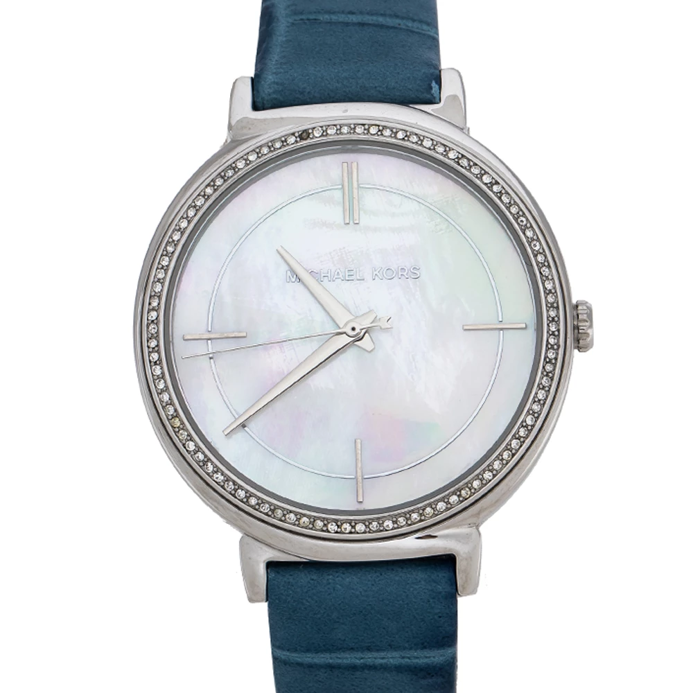 Studded with glittering crystals on the bezel, this Michael Kors Cinthia wristwatch knows how to charm its way into expanding your collection of elegant timepieces. The sophisticated stainless steel body of this quartz watch is detailed with a mother of pearl dial and is complete with an easy-to-wear embossed leather bracelet.