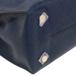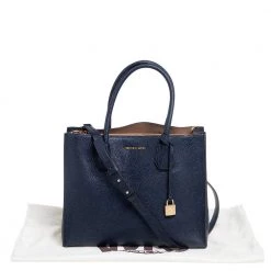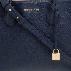 Featuring a chic and fabulous style, this Michael Kors tote is a modern choice. Crafted from grained leather in a stunning navy blue, the tote features dual handles, a shoulder strap, and a padlock charm. It opens to a leather-fabric interior divided by a zipped compartment