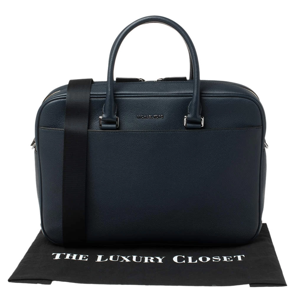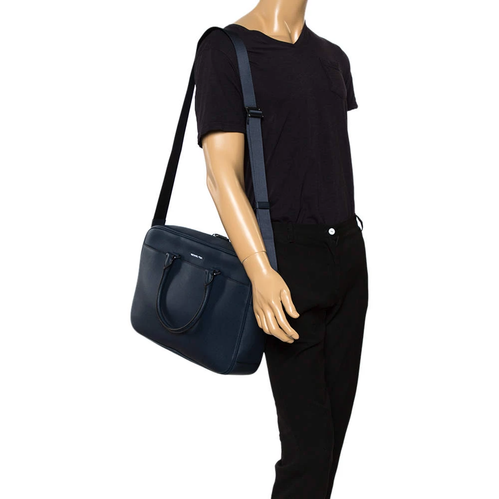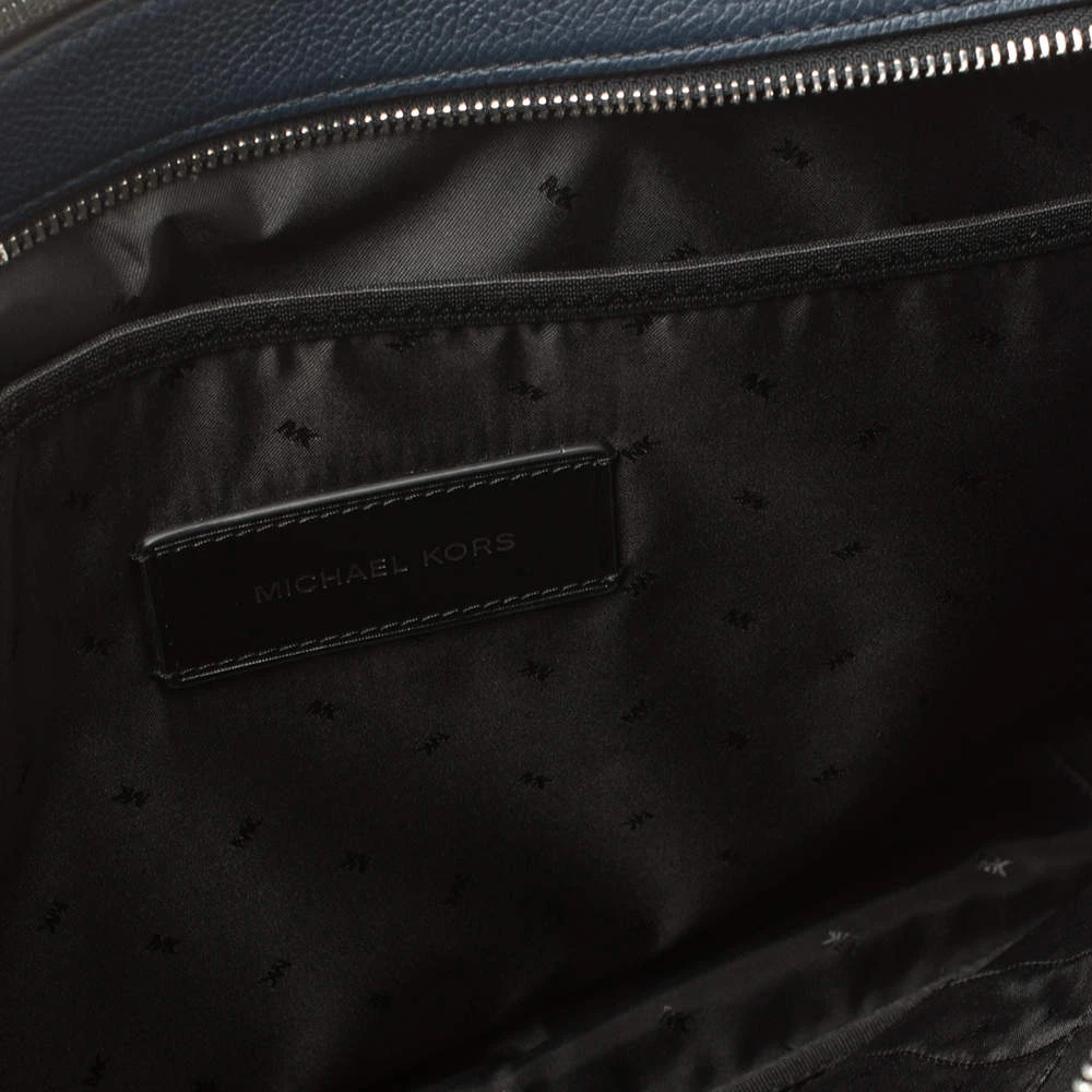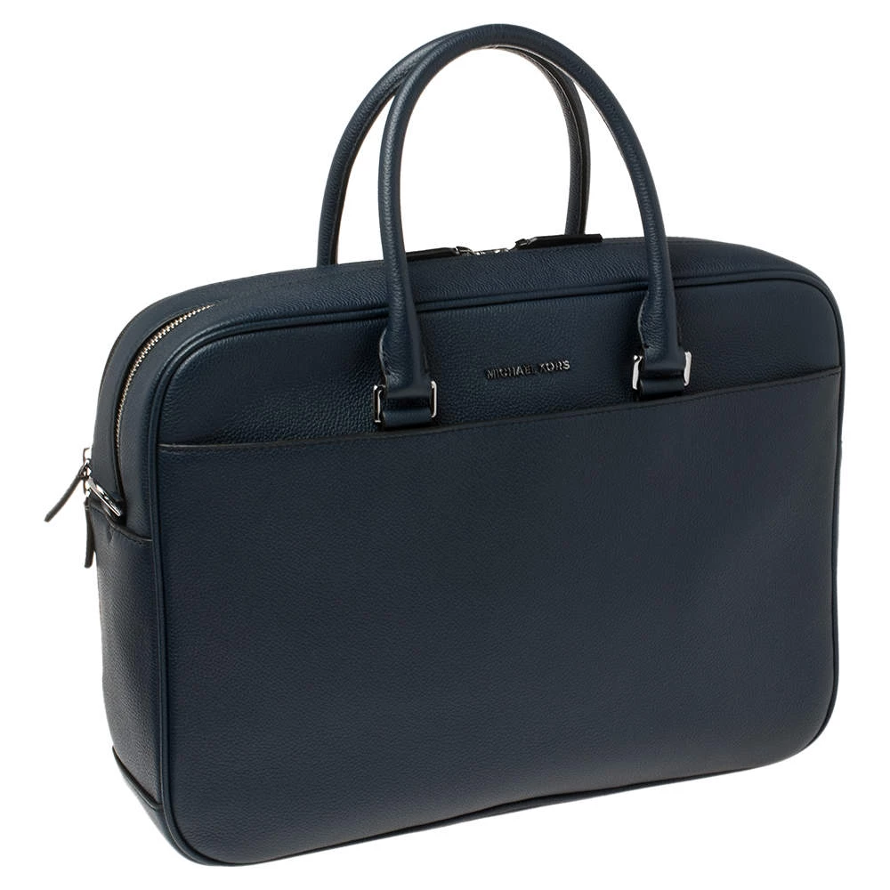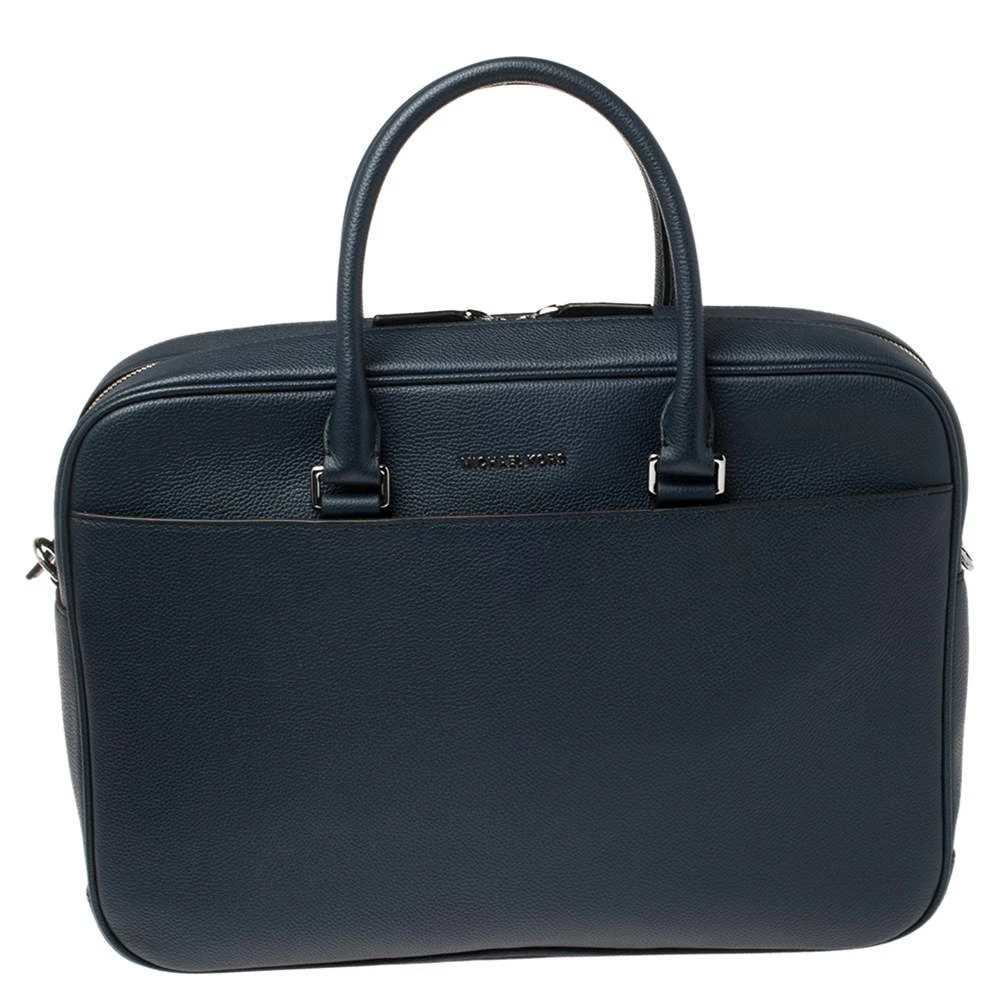 Designed in navy blue leather, featuring a slip pocket at the front, this multi-functionality briefcase from Michael Kors is smart and stylish. The zip fastenings on the top open to a nylon-lined interior that is equipped with a slip pocket and the brand label. This subtle creation is complete with dual top handles.