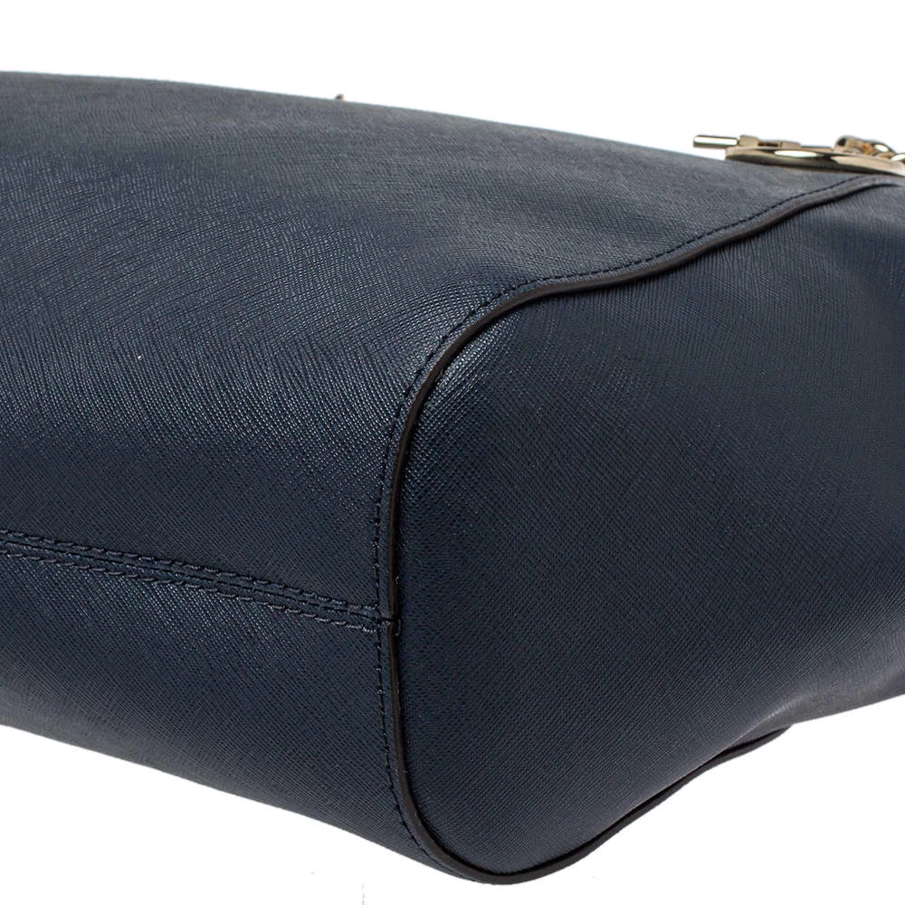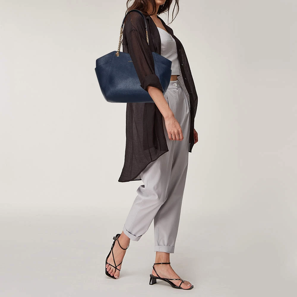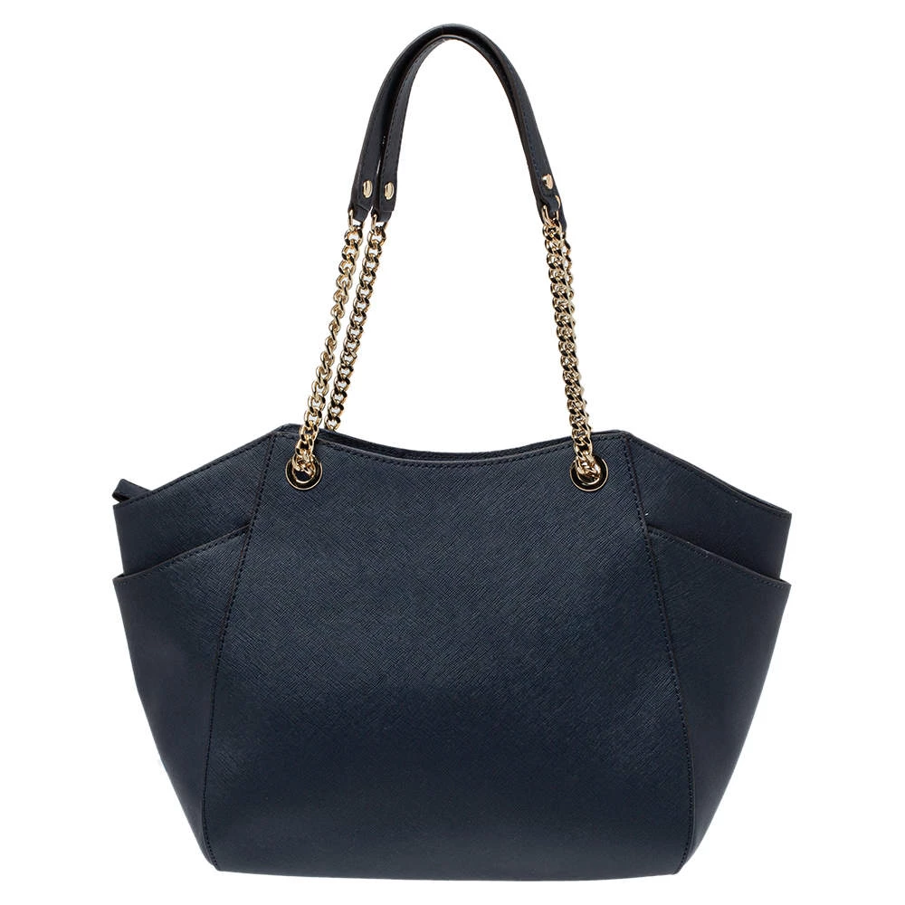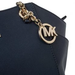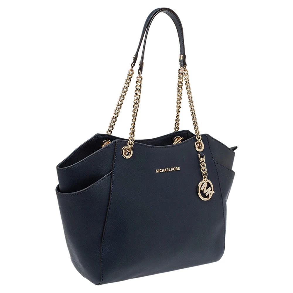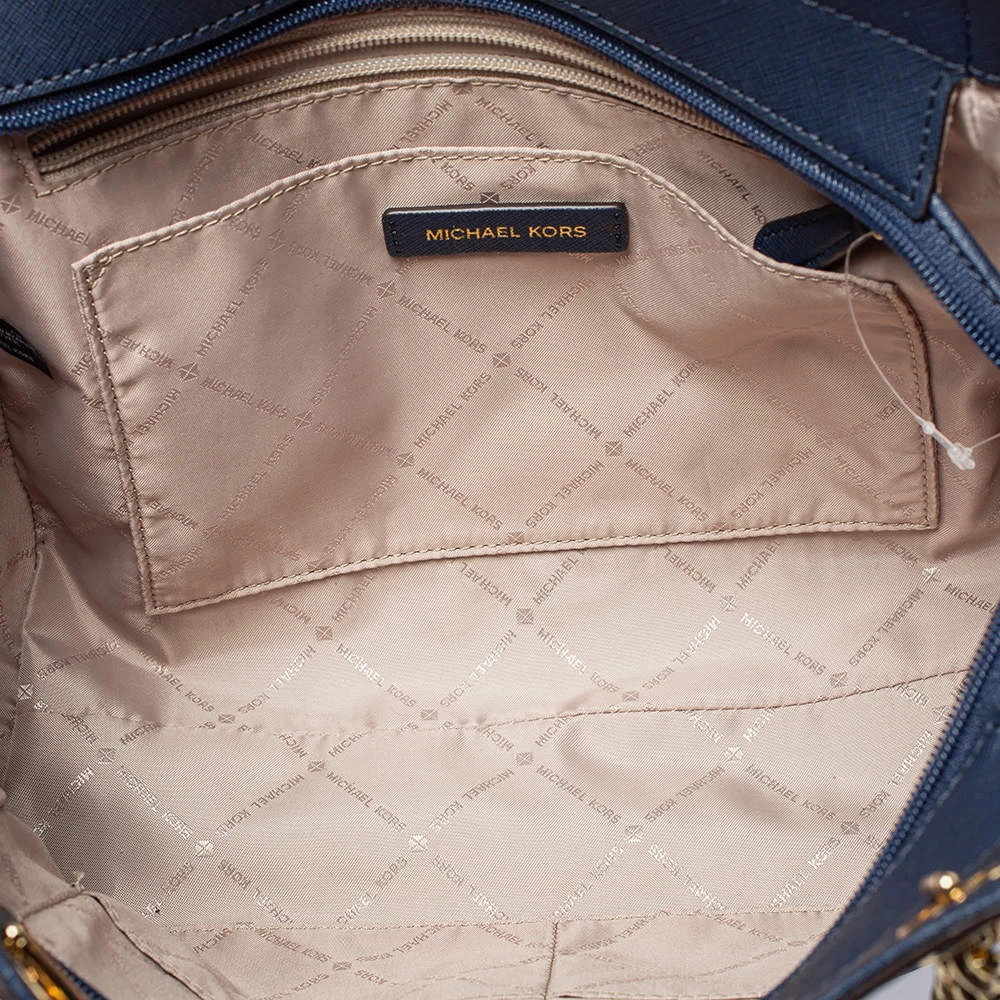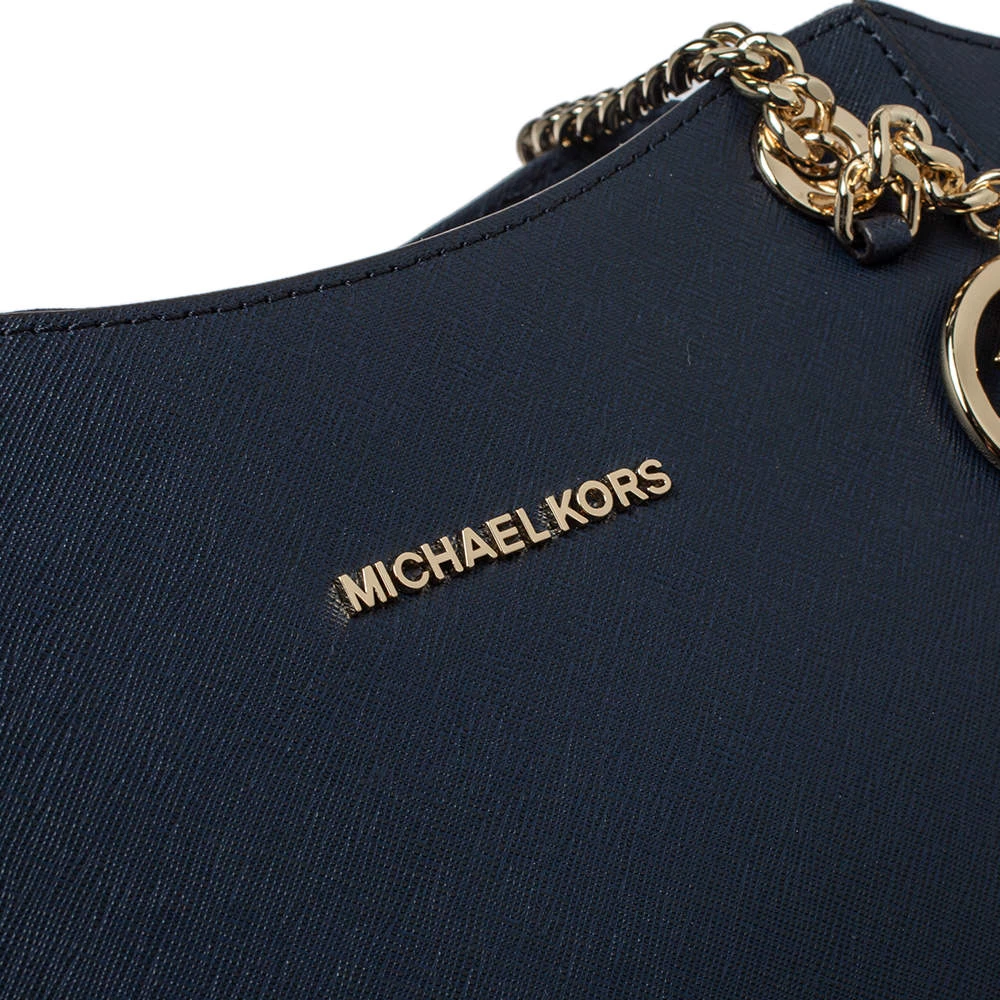 Timelessly elegant and stylish, Michael Kors’s collections capture the effortless, nonchalant finesse of the modern woman. Crafted from leather in a navy blue hue, this chic Jet Set Travel tote features a spacious interior with a top zip fastening. The sleek, understated silhouette is punctuated with dual chain-leather handles and an MK medallion.