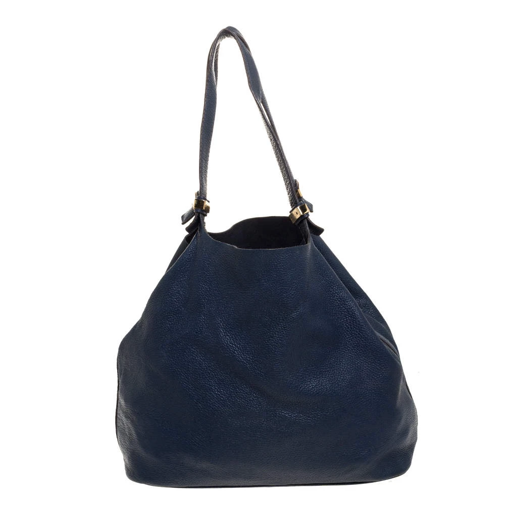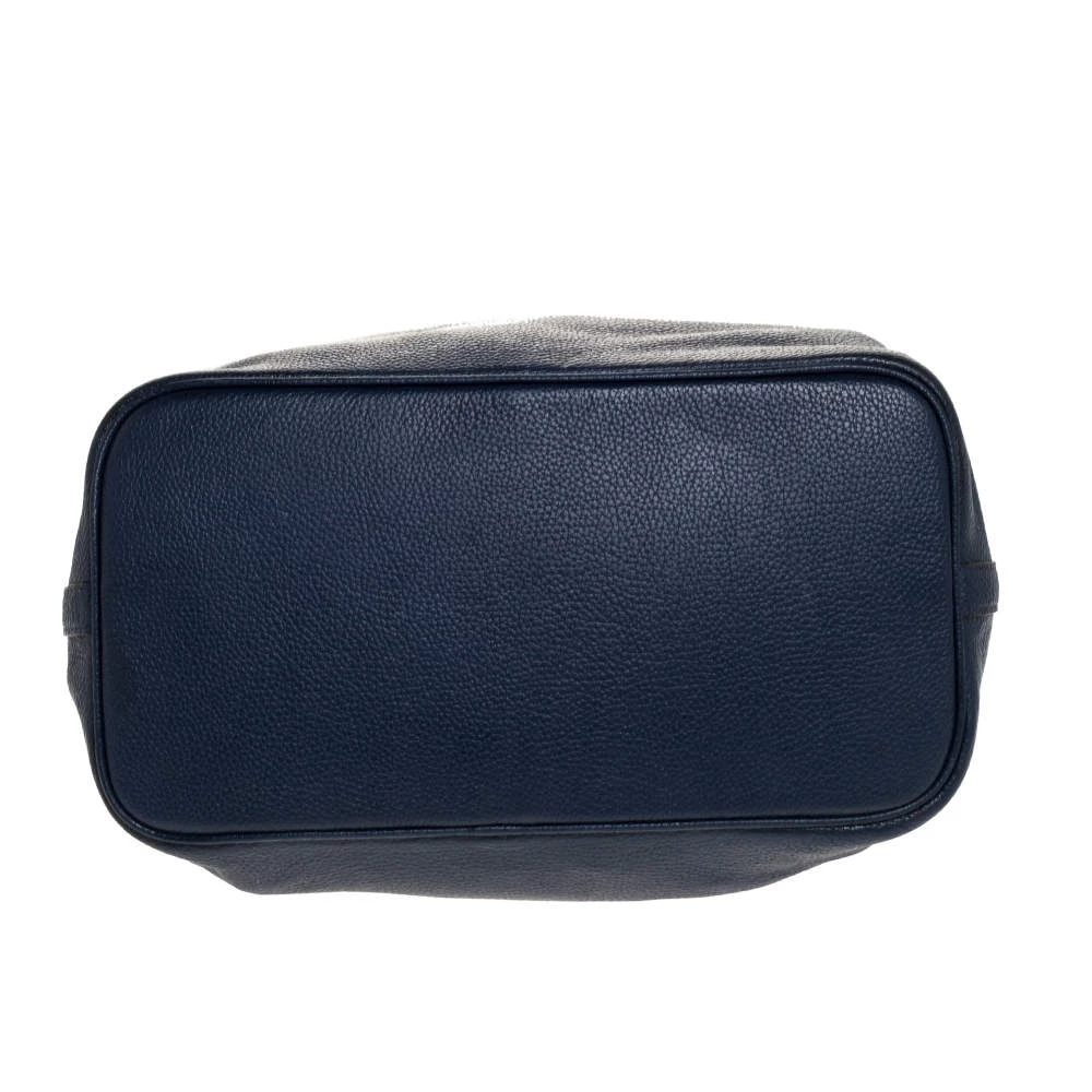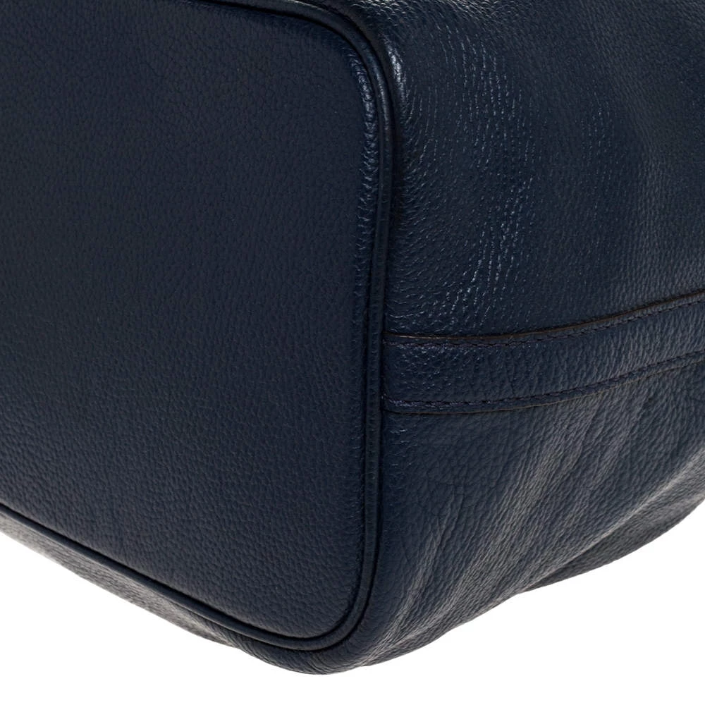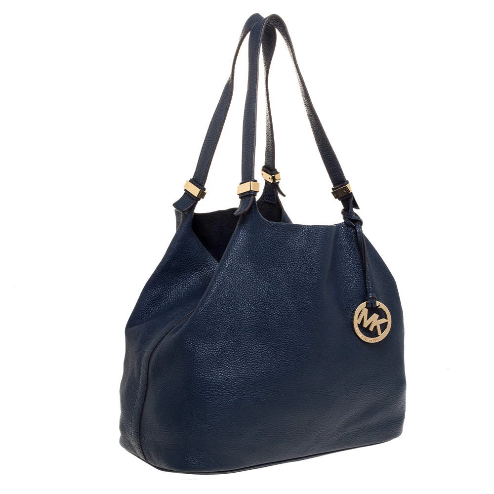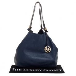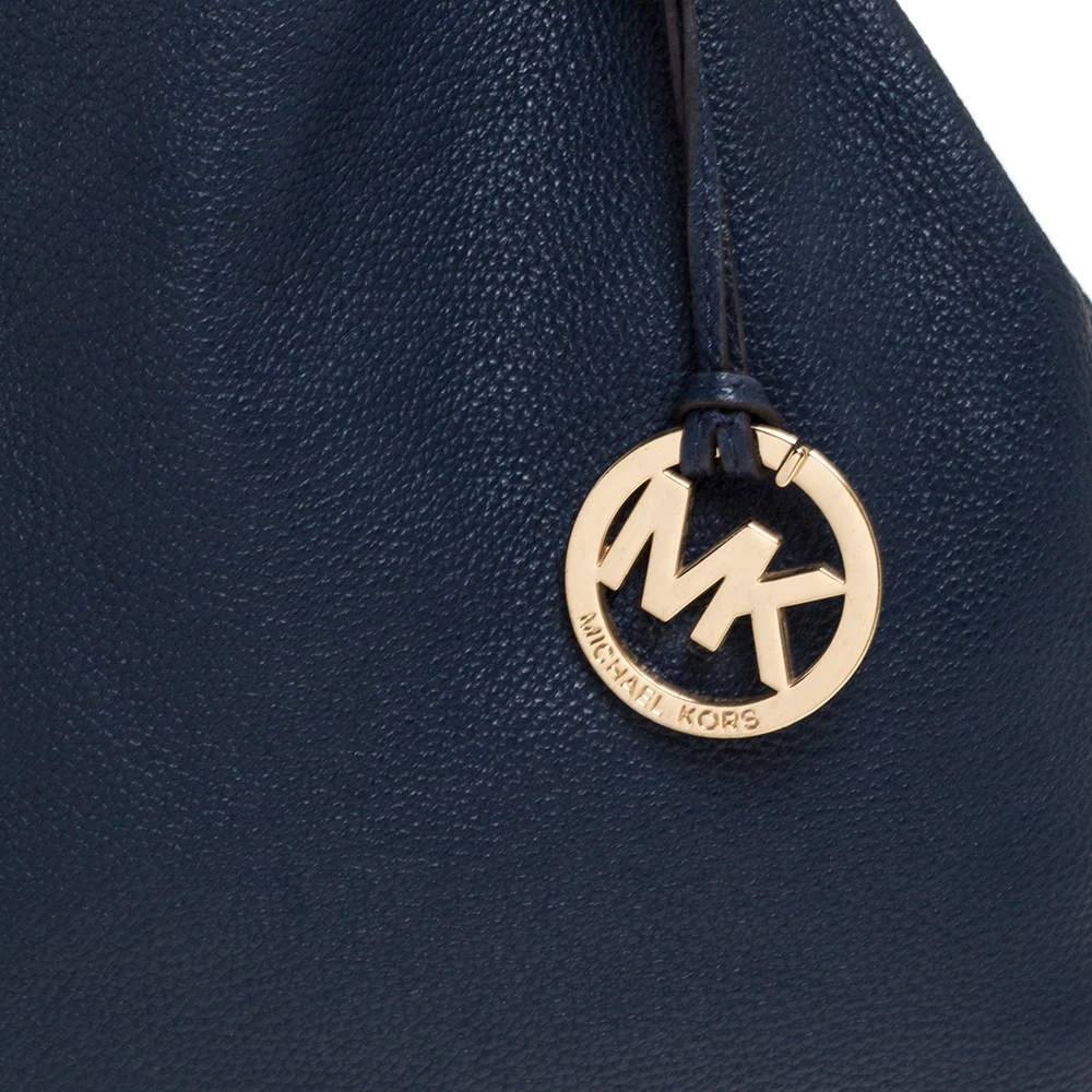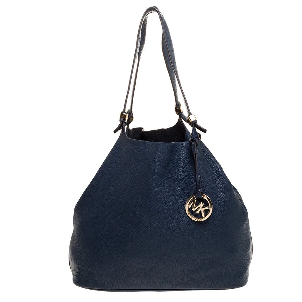A simple shape in navy blue, this Michael Kors bag is a must-have. It is crafted from leather and designed with shoulder handles, a spacious interior and the signature MK charm at the front.