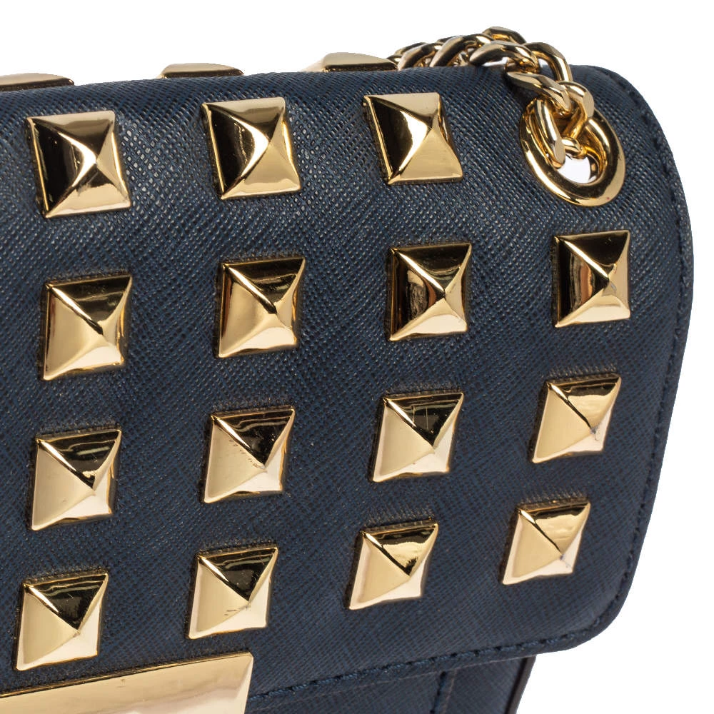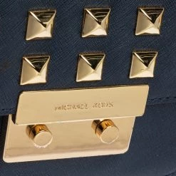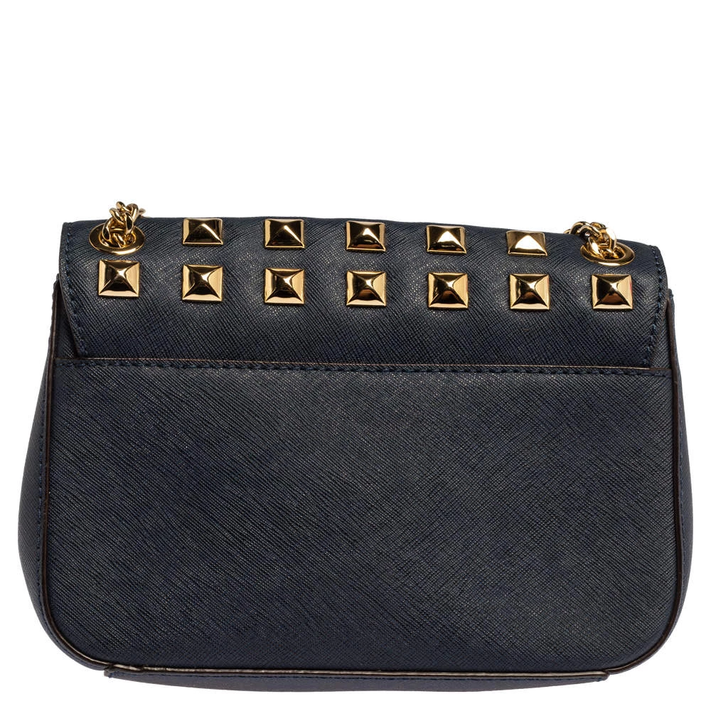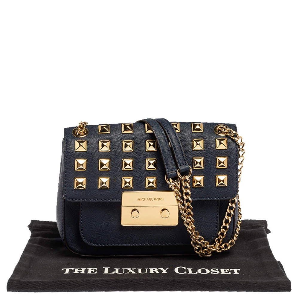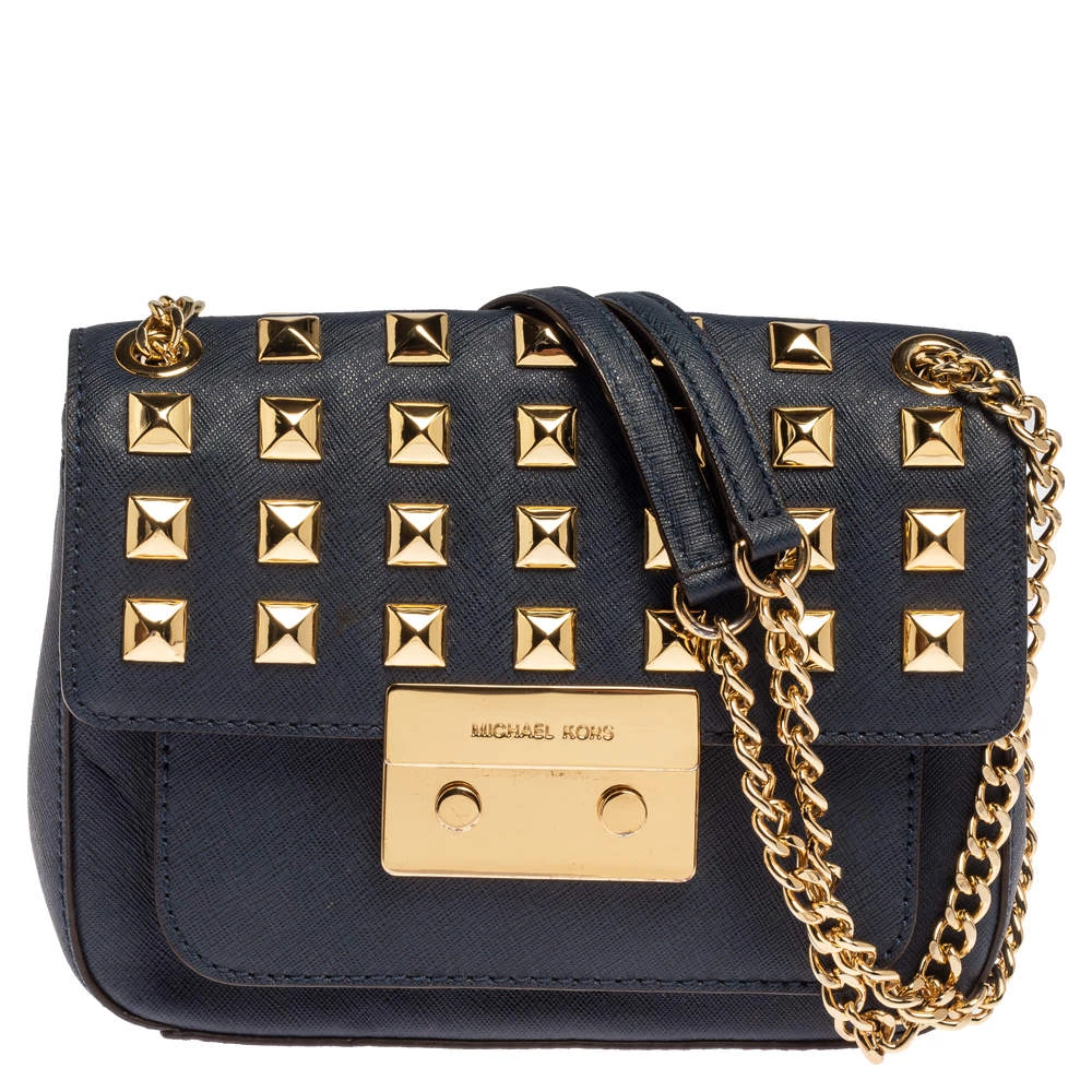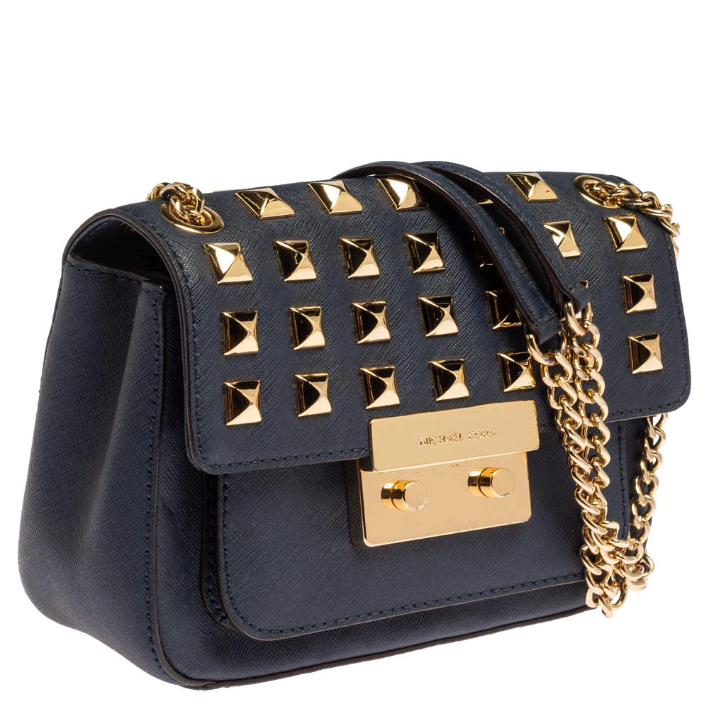 Elevate your style with this gorgeous Sloan shoulder bag by Michael Kors. Crafted from navy blue leather, the bag features studs in gold-tone hardware. It has a flap closure and a nylon-lined interior. This beauty is complete with a chain link.