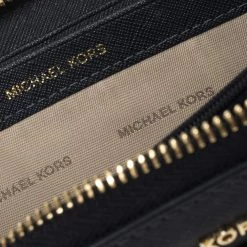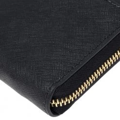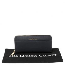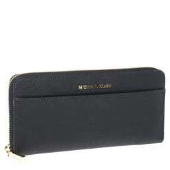 Showcasing an exclusive design from Michael Kors, this wallet makes for a convenient accessory. The navy blue creation is crafted from leather and a gold-tone brand logo is detailed on the front while the zip closure introduces you to a nylon and leather interior that houses multiple card slots and a zipper pocket.